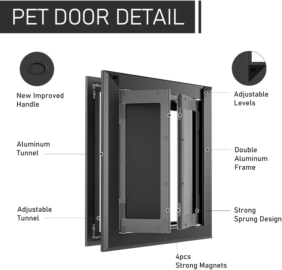 About this item 【STURDY & ENERGY-SAVING】 PATAPLUS Dog Doors are made of strong Aluminum Additionally, they feature Double slide-in locking panels to provide better protection for your home against extreme weather conditions and to reduce energy loss. 【Large DOG DOOR】 Dog Door For Dogs Frame Size is 17''(W) x 21 1/3''(H), Flap Opening is 131/2 ”(W) x 18''(H). It Fits Paneled, Wood, PVC, And Metal Doors 11/4 '' - 2 1/2'' Thick, And is Designed For Oets Up to 110 Pounds. 【FREEDOM & INDEPENDENCE 】The Aluminum frame of Aluminum material is designed with a backplate, solid magnets, and magnetic flaps that allow your dogs to enjoy free entry and exit, potty breaks, and playtime without your help. Easily prevent any unwanted guests from entering. EASY INSTALLATION PATAPLUS 】pet door is easily installed on all types of doors. A cut-out template and step-by-step instructions are included, providing simple-to-follow guidance throughout the installation process. 【QUALITY ASSURANCE】PAPTPLUS dog door includes cutting template, detailed instructions, installation hardware.Easy to Install.If you have any questions about dog doors, please contact us in time. › See more product details