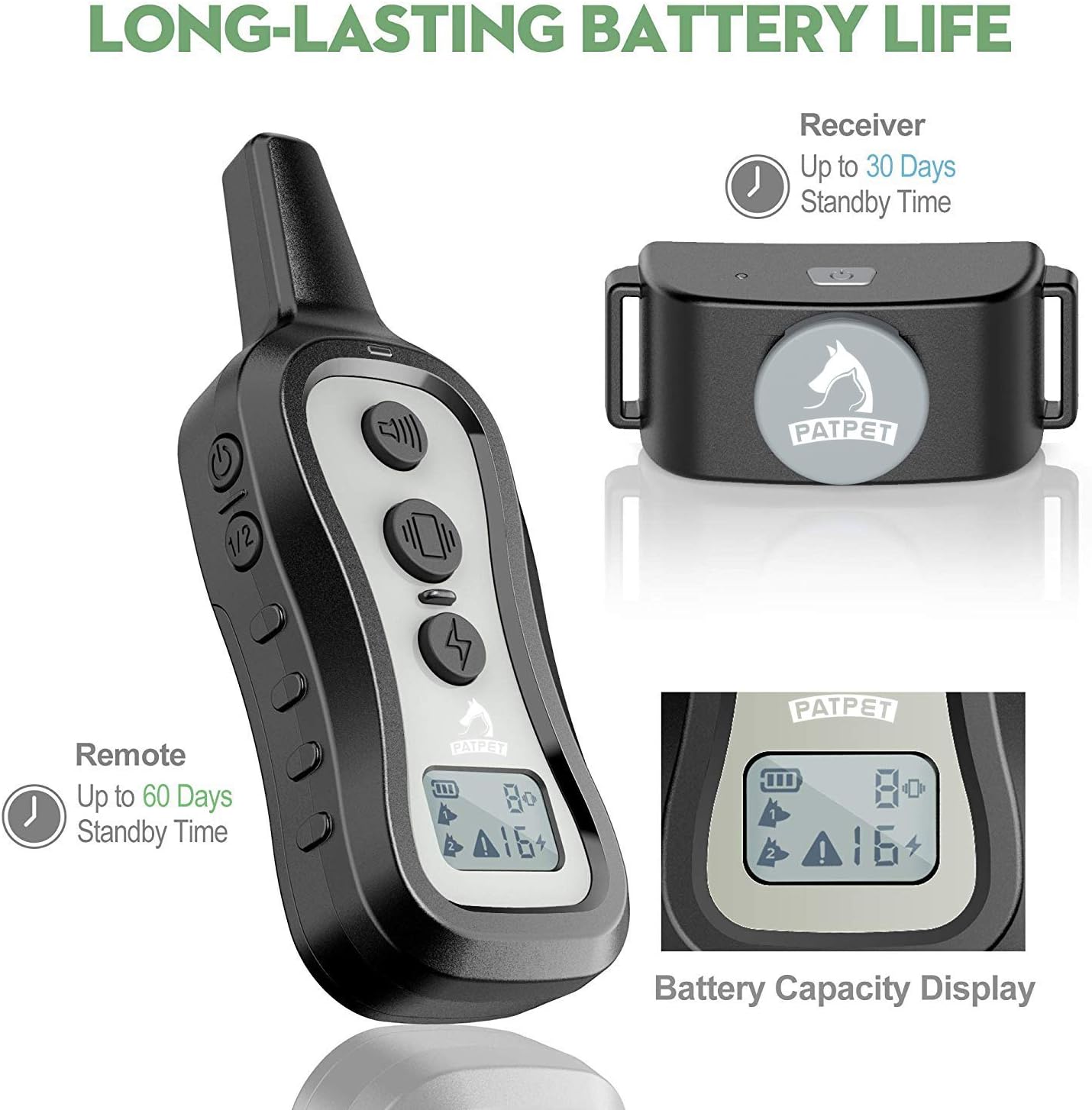 About this item 3 training modes and 2 channels. This dog electric collar provides beep, vibration(levels 1-8), and shock(levels 1-16). You can operate 2 collars with the same remote and switch easily between dogs Suitable for different size dogs: The nylon collar belt is adjustable, and the training collar is suitable for dogs from 15 lbs-100 lbs. Note: Not suitable for extra small dogs (5-10 lbs) 1000Ft range and not rechargeable: Both receiver collar and remote control are not rechargeable. And you can freely train your dog in the yard or at home, the shock collar is convenient and easy to operate Rainproof receiver: The receiver collar is IP67 waterproof, your dogs can be free to play and run in the rain Humanized design: The on-off button of the training collar for dogs is more like a safety lock and can be closed. After training, the lock button can prevent misoperation › See more product details