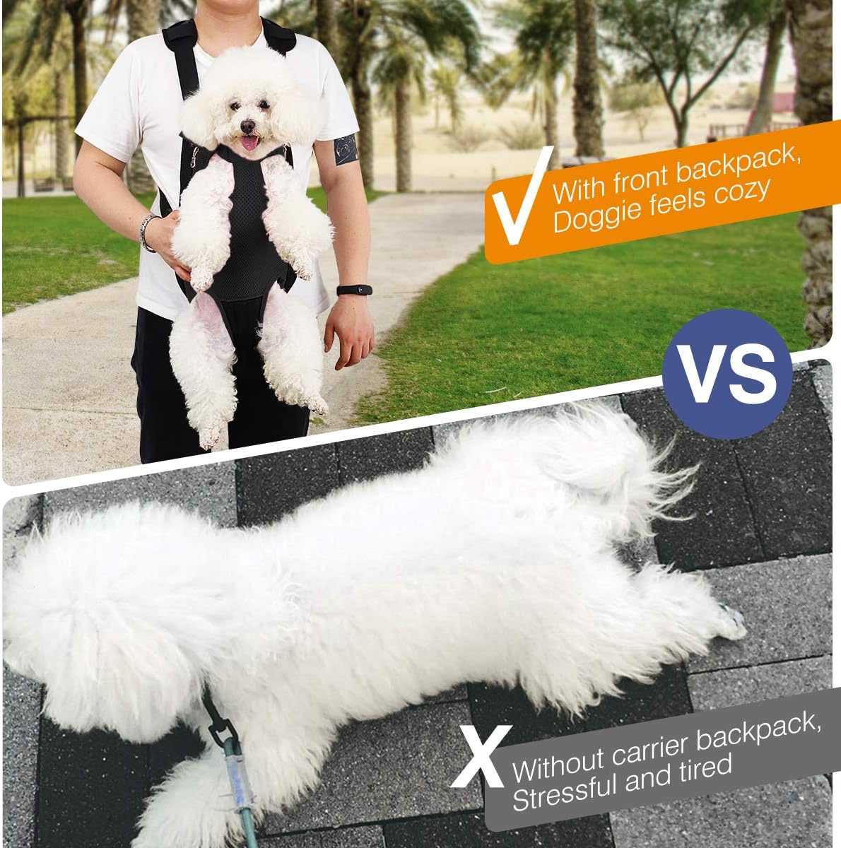About this item Small Dog Carrier: Dog carrier backpack is designed for carrying small dogs/cats. Please DO measure your pet's size and weight before purchasing, and choose the right size pet backpack according to the size chart. Considerate Detail-oriented Design: Legs-out and tail-out design keep your pet safe and comfortable; Hook and loop, zipper and elastic openings allow you to fit your dog inside comfortably; Quick Release Buckles on the end of straps ensure quick installation with just one hand. About Size: Pawaboo concerned about how to choose the corresponding size for different breeds and sizes of pets, please give priority to confirming the distance between the BACK LENGTH and CHEST GIRTH of the pet before purchase; if you have any questions about choosing the size, please contact us first. Two Ways of Wearing: A hands-free pet carrier can be worn on your front side or your backside if you like, it keeps you closer and increases pet's sense of security when you carry your cat or dog around. Meanwhile, the thickened sponge pad helps to relieve the burden of your shoulder. Enjoy Trips with Your Pet: This backpack carrier is lightweight and portable, you can use it to carry small dogs or cats for biking, hiking, camping, out walking or meeting friends. It allows owners and their lovely pets to have more adventures together, what's more, it's also a great photo prop to take funny pictures for daily sharing. › See more product details
