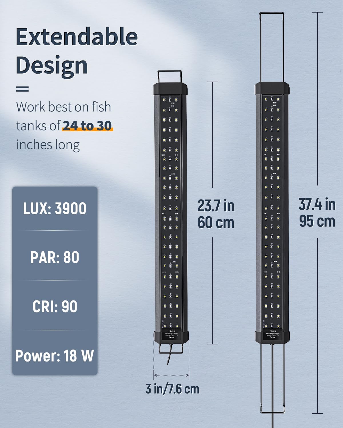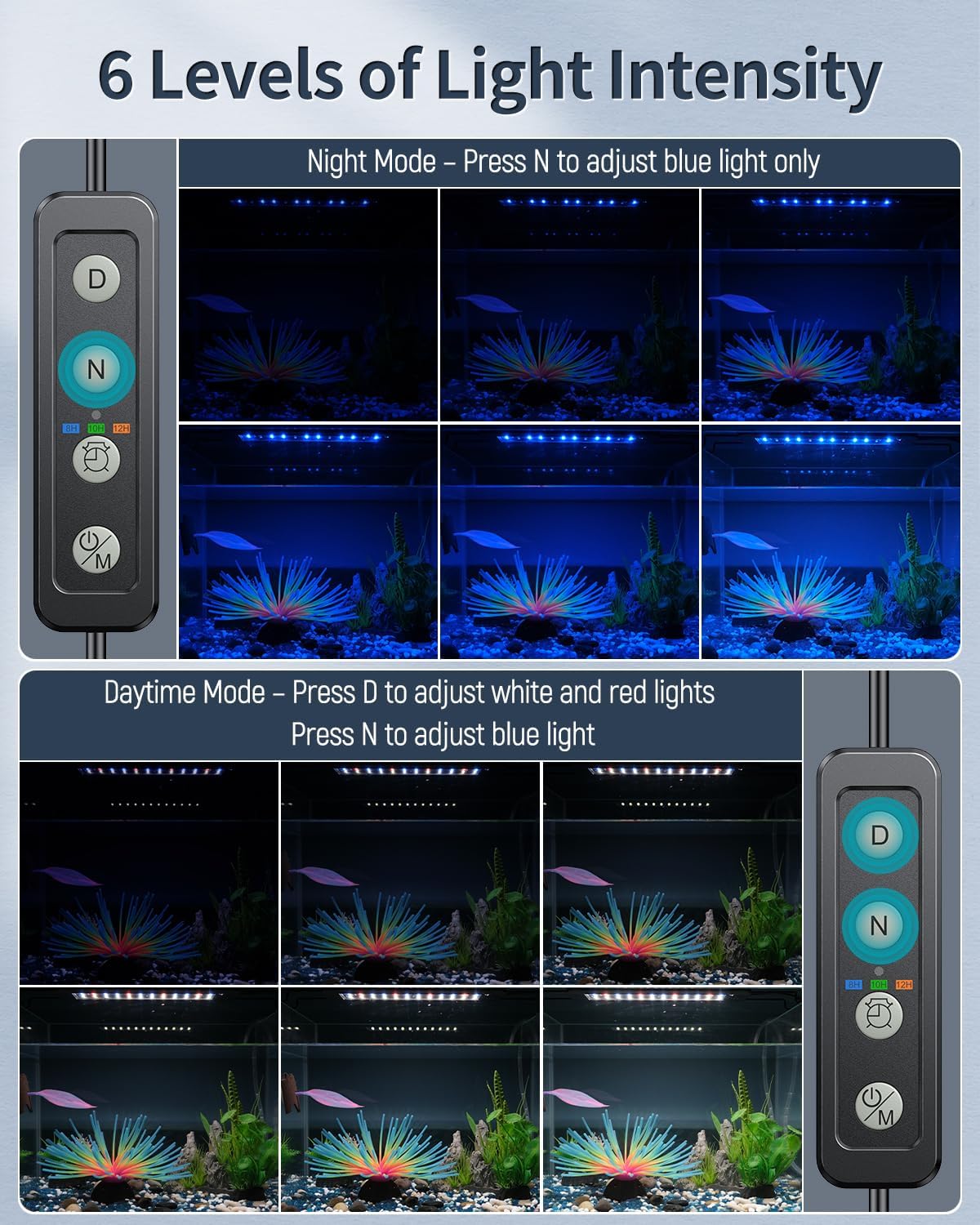 About this item Full Spectrum: The fish tank light contains 6500 K white light, 450 nm blue light and 660 nm red light. LUX: 2500; PAR: 55; CRI: 90. The vivid lights can reproduce the real colors of objects to relieve the visual fatigue, and thus improve the comfort of the environment. 2 Lighting Modes: Short press the M button repeatedly on the fish tank light to switch between daytime and night modes. Hold the M button for 3 seconds to turn all lights off. Simulate natural sunrise and sunset to energize your fish and give them a sound sleep. 6 Intensity Levels: Daytime Mode (all lights are on): Press the D button to control the brightness of white and red lights and press the N button to control that of the blue light. Night Mode (only blue light is on): Press the N button to adjust the luminance. Auto On/Off: With a built- in timer, the submersible aquarium tube light provides 3 optional lighting durations: 8 h, 10 h and 12 h (Only work during the first 8, 10 or 12 hours within 24 hours). Perfect for creating a natural environment. For 24" to 30" Tanks: With an extendable bracket (min length: up to 24"; max length: up to 38"), the LED aquarium light always stays steady on the fish tank. Work best on tanks of 24 to 30 inches long. › See more product details