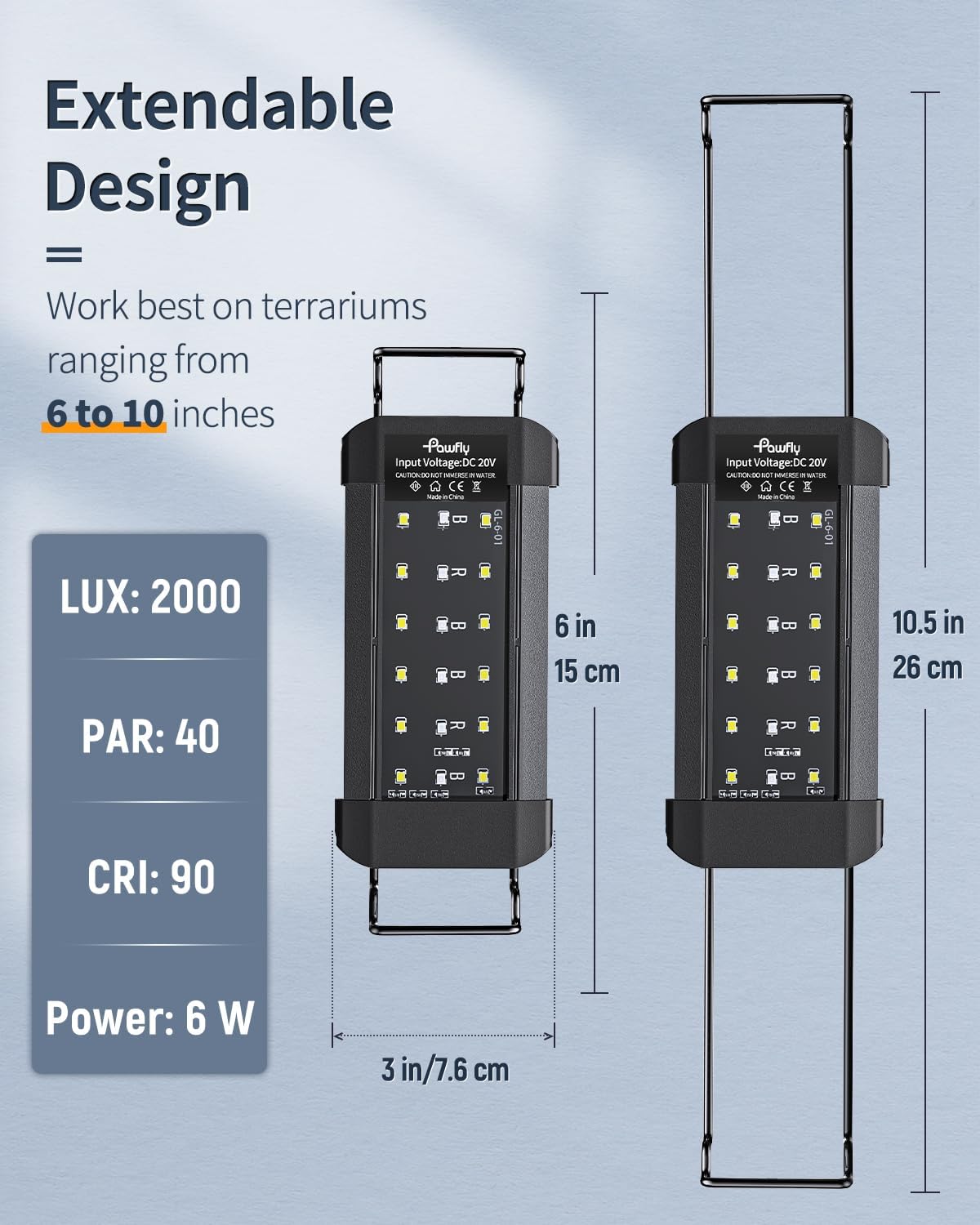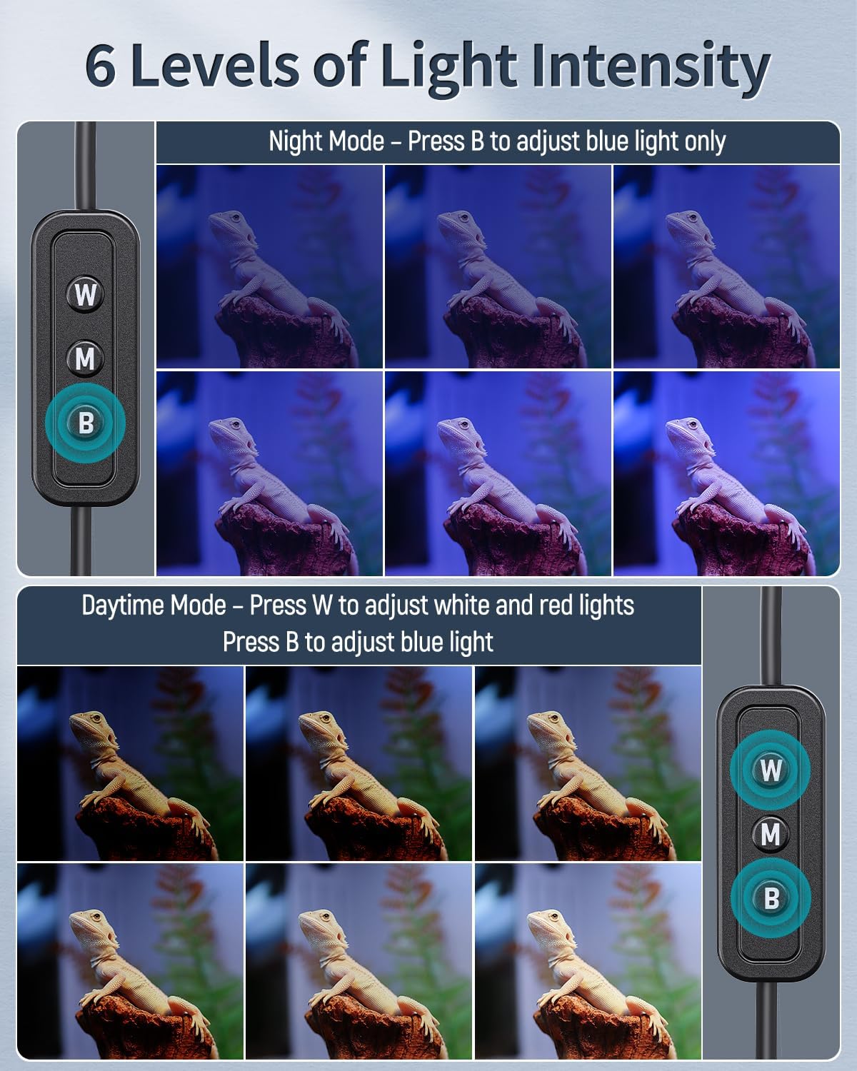 About this item Full Spectrum: The terrarium light contains 6500 K white light, 450 nm blue light and 660 nm red light. LUX: 2000; PAR: 40; CRI: 90. Vivid lights reproduce the real colors of objects to relieve visual fatigue and thus boost the comfort of the environment 6 Intensity Levels: Daytime Mode (all lights are on): Press the B button to control the brightness of the blue light and press the W button to control that of all other lights. Night Mode (only blue light is on): Press the B button to adjust the luminance 2 Lighting Modes: Short press the M button repeatedly to switch between daytime and night modes. Hold the M button for 3 seconds to turn all lights off. Simulate natural sunrise and sunset to energize your reptiles and give them a sound sleep For 6" to 10" Terrariums: With an extendable bracket (min length: up to 6"; max length: up to 10.5"), the reptile LED light always stays steady on the tank. Work best on reptile tanks of 6 to 10 inches long Heavy-duty Design: FCC-certified reptile tank light. Strictly sealed with silicone, the clear board makes it damp-proof. Solid aluminum shell accelerates heat dissipation. Long-lasting bulbs and an ETL-certified adapter ensure safe and continuous lighting › See more product details