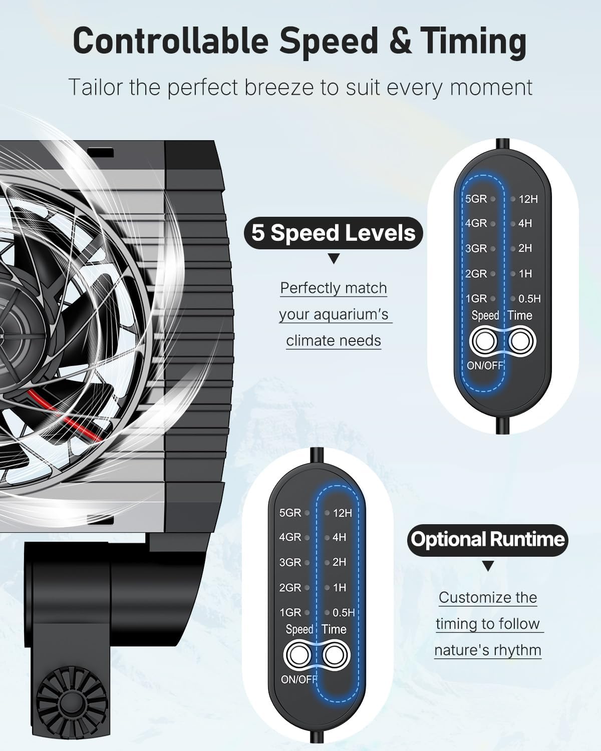 Easy Installation: Well-made with heavy-duty brackets and 2 strong screws for stability. The aquarium fan can be firmly mounted on the fish tank. Perfect for freshwater and saltwater tanks with a glass thickness less than 0.6 inches (for lipless aquariums) Powerful Wind: With 7 robust blades, the quiet aquarium fan provides strong wind continuously. Effectively accelerate heat dissipation and reduce tank temperature by 2 °C to 4 °C. Great for keeping your aquatic pets cool and comfortable all year round Controllable Wind Speed: 5 levels of wind speed available! The fish tank cooling fan can be flexibly adjusted for the most suitable wind speed. Always prepare the most pleasant wind for distinct aquatic life in different seasons Timing Function: With a convenient timer on the controller, the aquarium chiller is expected to work for 0.5 h, 1 h, 2 h, 4 h or 12 h. Manually customize the working hours as you like based on wind speeds and aquarium temperatures Adjustable Wind Direction: A cinch to change the wind direction by adjusting the angle between the fan head and the brackets. 180° adjustable wide angle directs a comfortable airflow exactly where it's needed. Greatly meet your cooling needs › See more product details