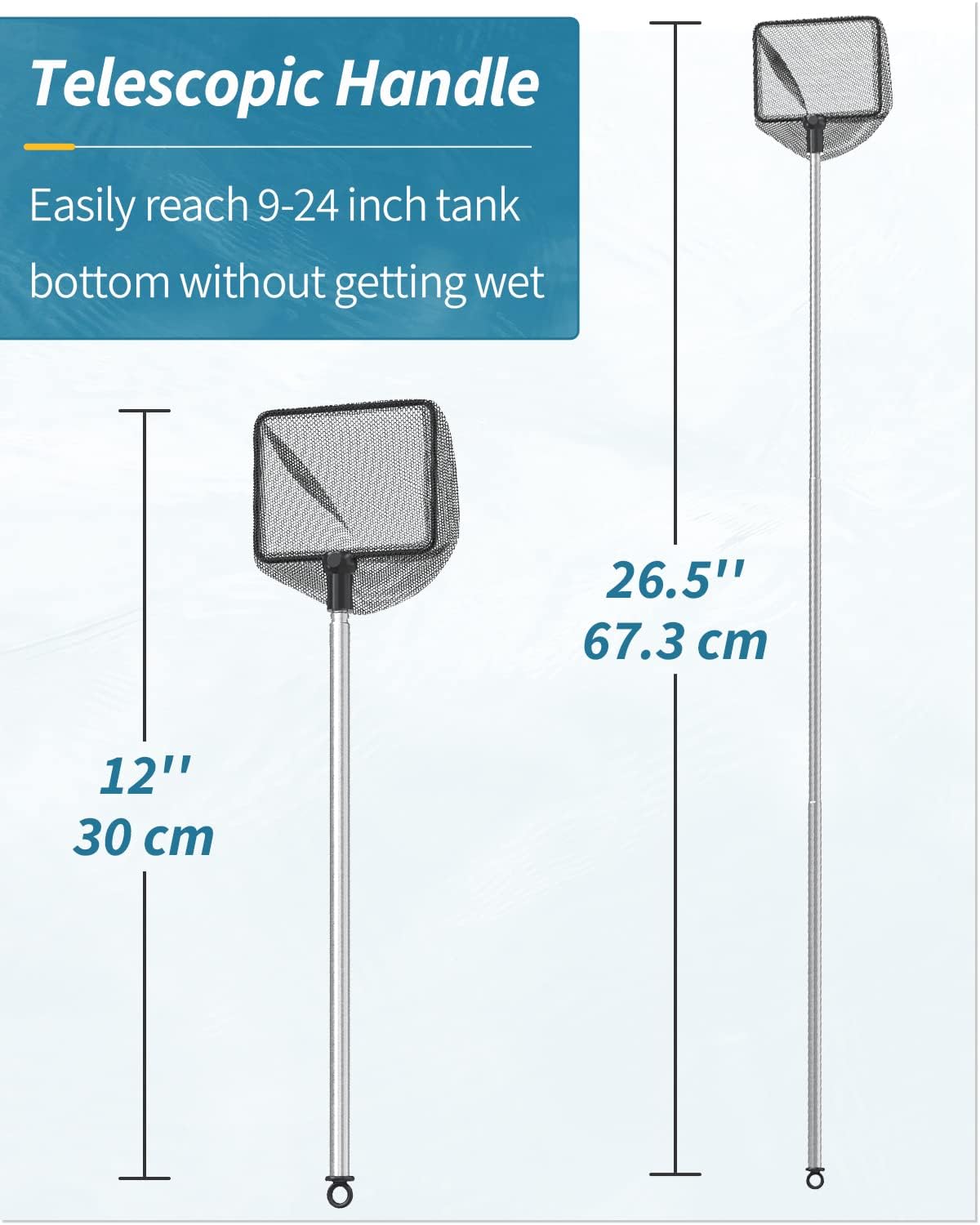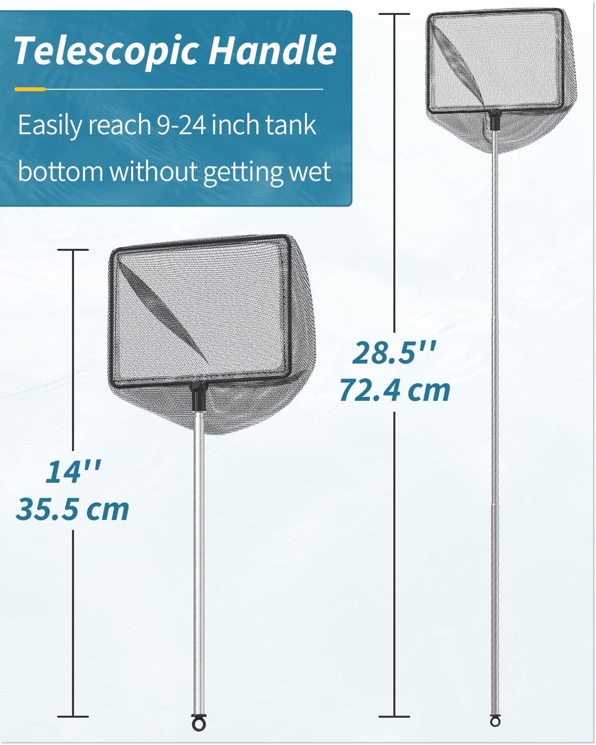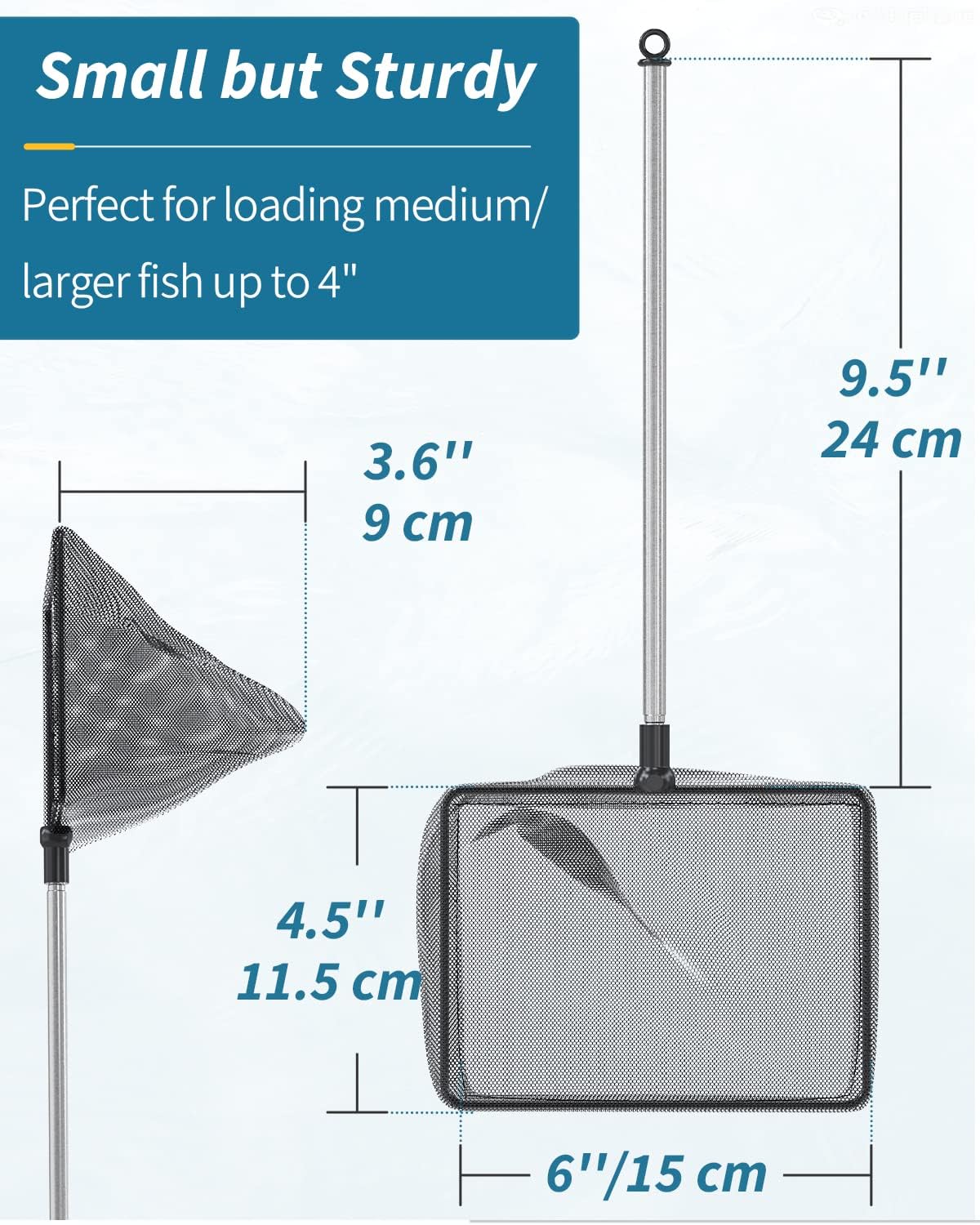 About this item 6 Inch Fish Net: Measures 6" L x 4.5" W with a pocket depth of 3.6 inches. Its solid frame ensures strong bearing capacity. Perfect for loading medium/larger fish up to 4 inches. Fine Nylon Mesh: The well-woven soft nylon mesh reduces the risk of injuries to delicate fish during transfer. Especially suitable for betta, goldfish, angelfish, cichlids, etc. Telescopic Handle: The solid stainless steel handle won’t get rust or bent. It can extend up to 24". Easily reach the bottom of tanks up to 9-24 inches deep without wetting your hands. For Versatile Use: Perfect net to securely catch or transfer your fish. Also excellent for skimming debris, wastes or leaves from aquariums, small ponds or pools to keep them clean. Easy to Store: Designed with a hole at its end. Simply clean the mesh, dry the handle and hang it through the hole in a cool and ventilated place after use. › See more product details