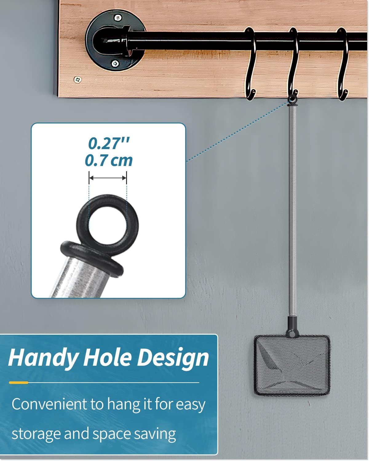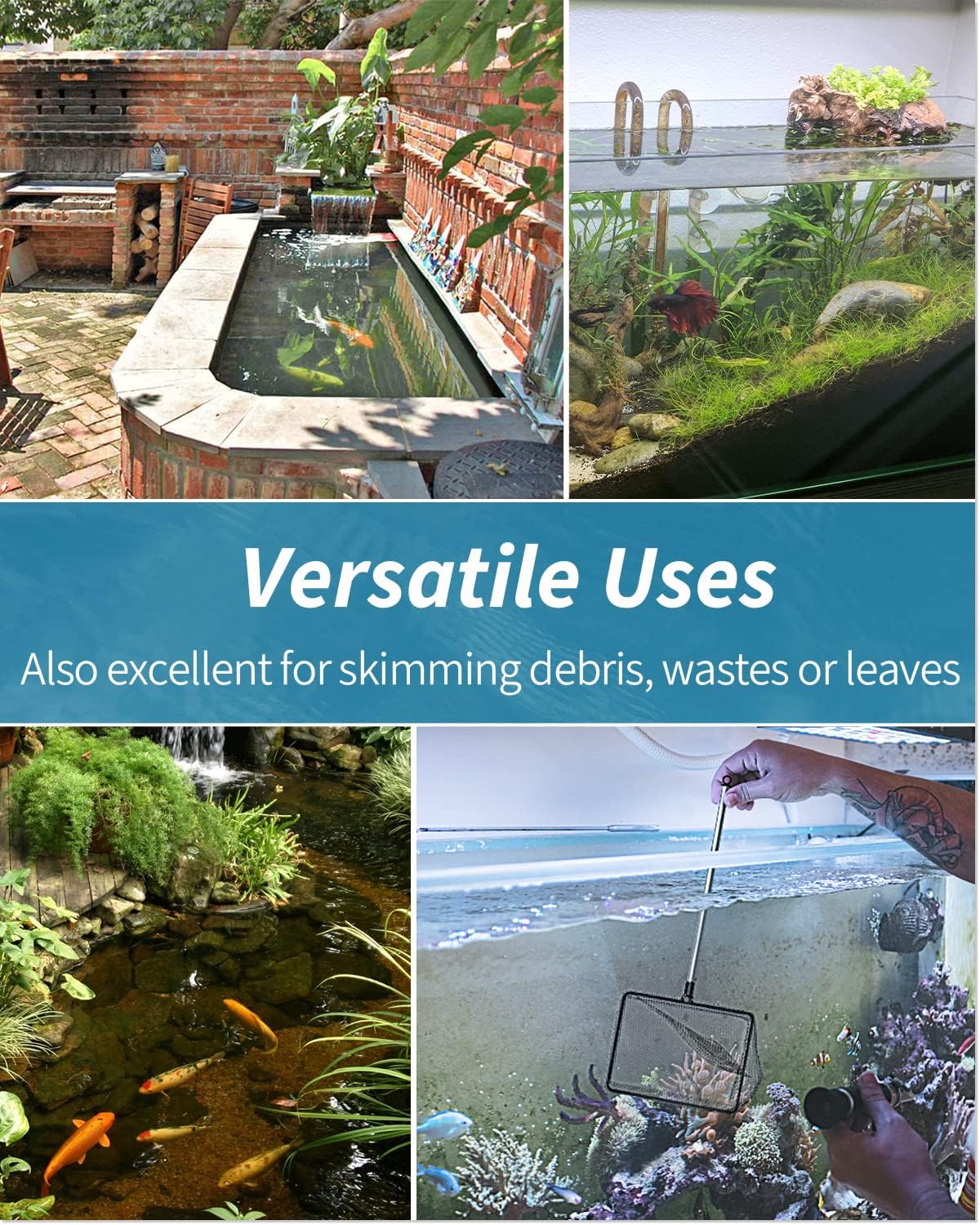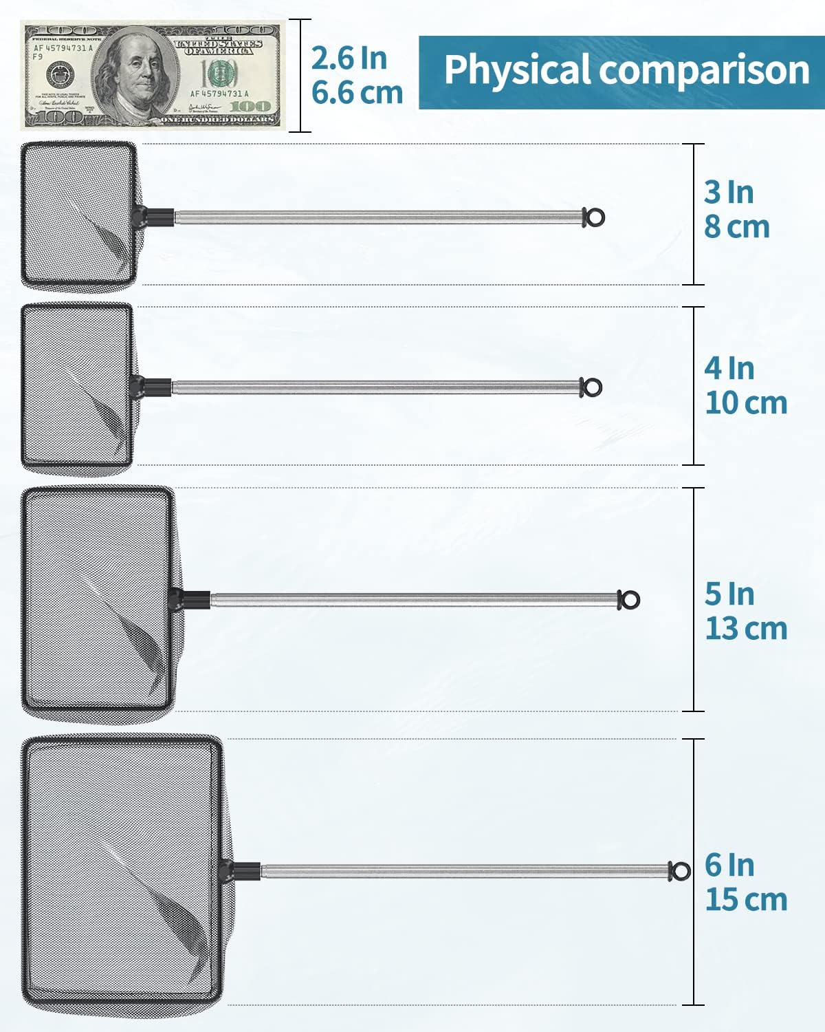About this item 6 Inch Fish Net: Measures 6" L x 4.5" W with a pocket depth of 3.6 inches. Its solid frame ensures strong bearing capacity. Perfect for loading medium/larger fish up to 4 inches. Fine Nylon Mesh: The well-woven soft nylon mesh reduces the risk of injuries to delicate fish during transfer. Especially suitable for betta, goldfish, angelfish, cichlids, etc. Telescopic Handle: The solid stainless steel handle won’t get rust or bent. It can extend up to 24". Easily reach the bottom of tanks up to 9-24 inches deep without wetting your hands. For Versatile Use: Perfect net to securely catch or transfer your fish. Also excellent for skimming debris, wastes or leaves from aquariums, small ponds or pools to keep them clean. Easy to Store: Designed with a hole at its end. Simply clean the mesh, dry the handle and hang it through the hole in a cool and ventilated place after use. › See more product details