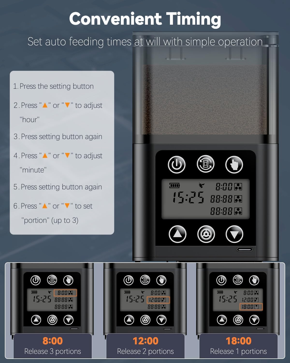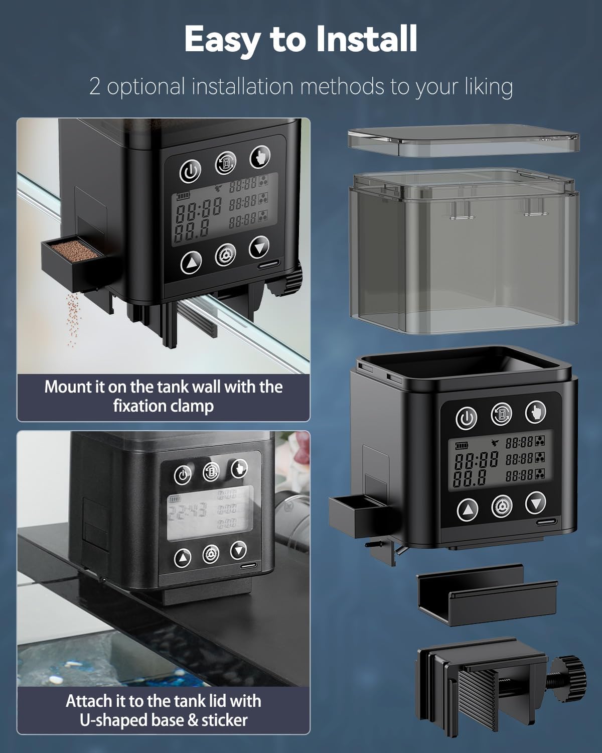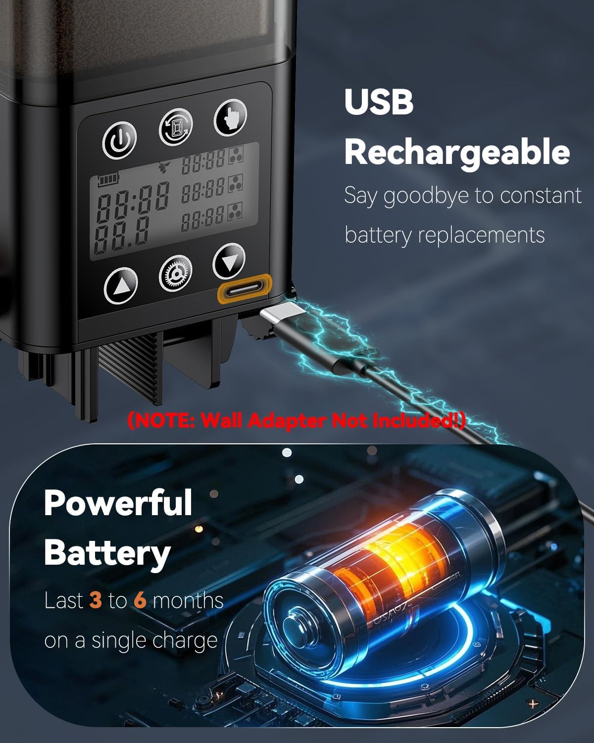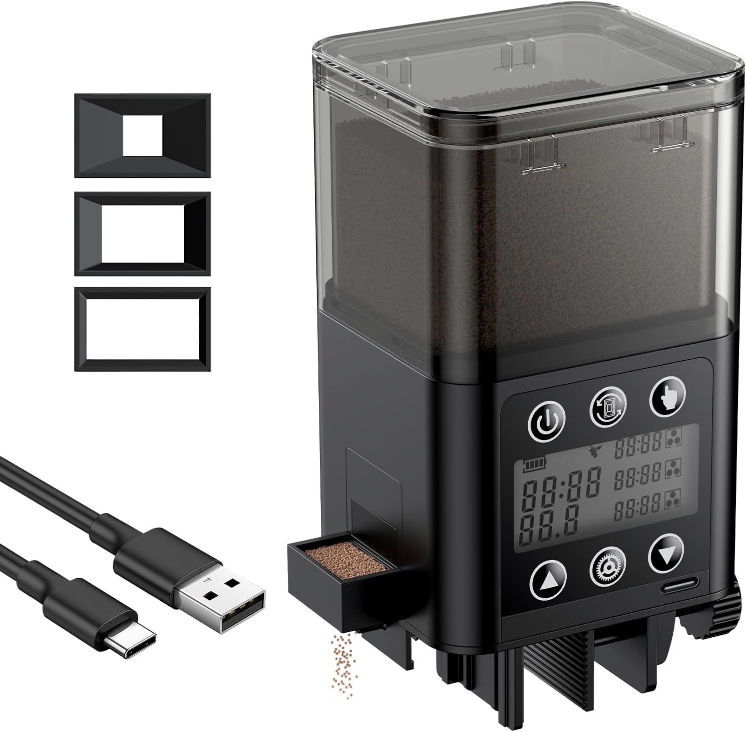 About this item Auto Fish Feeder: Professional fish feeder with timer automatically dispenses food every day or at intervals (up to 4 days). It feeds fish up to 3 times a day (up to 3 portions each time). Just set auto-feeding times at will or release food manually USB Rechargeable: The betta vacation feeder comes with a USB-C charging cable (Wall Adapter Not Included). Say goodbye to constant battery replacements! The powerful battery lasts 3-6 months on a single charge 320 mL Capacity: Perfect auto fish food dispenser to take care of your fish during your short-term absence for working overtime, vacations, business trips, etc. No more starving fish! (NOTE: Only for holding dry food like Powder, Pellets, and Granules!) Moisture-Proof & Anti-Clogging: Retractable food dispensing port effectively prevents moisture intrusion while ensuring precise portions. Always keep the fish food dry and fresh! The rubber stopper above the port eliminates food leaks that could clog it Perfect Portion Control: Three interchangeable dispensing ports let you customize feeding amounts without hassle – no more overfeeding or wasted food! Switch between ports instantly to match your fish’s appetite 2 Installation Methods: Just fix the automatic fish feeder for aquariums on the tank wall with the fixation clamp, or you can attach it to the tank lid with the U-shaped base and sticker. Super convenient and time-saving with no need for special tools › See more product details