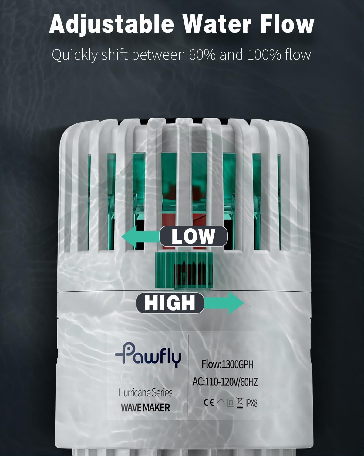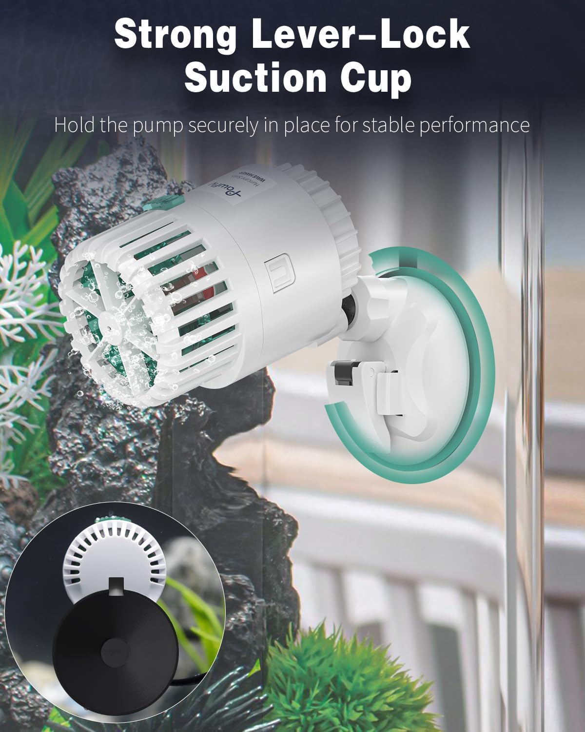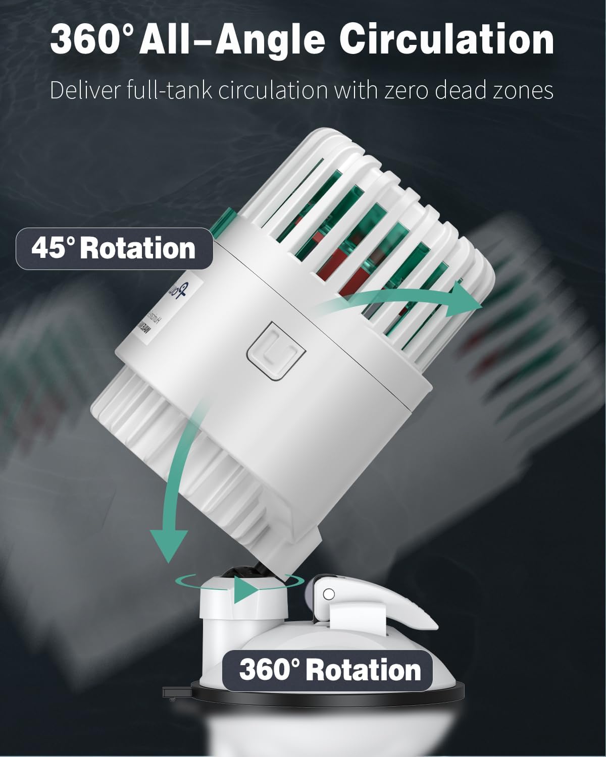 About this item For 25-100 Gallon Tanks: Max flow rate: 1300 GPH. This aquarium wave maker fits perfectly in 30-100 gallon freshwater tanks and 25-50 gallon saltwater tanks. Simulate natural current to keep your fish active and thriving 360° All-Angle Circulation: This aquarium powerhead rotates 360° on its base to deliver flow from all angles, ensuring full-tank circulation with no stagnant spots. Effectively prevent waste buildup to keep your tank clean Compact but Powerful: Driven by a high-performance pure copper motor and a robust ceramic shaft, this wavemaker generates strong, steady flow to boost water movement and oxygenation. Perfect for creating a healthy, oxygen-rich habitat for your fish Quiet & Adjustable: Equipped with an optimized motor, the circulation pump runs silently under 35 dB, keeping your tank calm while promoting the well-being of your aquatic pets. And the handy sliding switch lets you quickly shift between 60% and 100% flow Strong Suction Cup: Featuring a strong lever-lock suction cup base, this pump stays firmly secured to smooth tank walls. Deliver consistent power to stir the entire tank, mimicking turbulent sea waves and revitalizing your aquatic environment › See more product details