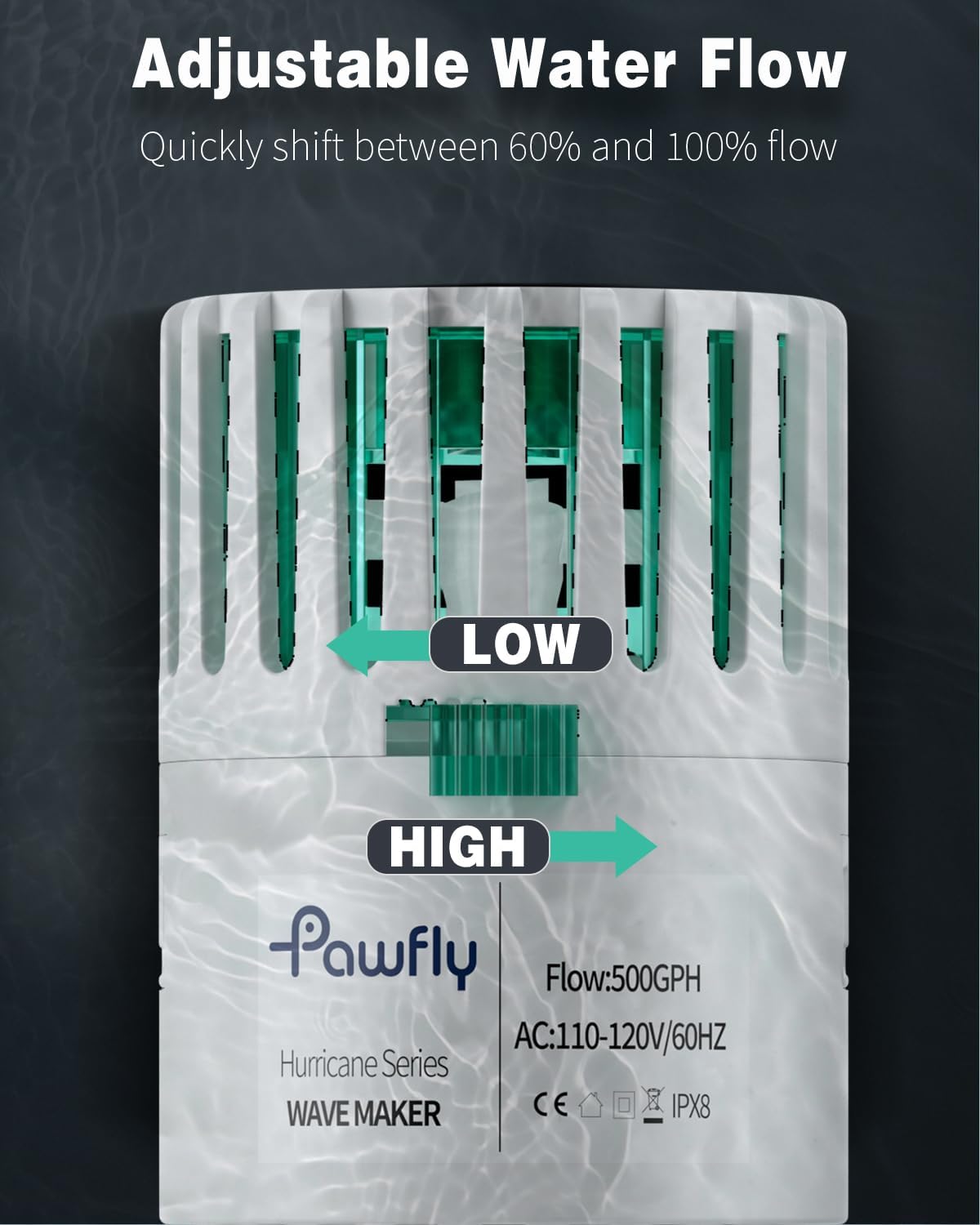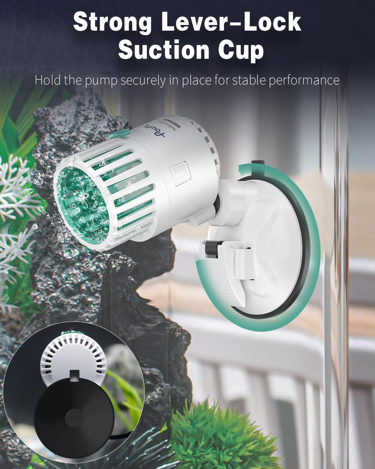 About this item For 0-35 Gallon Tanks: Max flow rate: 500 GPH. This aquarium wave maker fits perfectly in freshwater tanks up to 35 gallons and saltwater tanks up to 15 gallons. Simulate natural current to keep your fish active and thriving 360° All-Angle Circulation: This aquarium powerhead rotates 360° on its base to deliver flow from all angles, ensuring full-tank circulation with no stagnant spots. Effectively prevent waste buildup to keep your tank clean Compact but Powerful: Driven by a high-performance pure copper motor and a robust ceramic shaft, this wavemaker generates strong, steady flow to boost water movement and oxygenation. Perfect for creating a healthy, oxygen-rich habitat for your fish Quiet & Adjustable: Equipped with an optimized motor, the circulation pump runs silently under 35 dB, keeping your tank calm while promoting the well-being of your aquatic pets. And the handy sliding switch lets you quickly shift between 60% and 100% flow Strong Suction Cup: Featuring a strong lever-lock suction cup base, this pump stays firmly secured to smooth tank walls. Deliver consistent power to stir the entire tank, mimicking turbulent sea waves and revitalizing your aquatic environment › See more product details