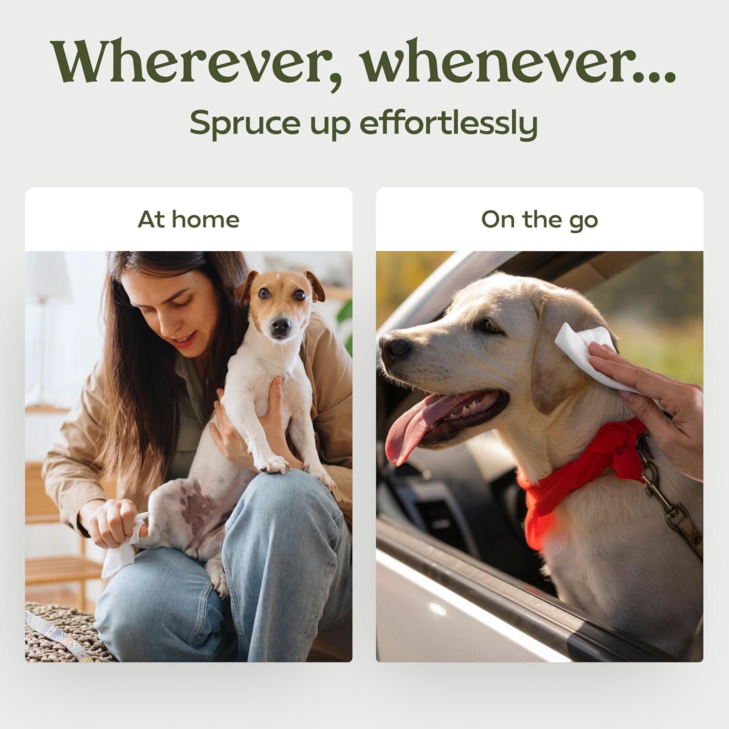 HYPOALLERGENIC DOG WIPES FOR SENSITIVE SKIN – Pamper your pup with hypoallergenic dog wipes made without harsh chemicals, perfect for gentle, everyday use. These wipes offer a spa-like clean that’s as kind to your dog’s skin as it is tough on dirt MOISTURE-RICH EYE WIPES THAT LAST – Infused with advanced moisture-lock technology, our 8" x 8" eye wipes stay perfectly moist to gently cleanse delicate areas. Keep your dog’s eyes bright and fresh, whether at home or on-the-go, with long-lasting freshness LUXURIOUS PET WIPES FOR A FRESH COAT – Thick, tear-resistant pet wipes that take on life’s “ruff” messes, from muddy paws to messy coats. Plush yet durable, these wipes deliver a reliable, lint-free clean, ideal for daily refreshes or tough jobs GENTLE TEAR STAIN REMOVER WIPES – Say goodbye to unsightly tear stains with these specially formulated wipes. Gentle on sensitive fur and effective at removing stains, they keep your pet’s coat looking pristine, bright, and camera-ready EASY-TO-SEAL PAW WIPES FOR ADVENTURE – Our 100-count pack with resealable lid keeps wipes fresh and ready for quick clean-ups after any outing. These paw wipes are a must-have for at-home pampering or on-the-go refreshes between adventures › See more product details