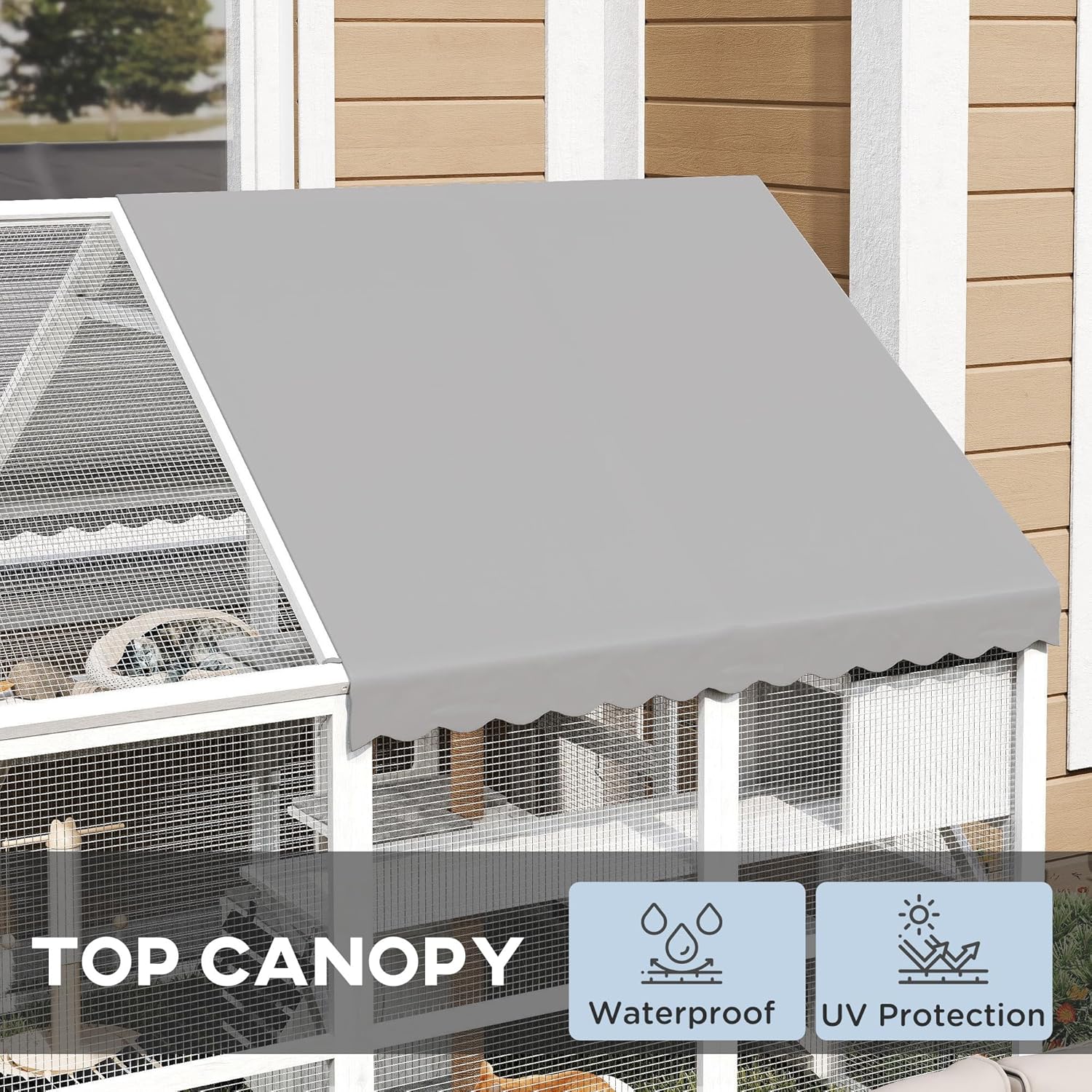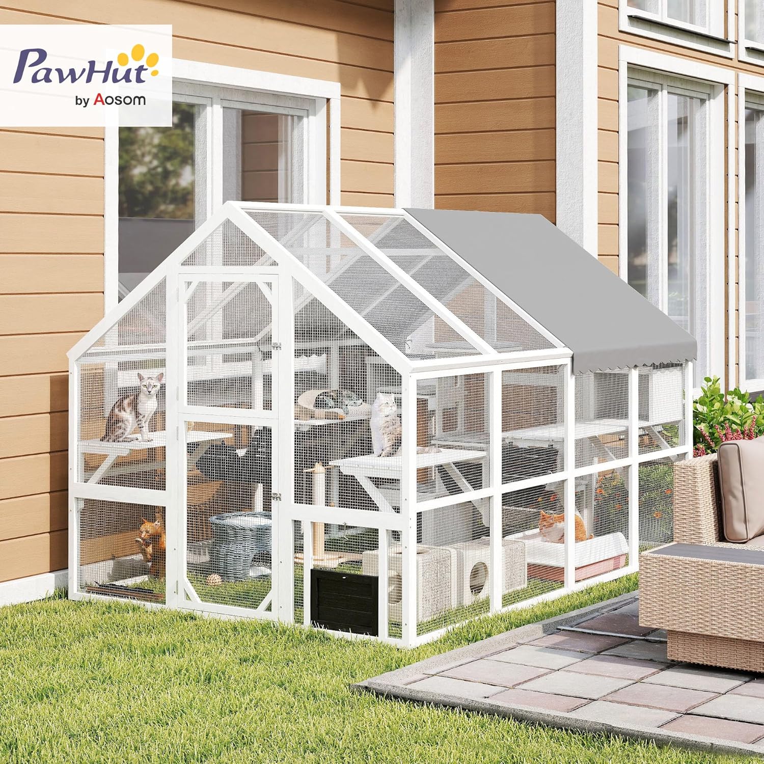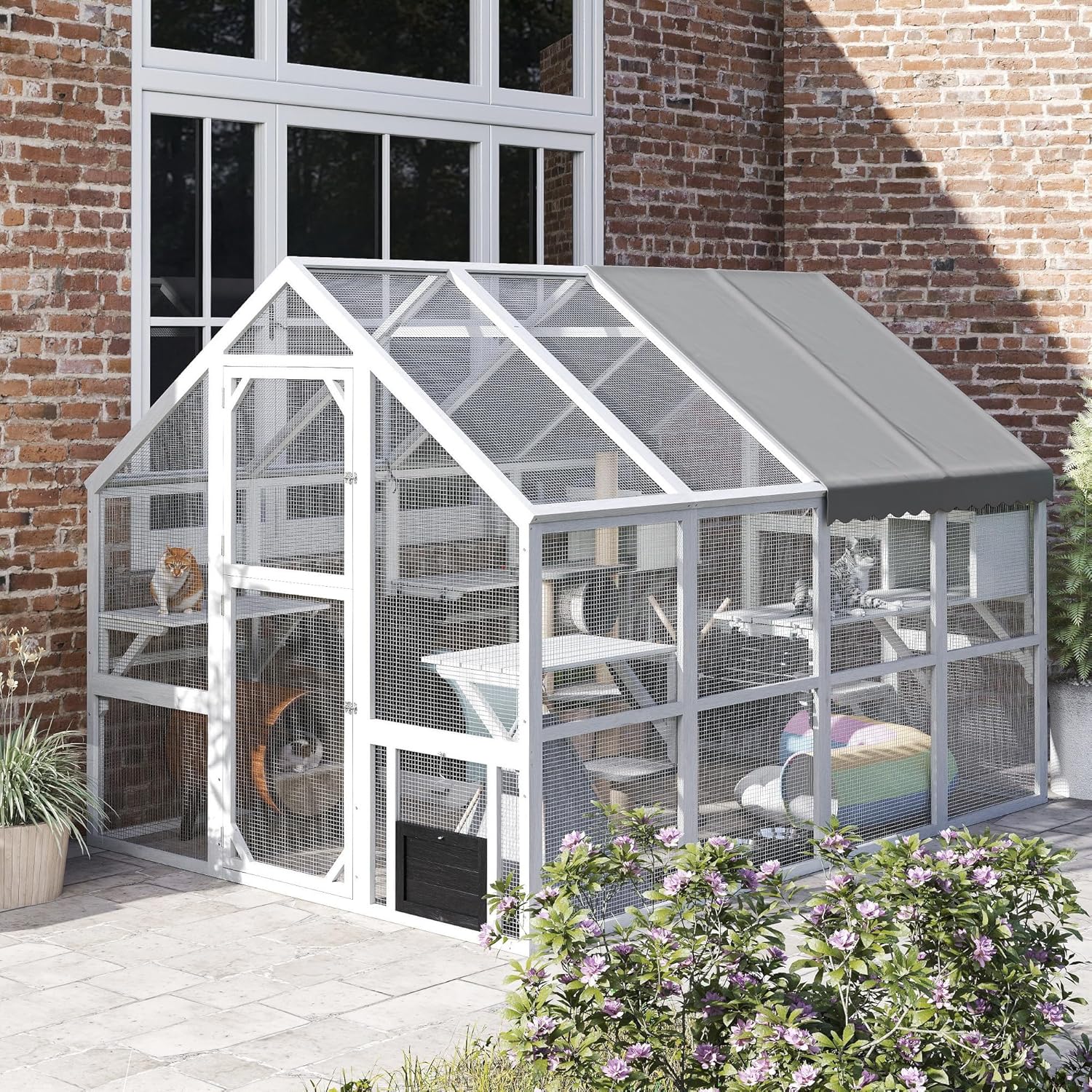 About this item Whisker-Twitching Adventures: This spacious cat patio comfortably fits 3 to 6 cats, featuring two cozy condos with curtains, six elevated platforms, and two soft climbing ladders for endless pouncing, lounging, and sunbathing. Easy Setup, Big Rewards: Assembling this cat run is a breeze—grab a friend, follow the clear step-by-step guide. Spend less time building and more time watching your cats explore their new outdoor haven. Fit Any Weather: Crafted with fir wood and finished with a waterproof, pet-safe coating, this outdoor cat enclosure is designed to withstand the elements. The 420D waterproof, anti-UV cover keeps your cats cozy and dry, rain or shine. Effortless Care: The split-door design makes cleaning and feeding easy, providing full access to the catio. The small sliding door lets you connect it to cat tunnels, extending the play area for curious cats. Catio Info: Overall Dimensions: 110.2" L x 73" W x 74" H. Maximum Load: 35 lbs. Suitable for cats under 18 lbs. Assembly required. › See more product details