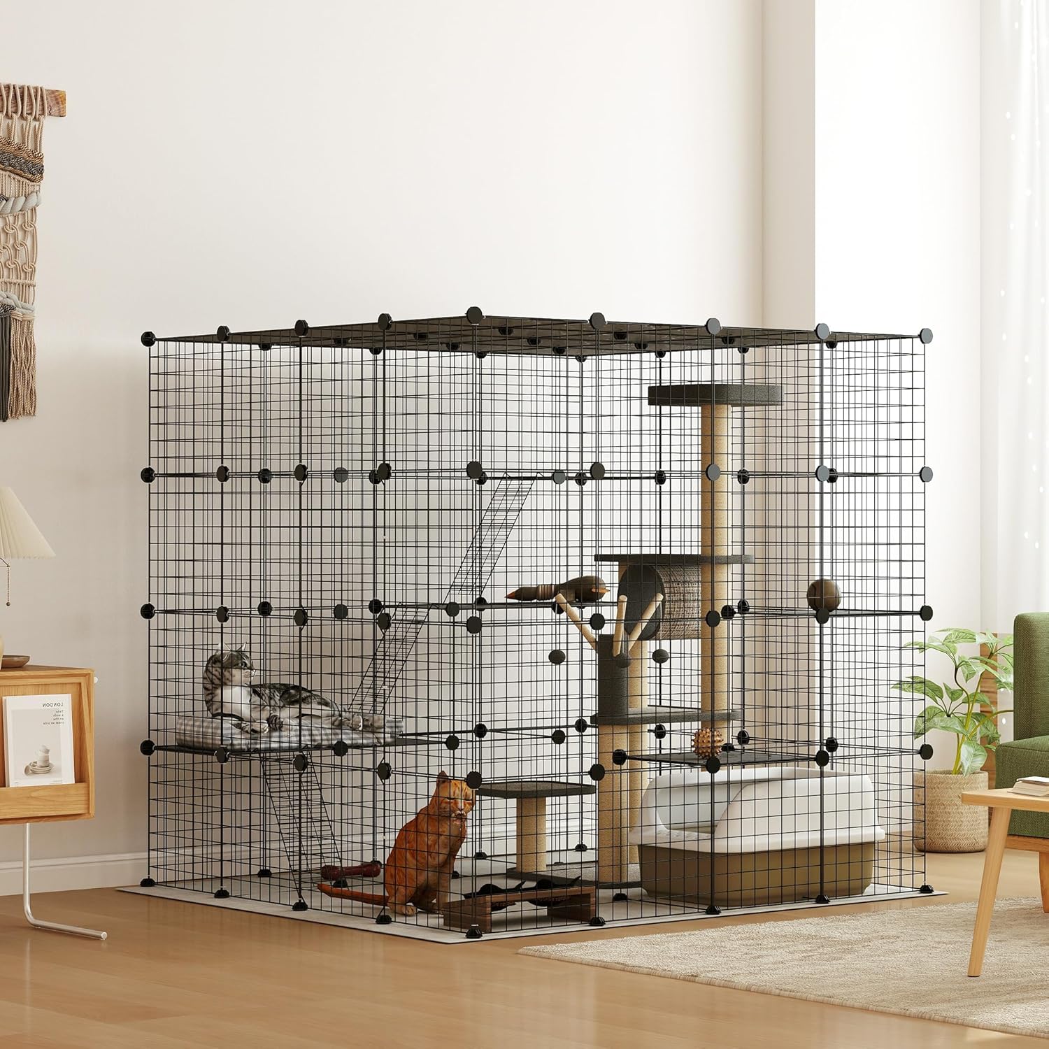 About this item Ample Living Space: This indoor cat cage offers 21 sq. ft of space across four levels, comfortably housing 1-3 cats. Add toys and furniture to create a cozy, expansive sanctuary for your feline friends. Versatile Configuration: This wire cat cage includes 87 panels for customizable layouts to fit your space and your cat’s needs. Easily add a hammock in any position for a cozy resting spot. Convenient Interaction: Featuring five accessible doors, this expansive cat enclosure makes interaction, feeding, and maintenance simple. Keep your cat's habitat clean and inviting with minimal effort, promoting a healthy and enjoyable living area. Adventure Zone: With five jump platforms and three ramps, this large cat cage offers a great space for your cat to climb and jump, supporting their natural instincts for physical activity and exploration in a safe, indoor area. Simple Assembly: Easily assemble this indoor cat enclosure by connecting panels, securing with a hammer and zip ties, and stabilizing with anti-slip mats. For optimal setup, it's recommended to have 2-3 people assist. › See more product details