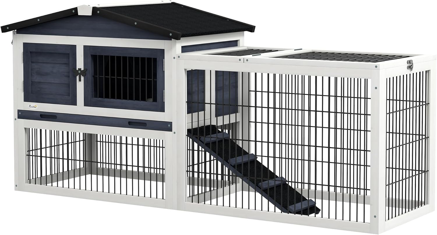 About this item Generous Space: The outdoor rabbit hutch is spacious, providing ample room for rabbits or bunnies to move, rest, and play comfortably within the outdoor cage. Solid Fir Wood: Constructed from fir wood, this robust large rabbit hutch is built to endure outdoor elements, offering a robust and lasting shelter for your pet. Convenient Multiple Doors: This bunny hutch features multiple doors for easy access to your pet and hassle-free cleaning, promoting a healthy area for your bunny. Safe and Cozy Design: Designed with your pet's safety and comfort in mind, this rabbit house secures your pet while providing various compartments for play and relaxation. Outdoor Rabbit Cage Info: Overall Dimensions: 59.1" L x 19.9" W x 26.8" H. Main House Dimensions: 28.3" L x 17.7" W x 15" H. Assembly Required. › See more product details