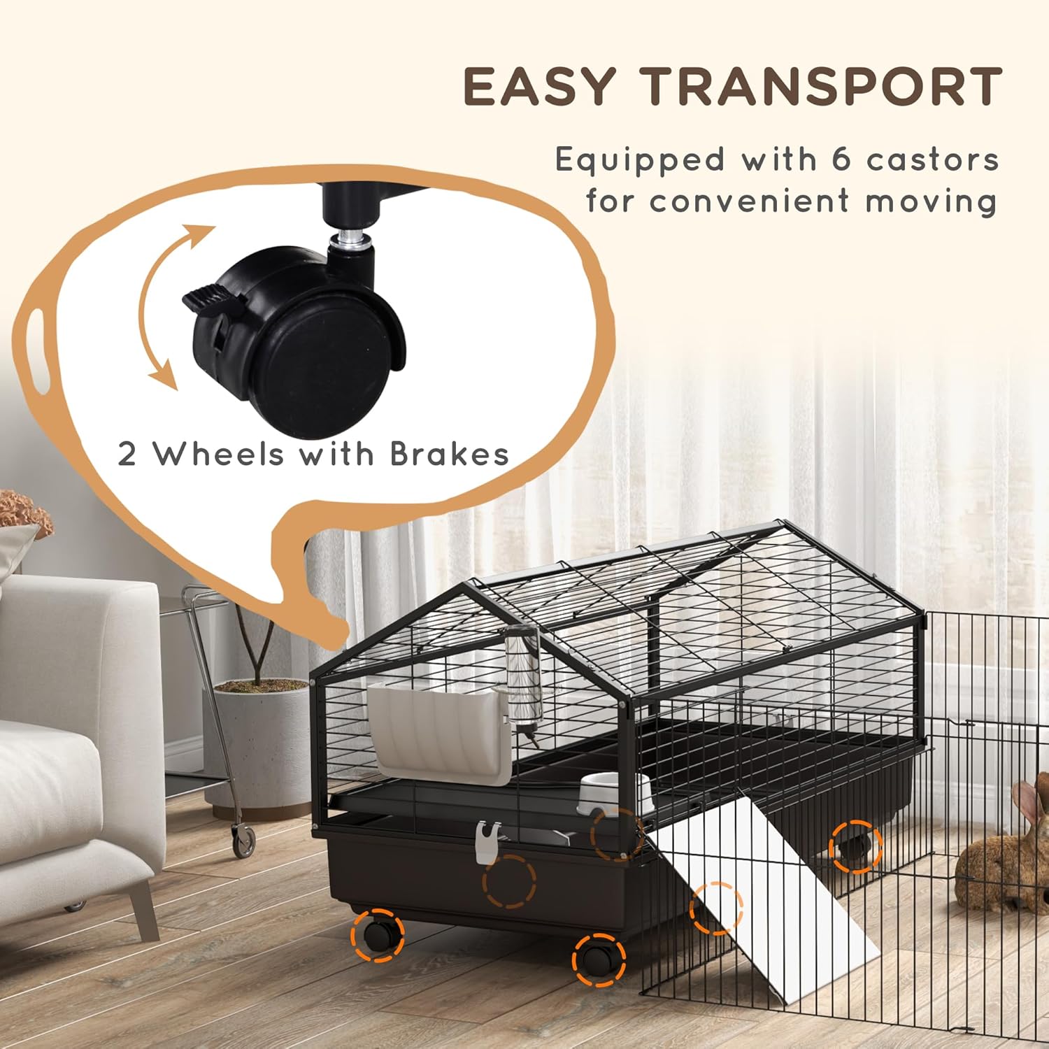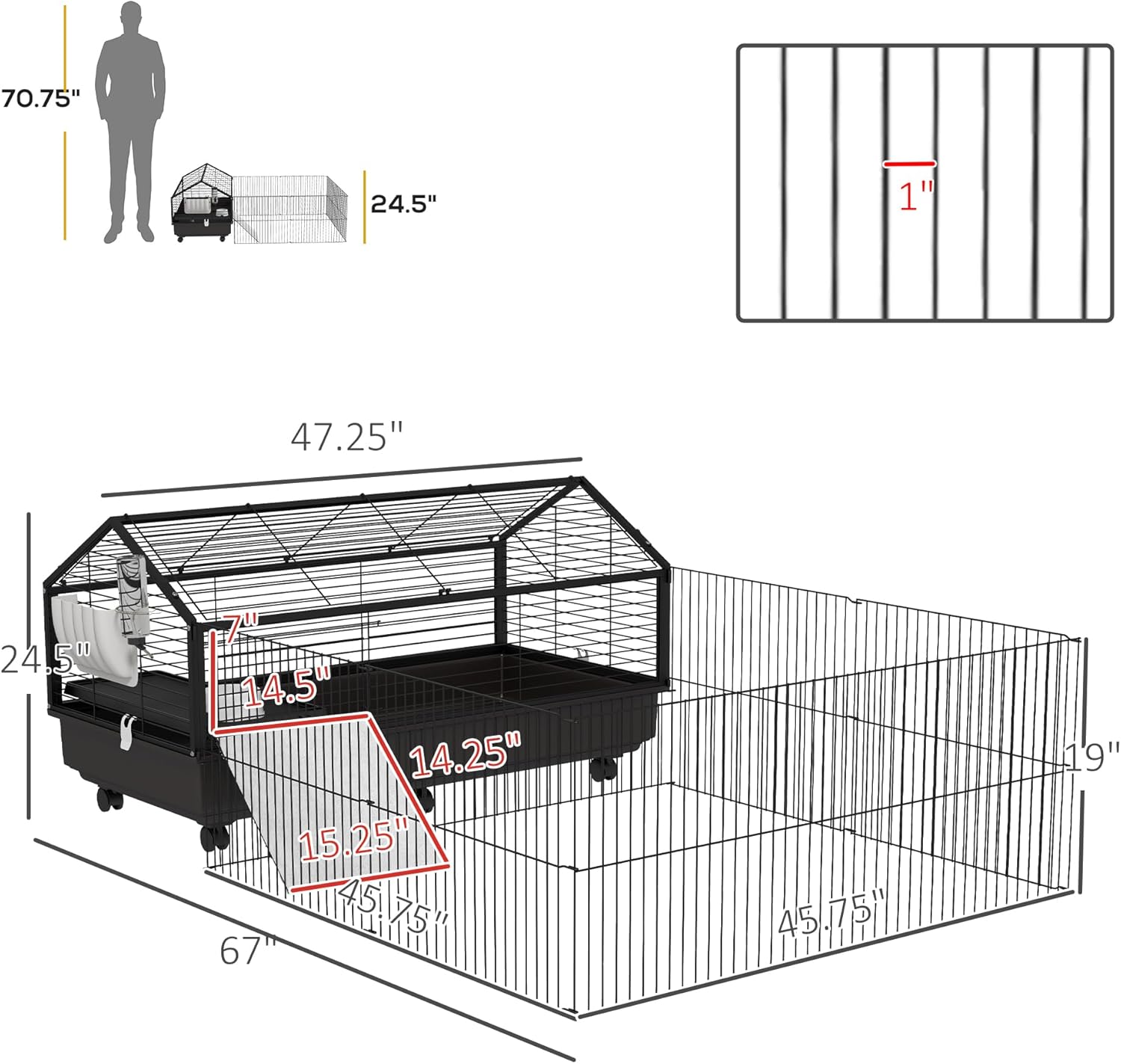 About this item Spacious Run Area: This small animal cage provides ample room for your small animal to play and exercise. With a foldable design, it ensures both comfort and convenience. Easy Transport: You can move this small animal cage easily, letting the wheels do the work. With this bunny playpen's easy-to-move design, it's a six-wheeled friend of portability. From rolling your furry friend into the sunlight to rearranging things, the wheels will ensure convenience. Extra Accessories: This bunny playpen includes a food bowl and a water fountain, so important necessities are already included. Easy Access: Our hedgehog cage's openable top and front door allow for easy cage cleaning and interaction with your pet, while the included ramps add extra mobility and fun. Rabbit Enclosure Info: Overall Dimensions: 47.25" L x 67" W x 24.5" H. A happy home for some breeds of bunnies, guinea pigs, hedgehogs, and other small animals. Note: Not suitable for hamsters and rats. › See more product details