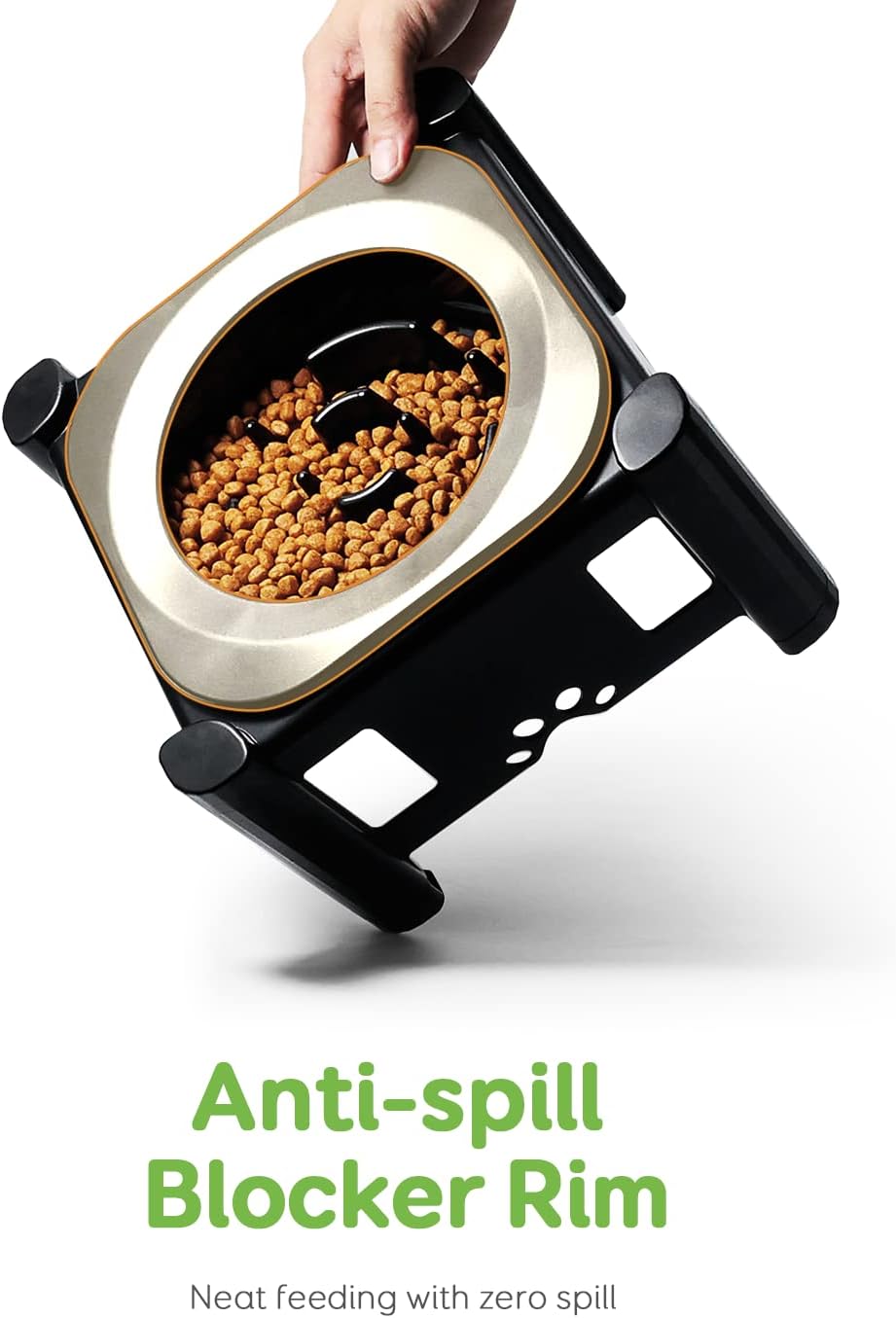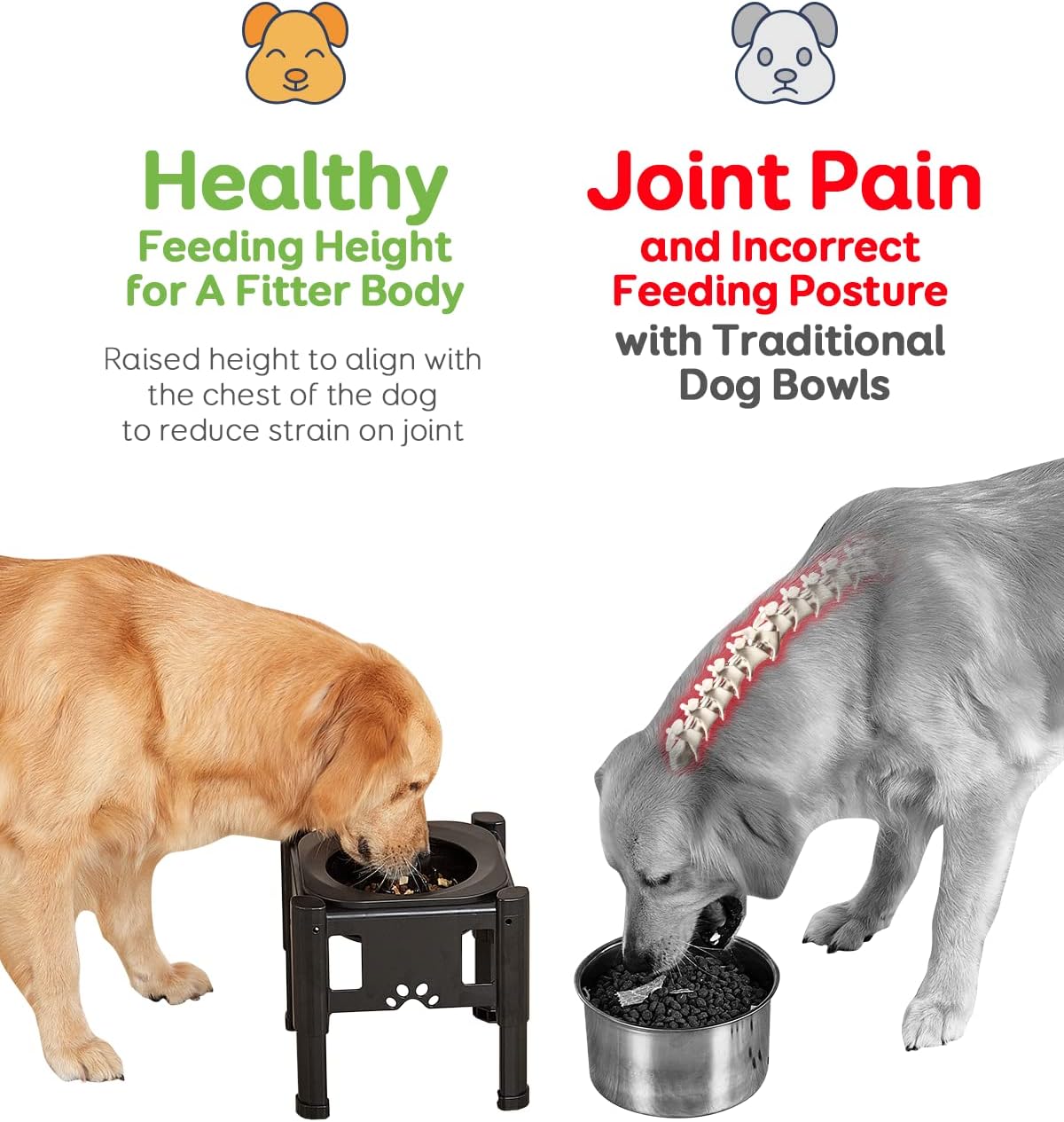 About this item Raised Dog Bowls for All Stages of Growth: 3 heights available in 6.1", 7.7", 9.3" perfectly align with small, medium, or adult medium dogs, so that they can feed themselves without needing to lean down or straining its joint, perfect for senior dog or dog with arthritis. Achieve the most comfortable feeding level with a simple press of the buttons to adjust the height. More Easy To Use: Anti-spill blocker rim prevent dog food or water from spilling and splashing. Stabler square shape with anti-skid rubber on the bottom of the legs stabilizes the bowl to prevent it from being knocked over by the dog. Single Bowl Standalone design avoids mixing up of water and food to keep super tidy and hygienic. Slow Feeder Food Bowl: Pawque Raised Dog Bowl comes with a slow feeder bowl which can slows down your dog's feeding to effectively prevent chocking, obesity, and indigestion. Healthier feeding makes happier and fitter pets. Dishwasher Washable & 35oz Large Capacity : 1.15L (35oz) slow feeder bowl is crafted with food grade ABS material that's safe, durable, and easy to clean, which is detachable and can be washed in a dishwasher. It helps nurture scientific and healthy eating habit so that your dogs can relish its food more. 100% Customer Satisfaction: If in any case you are not satisfied with our dog bowls, please contact us with no hesitation, we will resolve your concern within 24 hours and make sure you are leaving with a smile. Your approval is our utmost goal. › See more product details