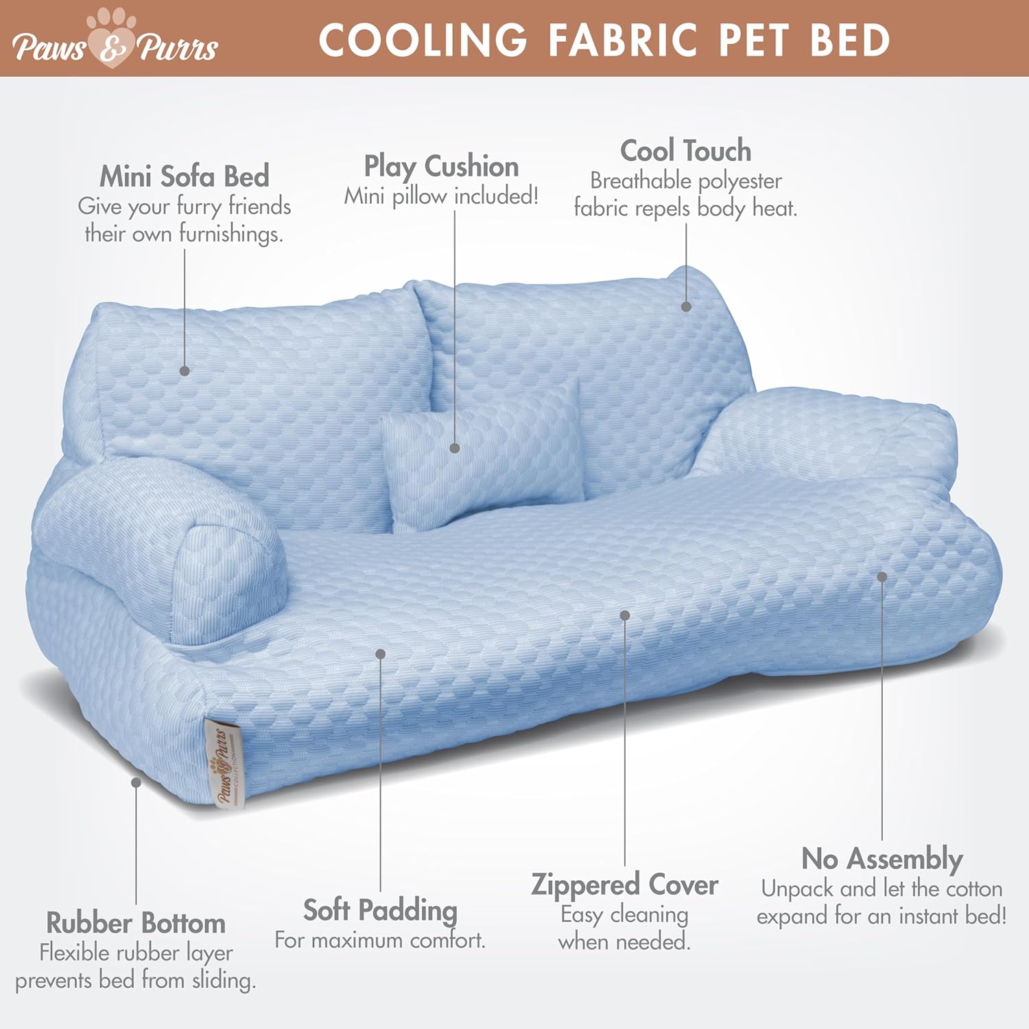 Give your pet the perfect spot to relax with this Cooling Fabric Dog Sofa Bed, designed for small and medium-sized dogs and cats who love soft, supportive comfort. Made with breathable polyester fabric and a plush polypropylene cotton cushion, this bed helps keep pets cool while providing gentle support for daily lounging and restful naps. Raised bolstered sides create a secure, cradled feel and offer a comfortable place for pets to rest their head. The removable zippered cover makes cleaning fast and easy, while the non-slip bottom helps keep the bed in place on hardwood or tile floors. A mini play cushion is included for added fun and comfort. With no assembly required and a lightweight, home-friendly design, this pet sofa bed is a cozy, stylish addition to any room.