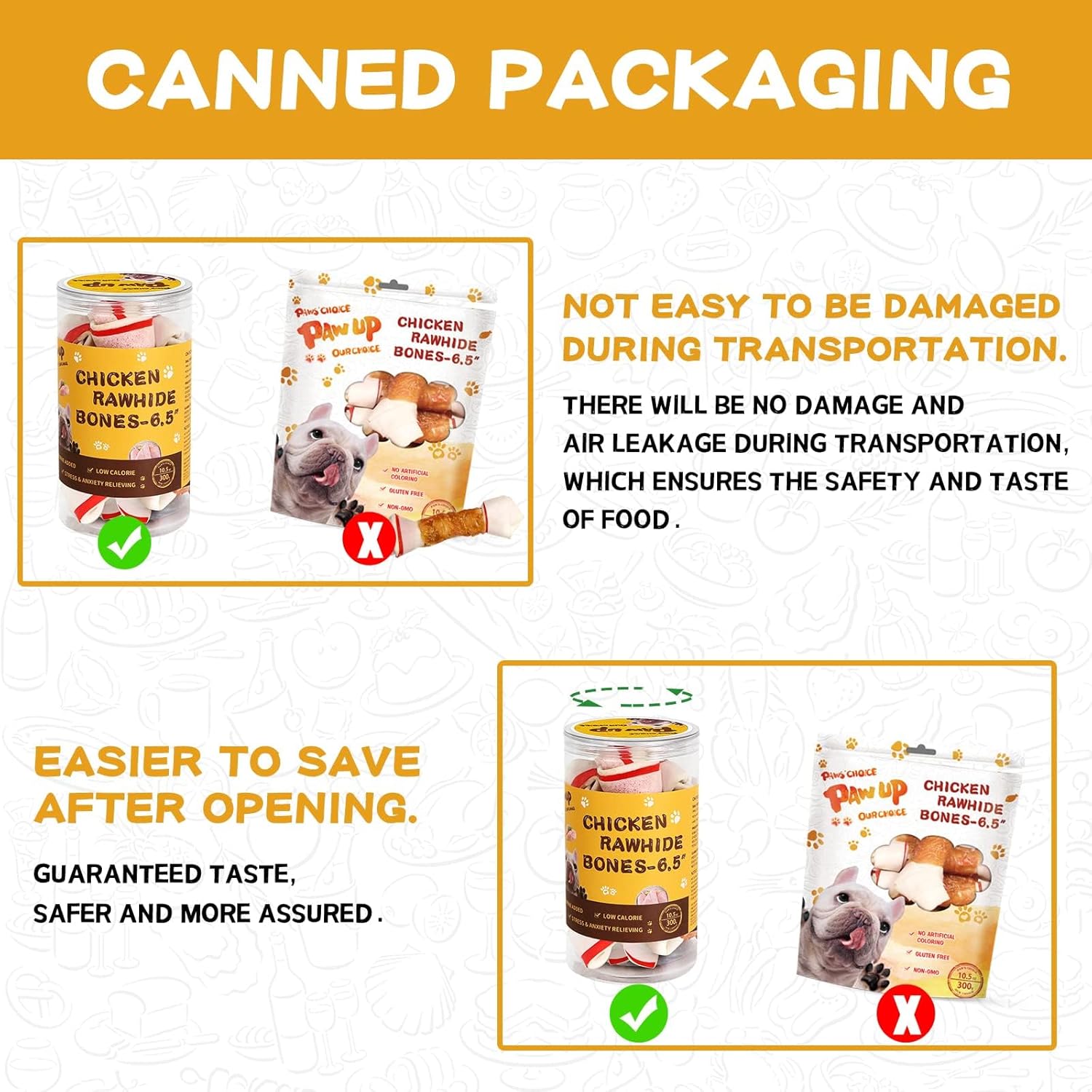 About this item TAURINE ADDED: Taurine supports proper heart function, promotes healthy vision, and contributes to a strong immune system. PawUp dog treats ensure that your adorable pup got the necessary nutrients while snacking time LONG LASTING DOG CHEWS: Treat your cutie pup with our healthy & natural chicken rawhide sticks that are packed with protein and low in fat. A good chewing alternative for toys, dogs can enjoy snack fun at the same time BRIGHT YOUR DOGS' TEETH:This edible chicken wrapped rawhide chews can help with dogs' teeth healthy and makes breath fresher. As a long-lasting chew, it is effective in helping reduce plaque and tartar buildup, promoting healthy gums and teeth. By incorporating pawup dog treats into your dogs' daily life, you can help maintain their dental care and keep their smiles bright and healthy STRESS & ANXIETY RELIEF: This tasty dog treat contains rawhide sticks which works great for relieving stress of hyperactive or anxious dogs. The delicious flavors will not only work great for relieving stress of hyperactive or anxious dogs but also provide them with a sense of comfort and security EASY TO STORE: Hand-feeding your dog occasionally with puppy chew stick is a great way to build a stronger bond with your pooch. Our treat container comes with a tight-fitting lid, which is convenient to open and re-seal › See more product details