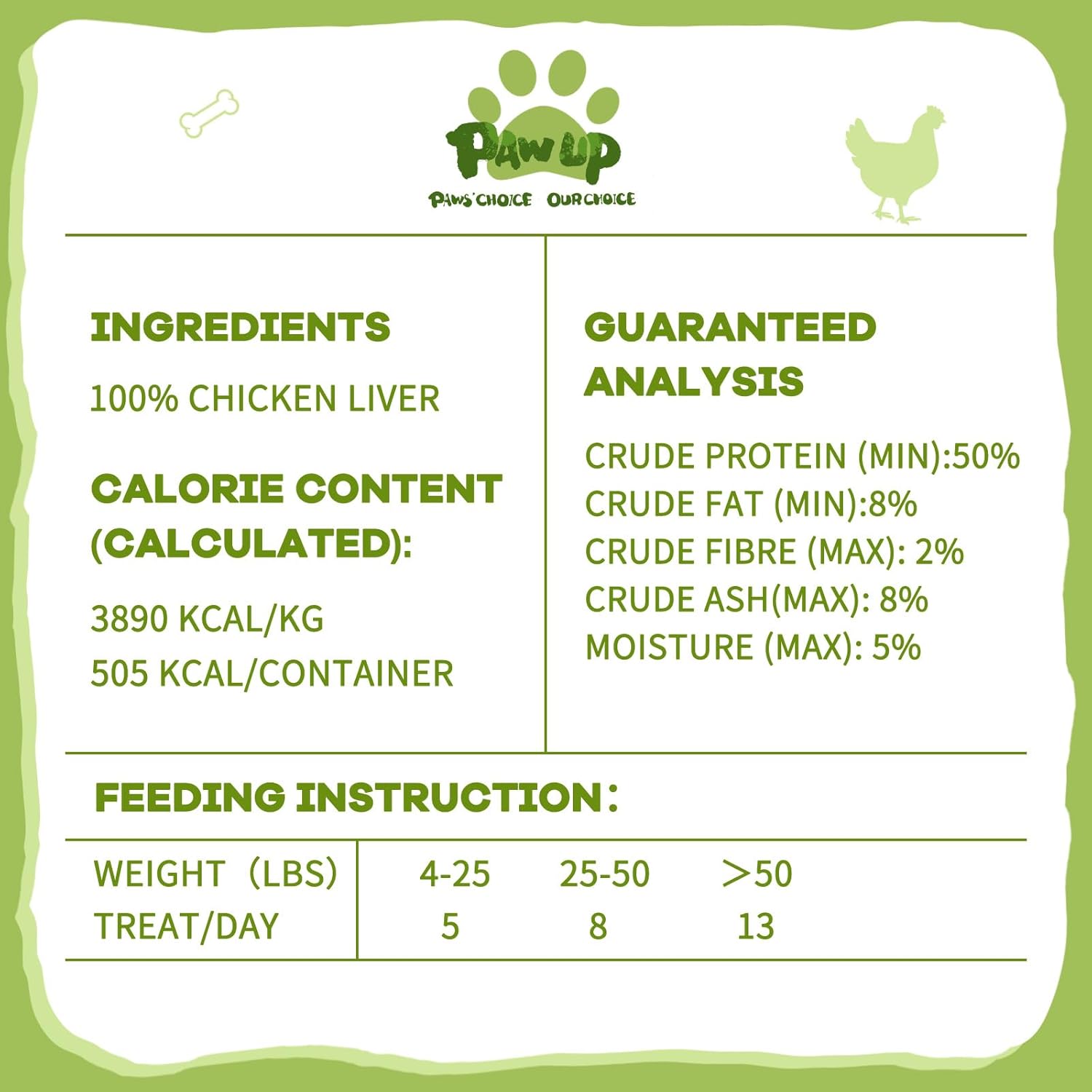 About this item Superior Protein Source: Experience the premium quality protein provided by free-range chicken's liver in PAWUP's Freeze-Dried Pet Treats. The liver's high protein content can help support your pets' muscle development and overall health 96% Nutrient-Rich: Savor the richness of PAWUP's Freeze-Dried Chicken Liver Pet Treats, made exclusively with fresh chicken liver as the primary ingredient. 96% nutrition of fresh chicken liver has been retented that offers essential vitamins and minerals for your pets' well-being Tailored for Carnivores: Tailored for cats, dogs, and all carnivorous animals, our chicken liver treats are a top choice for a flavorful and nutritious snack. Whether used for training or as a meal topper, these treats cater to your pets' instinctual dietary needs Pure and Natural: PAWUP's Freeze-Dried Chicken Liver Pet Treats are free from artificial additives, rawhide, grain and gluten, ensuring a pure and healthy snacking option for your beloved pets. Treat your dogs , cats to a wholesome and natural snack without any artificial ingredients Versatile Feeding Options: Whether served whole for a satisfying taste, crumbled for added flavor, or rehydrated to intensify the aroma, PAWUP's Chicken Liver Treats offer a range of feeding methods. Provide your pets with a diverse snacking experience that caters to their preferences › See more product details