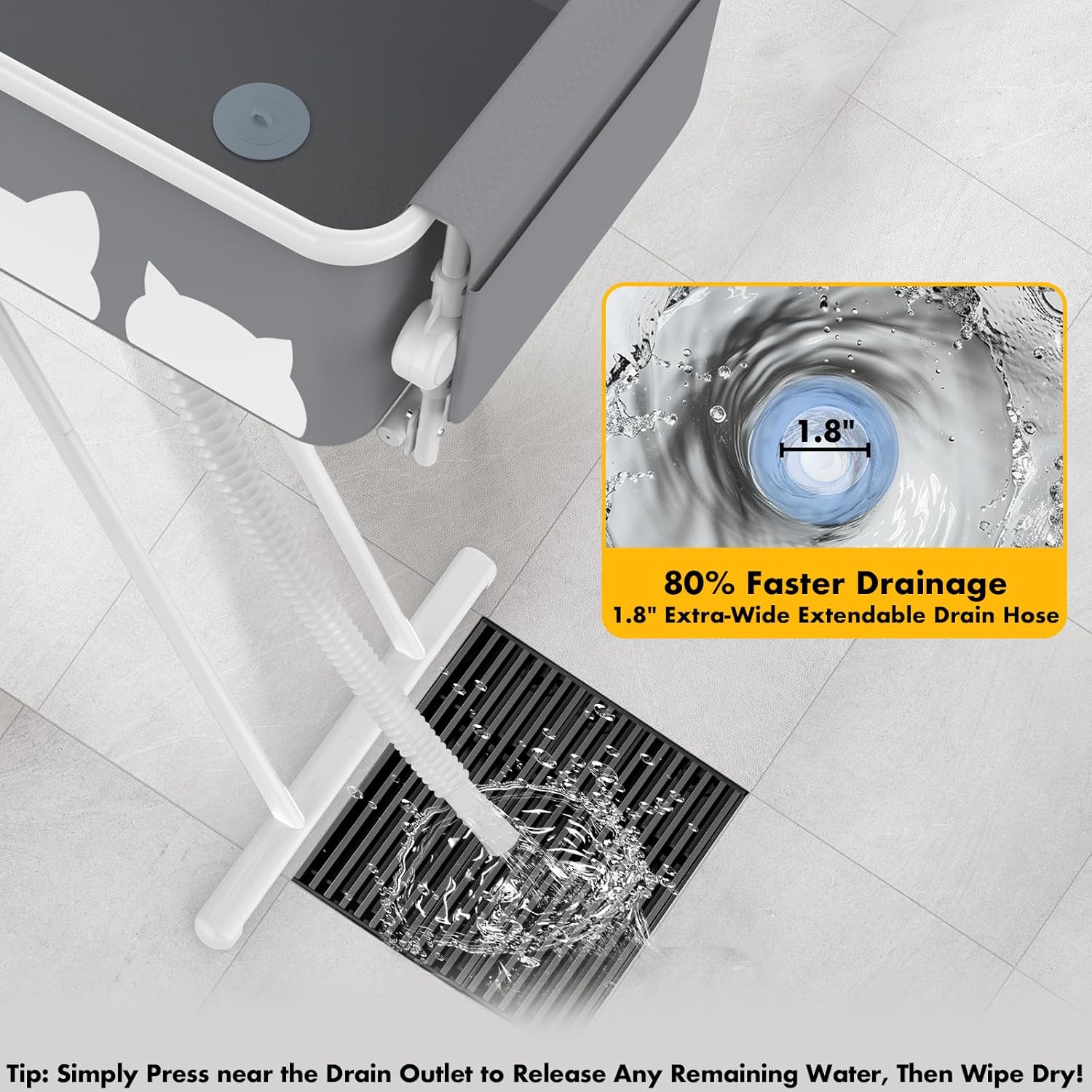 About this item 2-in-1 Bathtub & Grooming Table & Patented! —The lightweight aluminum top frame folds down flat, easily convert the bathtub into a grooming table for your pet. Comes with a detachable grooming arm & soft EVA-covered safety loops to gently secure your pet’s neck or hind area. (Tip: Add an extension cord if the loops feels short.) Say Goodbye to Backache & Enjoy Stress-Free Pet Bathing —5 Level Height Adjustment (30" ➡️ 28.5" ➡️ 26.5" ➡️ 24.5" ➡️ 22.5") , easily adjust with one-touch motion to suit pet owners of different heights. Our elevated bathtub makes bathing and grooming your dog or cat more enjoyable. Two large side storage pockets (13" x 7.5") hold grooming tools, shampoo, toys, and towels. NOTE: Always adjust to the desired height before adding water or placing your pet inside! Perfect for Small & Medium Pets —Now upgraded with a fully flat tub base (no center handle), offering zero obstruction for your pet’s comfort. Spacious 35"L x 18"W x 9.8"H tub comfortably fits cats and small/medium dogs up to 40 lbs. The 18" wide leg base fits in most bathtubs or showers, while 4 anti-slip feet enhance stability. Great for indoor or outdoor use! Durable, Foldable & Built to Last —Crafted with heavy-duty 1000D PVC Tarpaulin, and tested to withstand 30,000 folds without tearing—resists scratches from paws. Reinforced-stitching enhances durability by 50% for long-term use. Heavy-duty 1" steel-legs support up to 150lbs (including water). Folds flat to just 6.3" high for compact storage, and the legs detach easily for space-saving transport. Quick-Drain Design with Oversized Hose —Equipped with a 1.8-inch extra-wide & extendable drain hose for quick water flow—NO MORE LONG WAITS! Easily direct water into a floor drain, tub, shower, or bucket. More comfortable, efficient and faster—bathing your pet has never been easier! For Improve Drainage —If your drain is higher than the tub base, just remove the drain system and leave one rubber gasket for smoother, faster water flow. (Tip: Simply press near the drain outlet to release any remaining water, then wipe dry.) › See more product details