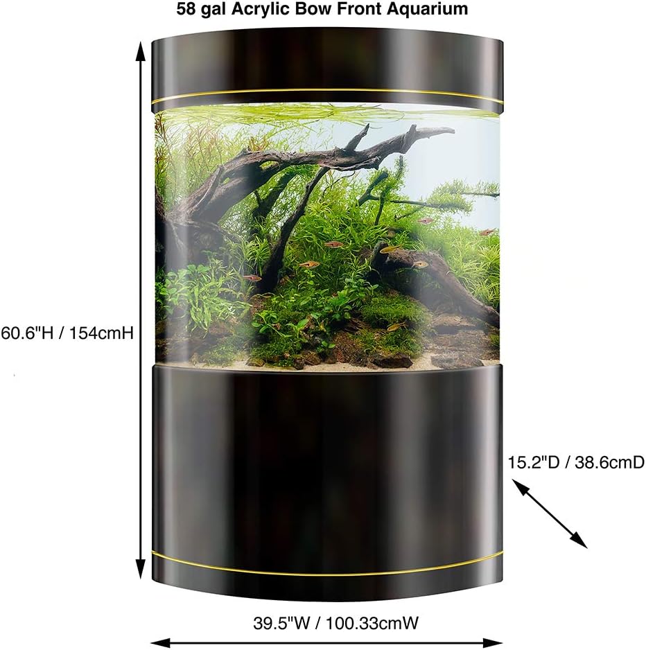 MODERN DESIGN FOR MODERN HOMES: Our Large Bow Front Acrylic 58 Gal Aquarium features a matching glossy black base and top cover, with a single accented gold line along the bottom of both. This tall and sleek design blends seamlessly with most home décor. Great for Freshwater and Saltwater setups.SAVES FLOOR SPACE: In addition to providing a full 360° view of your fish’s environment, this durable and strong acrylic tank will save you space within your home. You don’t have to compromise aquatic volume for horizontal square footage! Furthermore, you are also free to build vertically inspired setups and Aquascapes!CONVENIENT STORAGE TOP: The filtration and aeration systems are constructed specifically for this tank, and for your convenience. While filtration is setup directly atop the tank via a tightly sealed and transparent lid, the glossy black top sits atop of that, and contains a storage compartment for the electrical power strip and air pump.ITEMS INCLUDED: Tank, Bottom Stand, Top Cover, Customizable Filtration Column / Lid, Filtration Media, Dual Outlet Air Pump, Integrated Tubing System and Bubble Wall, Water Pump, Remote Controlled Mufti-Color LED Light, and Electrical Power Strip.