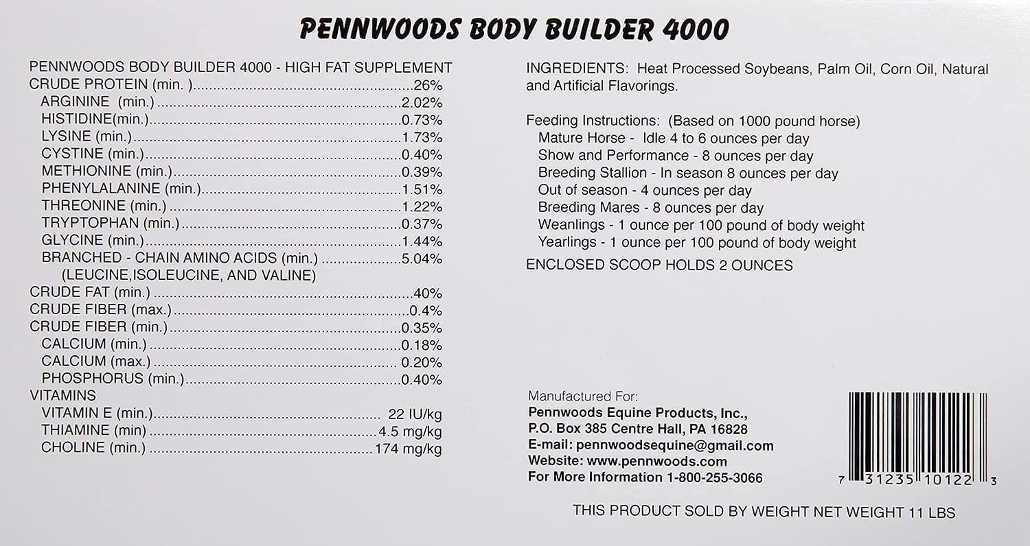 About this item Pennwood's high quality horse supplement formula is a 40% fat, 26% protein supplement, and it's designed to promote weight gain and act as a body builder for horses. This product is a weight gainer for horses and a muscle builder for horses. This formula also improves hoof quality and the high energy concentration and calories permit lactating mares to maintain proper body weight. Our horse weight gain supplement has the ability to keep performance horses in top body condition during peak season while also promoting muscle recovery. Fed at 6 ounces per day, this 25 pound bag will offer a 66 day supply! Our goal is to supply you with premium equine nutrition to support the growth, performance and longevity of your equine family. Horse Products by Horse People - we are a family owned and operated business that makes our products with locally sourced ingredients entirely in the USA! Pennwood Equine Products are backed by actual horse owner experience - we have identified challenges of everyday horse owners and spent years developing and testing solutions. › See more product details