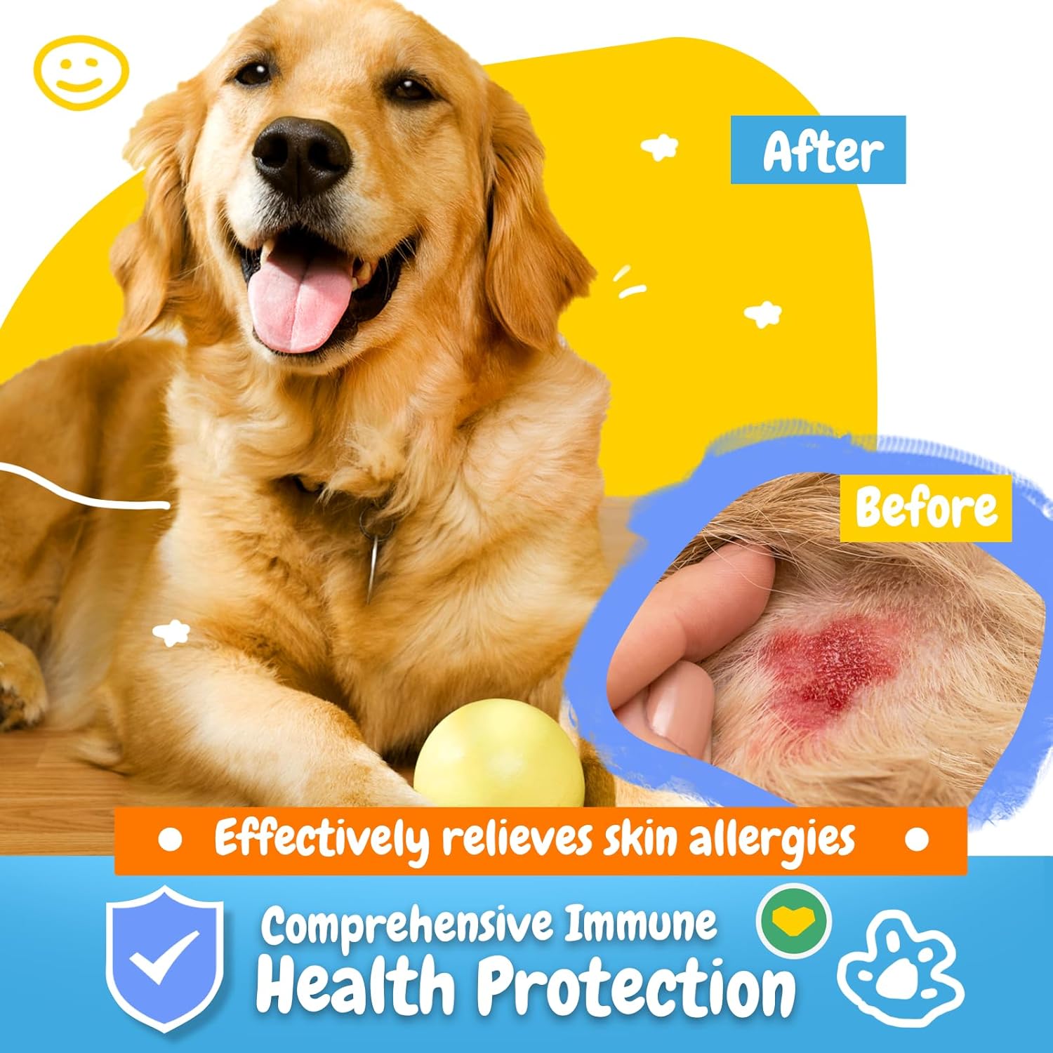 About this item All-in-One Solution for Allergy & Skin Health: Relieve your pet’s allergy symptoms, from itchy skin to paw licking, with a multifunctional formula that tackles seasonal allergies, supports skin and coat health, and promotes overall comfort using ingredients like Turmeric, Apple Cider Vinegar, and Hemp Seed. These natural ingredients help maintain your pet’s comfort year-round, suitable for dogs of all ages. Powerful Immune System Boost: Our dog allergy chews are packed with Colostrum, Licorice Root, and Ginger Root to strengthen your pet’s natural defenses. Perfect for pets with sensitive skin or seasonal allergies, these ingredients promote a resilient immune system for year-round protection. Gut Health for Enhanced Vitality: Featuring a robust probiotic blend (1 billion CFUs per serving) and prebiotics like FOS and Hemp Seed Oil, our chews promote healthy digestion, balance gut flora, and contribute to better nutrient absorption and overall well-being. Ideal for pets of all ages, supporting long-term digestive health. High-Quality, Natural Ingredients: Made with non-GMO, high-quality natural ingredients, our chews are free of harsh additives. We use premium Hemp Seed, Licorice Root, and Ginger Root to provide effective support, ensuring safety and quality for your furry friend’s daily care. Up to 2 Month Supply: With 180 chews per bottle, our product provides up to two months of daily allergy and immune support. This generous supply ensures your pet gets consistent care at a cost-effective value compared to competitors. Easy-to-Serve and Delicious: Say goodbye to messy powders and pills! Our dog allergy relief soft chews come in a Peanut Butter-flavored formula that pets love, making it simple and enjoyable to support your pet’s health every day. › See more product details