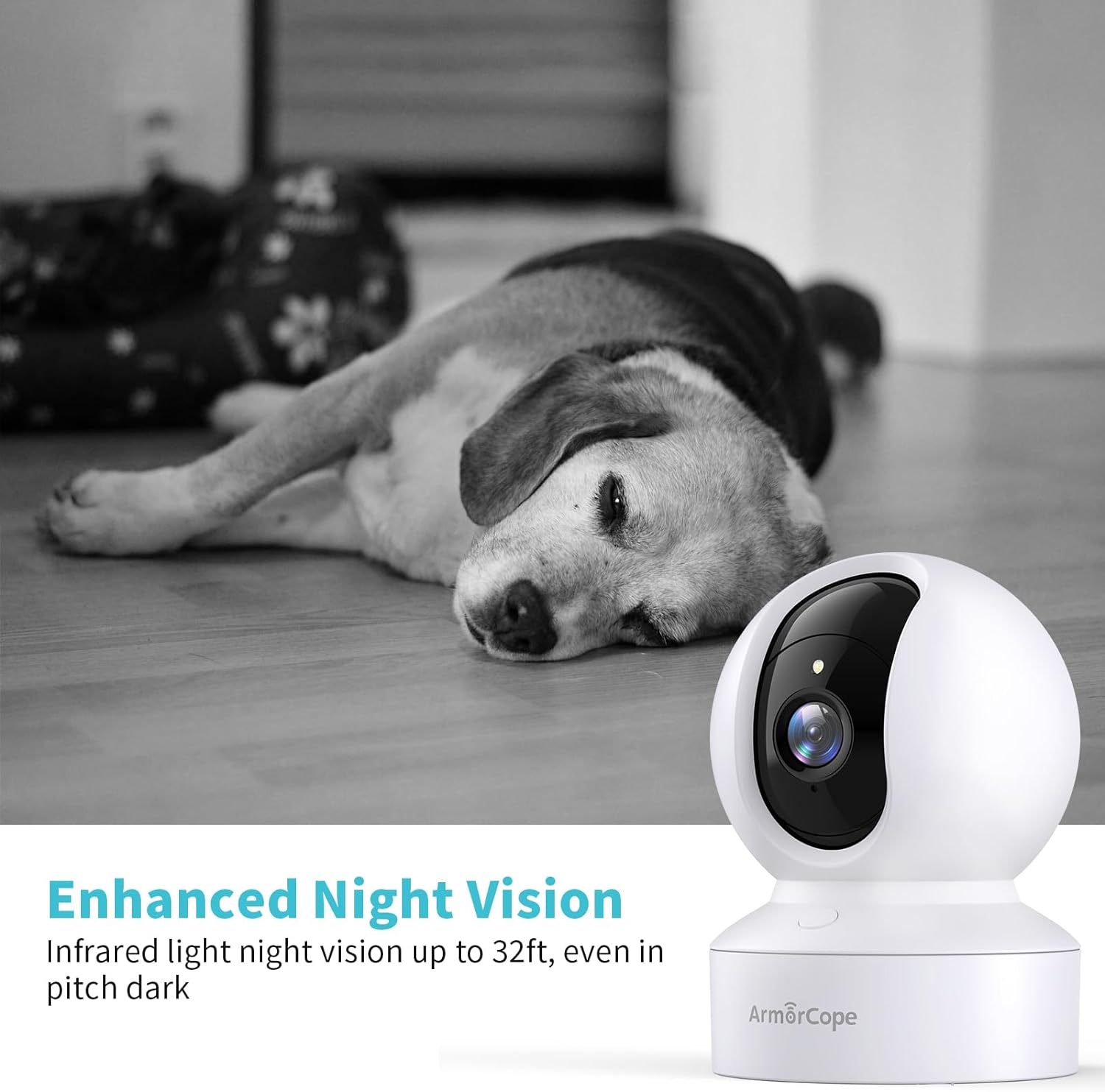 About this item Full 2K HD and 355° Pan/Tilt : The Armorcope pet camera provides 8X optical zoom, 2K HD crystal clear smooth live video with 355° horizontal and 100° vertical rotation range, covering every corner of your home,monitor your pets, baby all the time. Wifi Camera works with 2.4GHz WiFi.(not support 5G). Smart Motion Detection Alarm and Auto Tracking : This indoor pet camera with phone app supports Dog and human detection, when motion is detected, the app will send you a notification, just open it to check quickly what is going on, you will not miss any important movements of your pets.You can watch your baby via your phone wherever you are. MagicPix Night Vision & Two-way Audio : Even in deep dark, the magicpix night vision let you watch your pet clearly.The pet cam built-in microphone & speaker, allowing you to keep in touch with your baby while you are out. Motion Record Absolute Protection for Your Family : This indoor wifi camera for home security,features in IR-CUT function to capture real-time crisp videos and photos from day to night, advanced night vision with IR distance up to 32 ft, home camera also lets you can keep an eye on your home anytime anywhere. Optional Cloud & Local SD Storage : Financial encryption video storage technology enables the security camera to keep a private recording in the cloud , meanwhile you can choose an SD card (up to 128G) to avoid any possible risks, absolute protection for your family,baby and pets. › See more product details