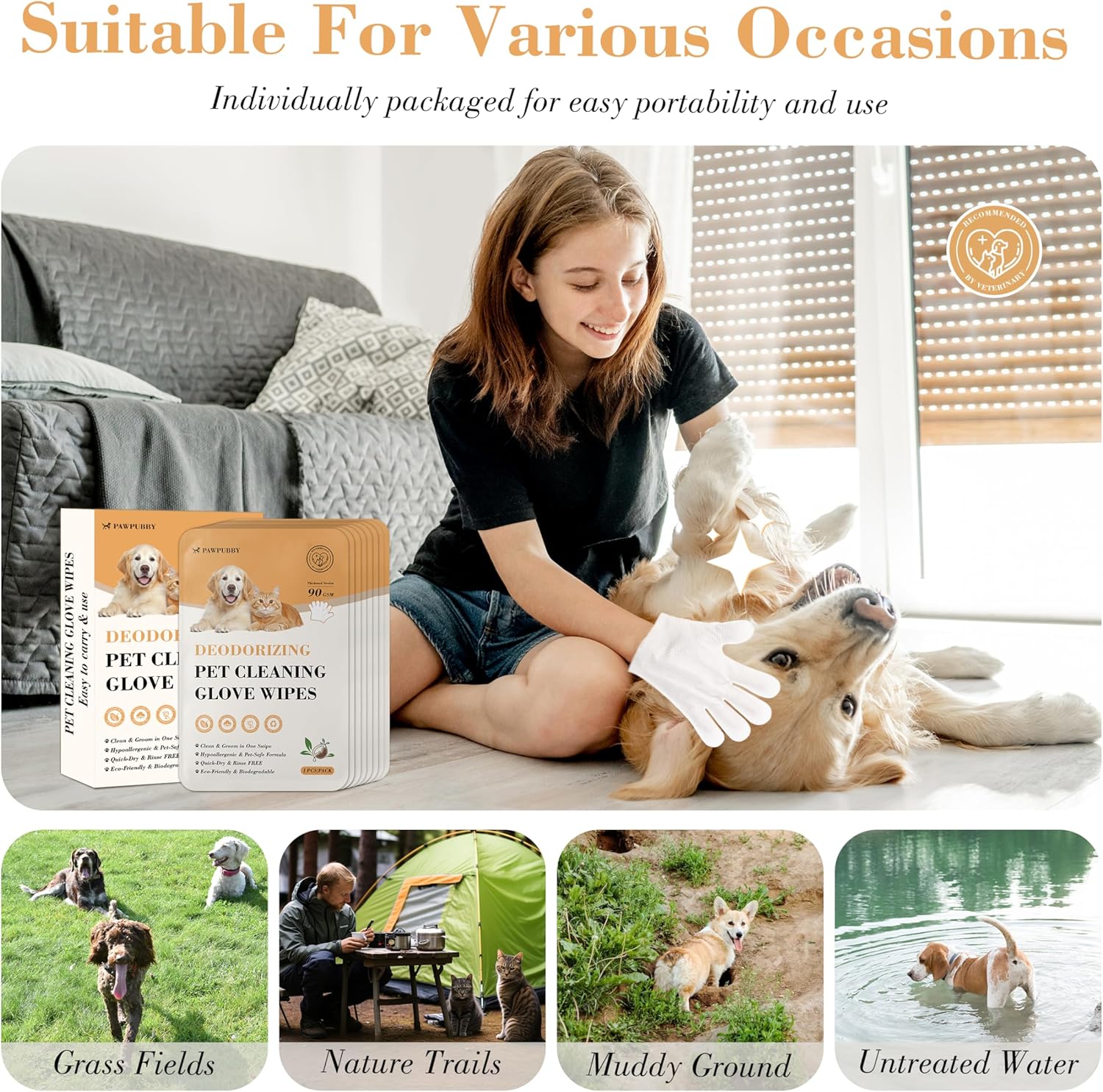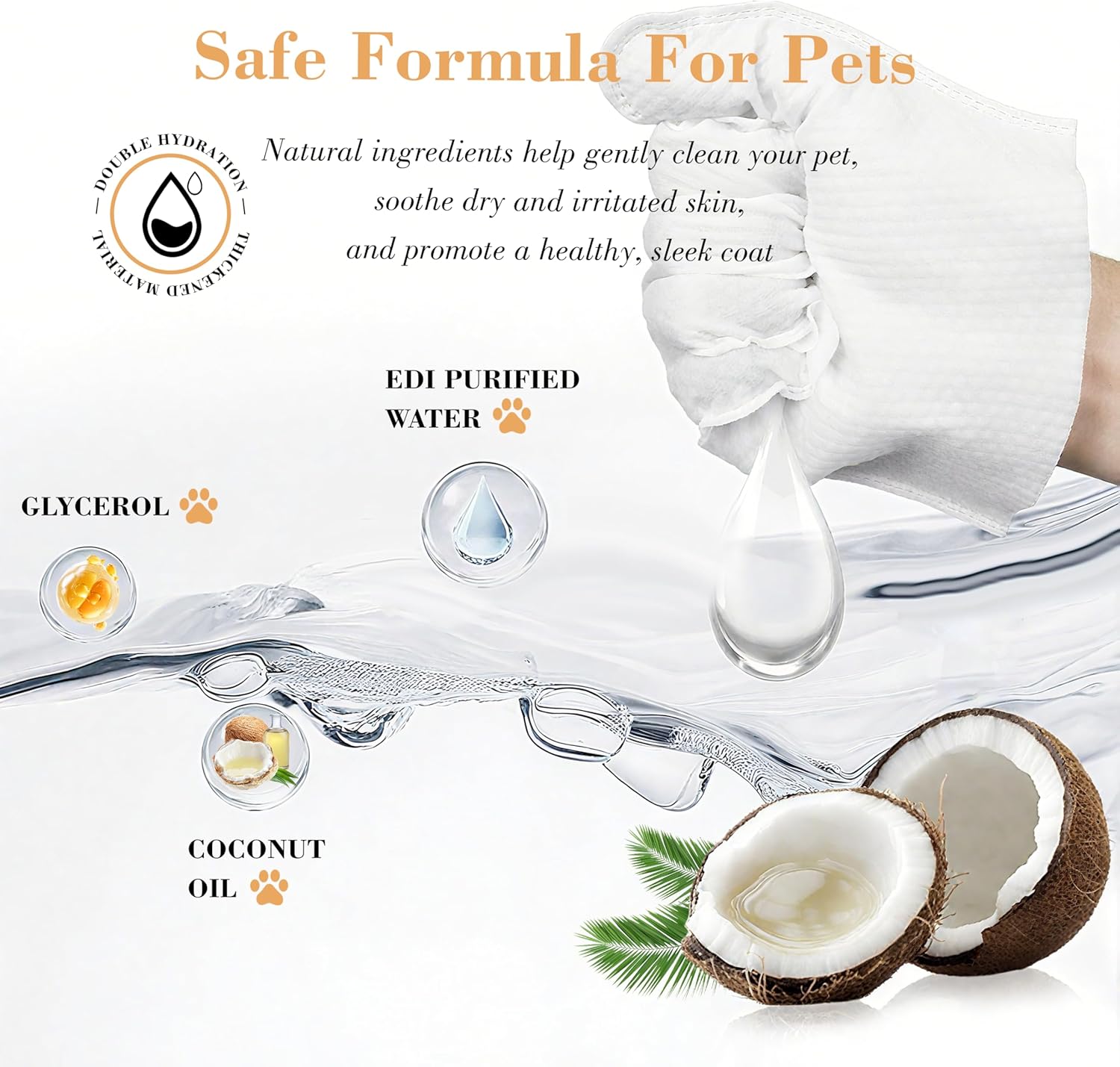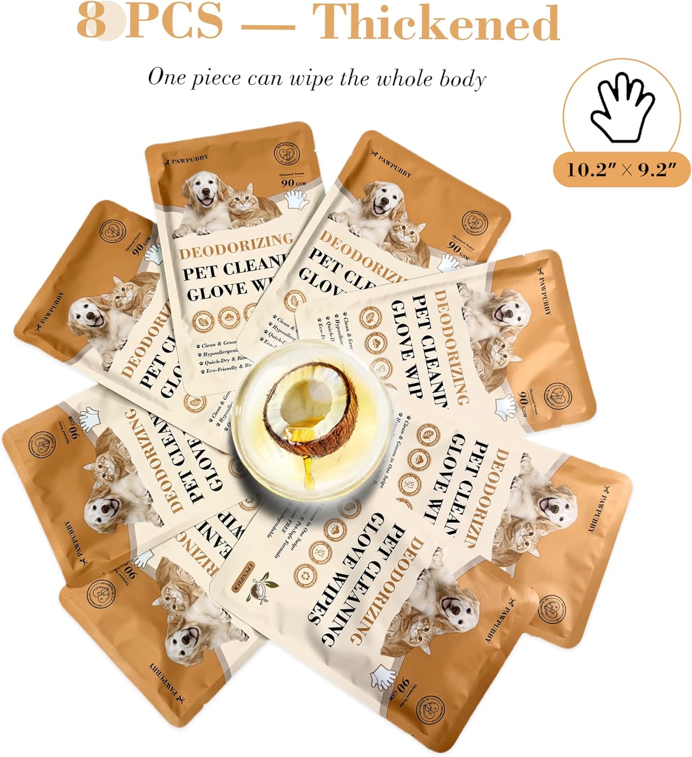 All Furry Pets 2-in-1 Clean & Groom:Designed for dogs, cats, rabbits, guinea pigs, and all fluffy companions, these glove wipes combine cleaning and grooming in one effortless step. Gently lift dirt, loose fur, and dander without extra tools—perfect for post-walk touch-ups, playtime cleanups, or travel grooming when full bathing isn’t an option. Coconut Oil Nourishment + Hypoallergenic Safety:Enriched with pure coconut oil, the formula moisturizes your pet’s skin and coat, reducing dryness, static, and flyaway fur (a game-changer for long-haired breeds!). Free of artificial additives, parabens, and harsh chemicals, these wipes are hypoallergenic—safe for puppies, kittens, seniors, and pets with sensitive skin for daily use. Gentle Fragrance Formula: Infused with natural chamomile extract, renowned for its soothing properties, this formula helps keep easily startled or scent-sensitive pets relaxed during grooming (no more squirming, struggling, or stress!). Its non-irritating scent avoids strong fragrances that can trigger pet resistance to cleaning—even the pickiest fur babies stay calm. Rinse-Free Convenience + Quick-Dry Efficiency:No water or rinsing needed—just wipe and go! The fast-drying formula ensures your pet’s coat dries rapidly, preventing dampness, matting, or potential skin issues. A time-saving solution for busy pet parents, indoor touch-ups, or situations where full bathing is impractical. Natural Deodorizing + Environmentally Conscious Design:Leveraging the gentle cleansing power of coconut oil and chamomile, these wipes neutralize pet odors (cat litter smells, doggy dampness, small pet enclosure scents) at the source—no harsh masking fragrances. Each box includes 8 premium 90 GSM thickened wipes for durable use and better coverage, with environmentally conscious packaging that’s kind to the planet. Compact size fits easily in home storage or travel bags for on-the-go grooming. › See more product details