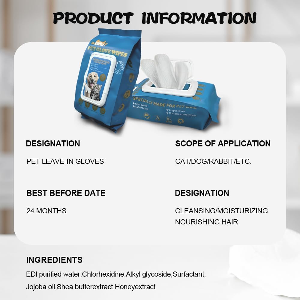 Unique Design:No-Rinse Pet Bath Wipes-Our no-rinse pet bathing wipes transform your pet grooming routine by effortlessly removing dirt, The textured side deeply cleans and grooms pet fur, effectively removing dirt, dander,eye debris and loose hair, while the gentle pearl surface is ideal for sensitive areas.dander, and odors while soothing and nourishing the skin. Perfect for daily use, outdoor activities, travel, and special circumstances, these wipes keep your pet clean, fresh-smelling, and with a shiny coat. No rinsing is required, making grooming easier than ever Convenient and practical:Thick, Durable, and Safe Ingredients- Grooming wipes are dense, soft, and tear-resistant. They are enriched with EDI water, gentle glycerin, and aloe vera extract, making them suitable for pets of all ages, including those with sensitive skin. The textured surface provides a soothing massage that helps pets relax and promotes circulation—perfect for anxious or sensitive animals. No added alcohol and dyes, our wipes are safe and designed to provide a gentle yet effective cleaning experience Glove-Style Pet Wipes: WBLITUF Glove Wipes offer superior control and flexibility compared to regular pet wipes. The glove design allows easy cleaning and provides your pet with a comfortable massage, spa-like experience. For thoroughly cleaning sensitive areas, these wipes make grooming sessions more enjoyable for you and your pet Sealed Packaging Design: To use, tear off the seal, remove the glove wipe, and gently clean your pet. After use, close the lid to keep the remaining wipes moist and fresh. This sealed packaging design enhances the overall user experience by ensuring the wipes remain effective and ready anytime Why choose us? WBLITUF is committed to providing the highest quality pet cleaning products. Our glove wipes are safe, gentle, and incredibly convenient, ensuring your pet stays clean and healthy whether at home or on the go. 10 minutes of wiping makes these ideal waterless bath wipes for dogs, saving time and reducing stress for pets and owners.Our products have passed pet safety Quality and reputation:MSDS tests, so you can use them with confidence. If you have any questions, please contact our customer service, and we will resolve them promptly › See more product details