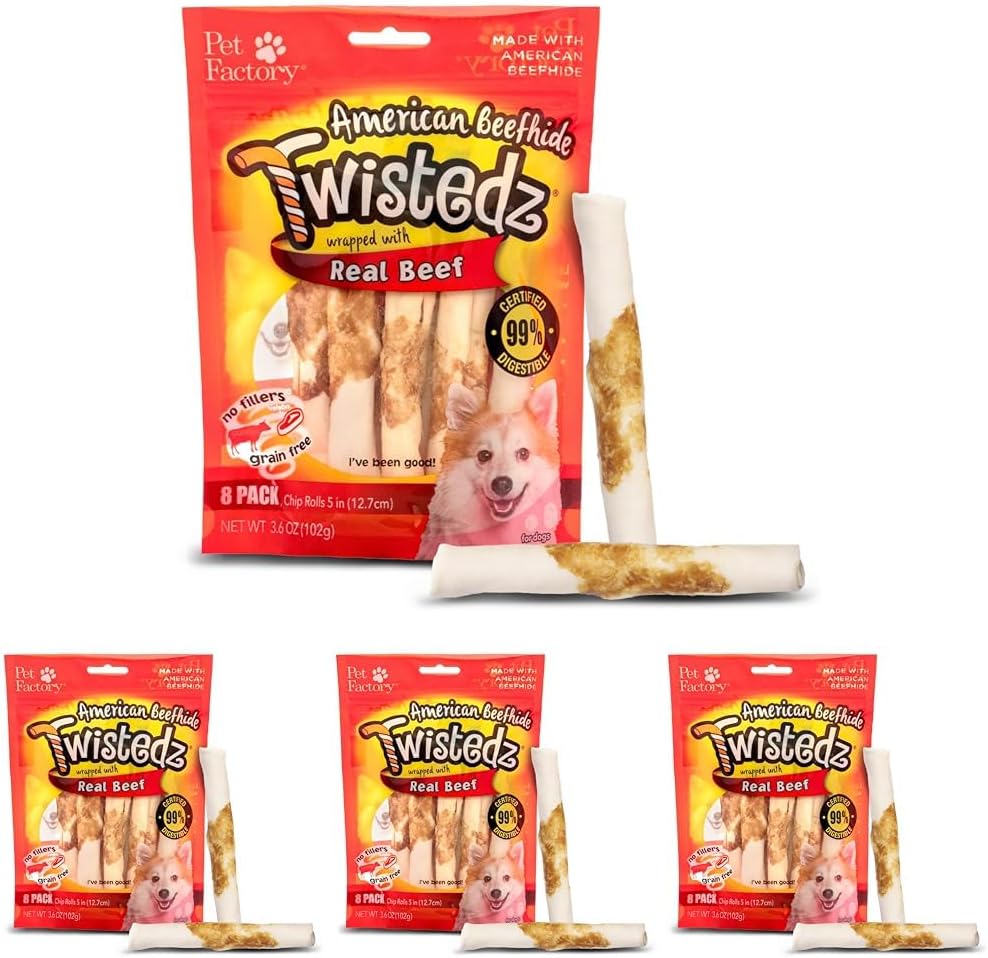 About this item The information below is per-pack only FLAVORFUL COMBINATION: Real meat is wrapped around American beefhide chews to create a flavorful and mouthwateringly delicious treat that dogs will find hard to resist; made with all-natural ingredients for your peace of mind AMERICAN BEEFHIDE: Our beefhide chip rolls are made from thick, 100% natural rawhide sourced from American-raised, corn-fed cattle; they are crafted for maximum quality and safety, and contain no additives or preservatives GREAT FOR CHEWERS: American beefhide is thick and long-lasting to better satisfy your dog's natural desire to chew; they provide a safe, alternative chewing outlet for dogs with aberrant chewing behavior, and are 99% digestible PRODUCT DETAILS: Chip Rolls, Beef Wrap; 5", 8 Count - For small to medium dog breeds, but we highly recommend choosing a dog treat longer than the length of your dog's muzzle RECOMMENDATIONS: Meant for intermittent usage, always supervise consumption and discard any small pieces; please note that flavored coatings are water-soluble, but may stain indoor materials FOOD SAFETY: Pet Factory's Twistedz dog chews are part of the 'Inspected, Tested, and Safe' (ITS) program, which gives customers access to independent testing data using the QR code on the packaging to offer transparency and confidence in our products ABOUT US: Pet Factory has been the nation's premiere manufacturer of USA-sourced beefhide bones and chews; our beefhide products come in a variety of shapes and sizes for every dog, including knotted bones, rolls, and chips in various flavors › See more product details