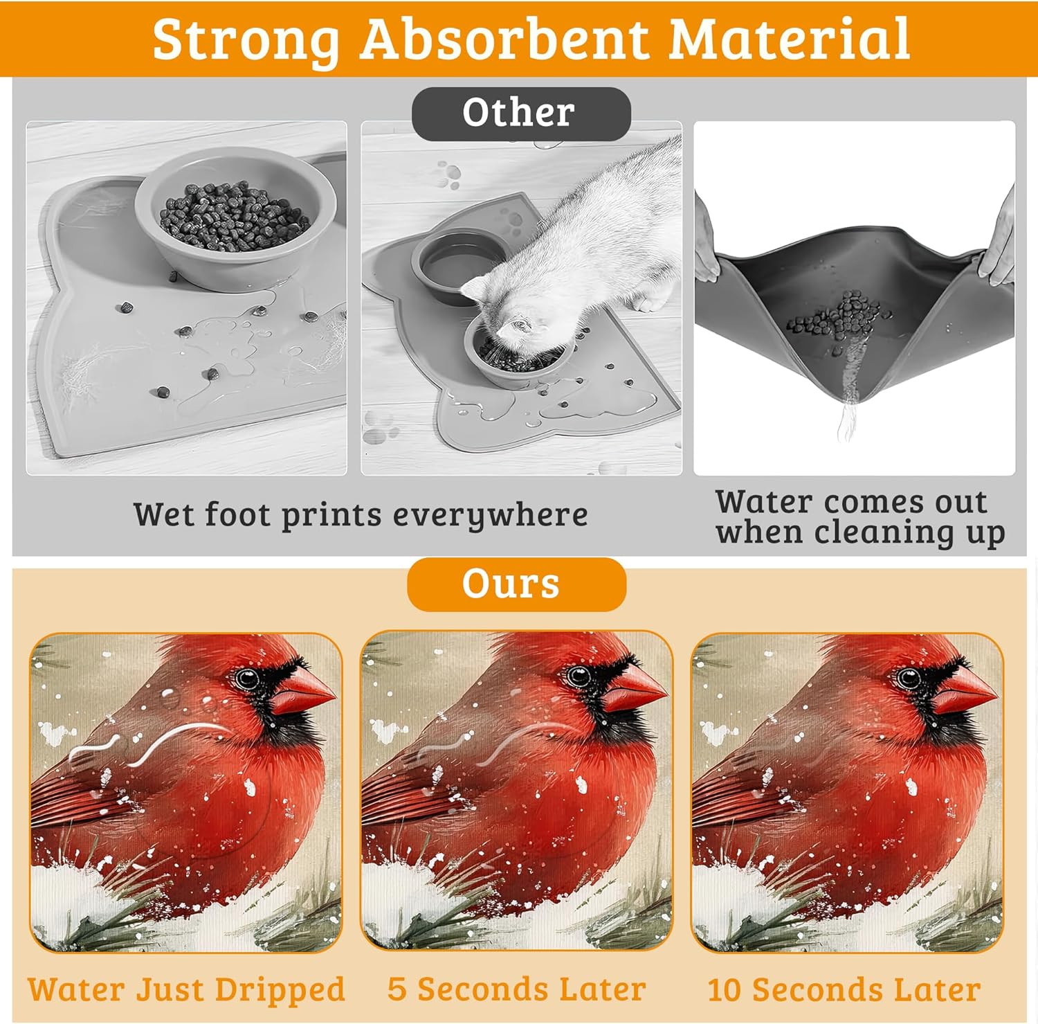 About this item Material:Made from tear resistant and chew resistant fabric that withstands claws and paws without fraying. Sturdy yet soft texture provides comfort while ensuring long term use. The design makes it a reliable pet feeding mat for both cats and dogs. High Absorption:These Pet Mat made with highly absorbent fabric that quickly soaks up spilled water, milk, or food messes to keep the feeding area clean and dry.Helps reduce wet paw prints and sticky residues.A practical dog bowl mat or pet feeding mat for messy eaters and playful drinkers. Non Slip Backing:Anti skid rubber base grips firmly to the floor to prevent sliding or bunching while pets eat or drink. The waterproof layer blocks spills from seeping through, protecting wood, tile, or laminate floors from damage. Ideal as a dog feeding mat or cat food mat in any home. Easy to Clean:Designed with a smooth surface that resists hair, dust, and stains. Simply wipe with a damp cloth for everyday care or rinse under running water for a deeper clean. Washable and quick drying, making this pet food mat a convenient solution for daily use in multi pet households. Multi Purpose:Works perfectly under food bowls, water dispensers, or automatic feeders to prevent spills and messes. Can also be used as a cat litter mat or resting mat. Lightweight and rollable for easy storage or travel, making it a thoughtful and practical gifts for pet owners. › See more product details