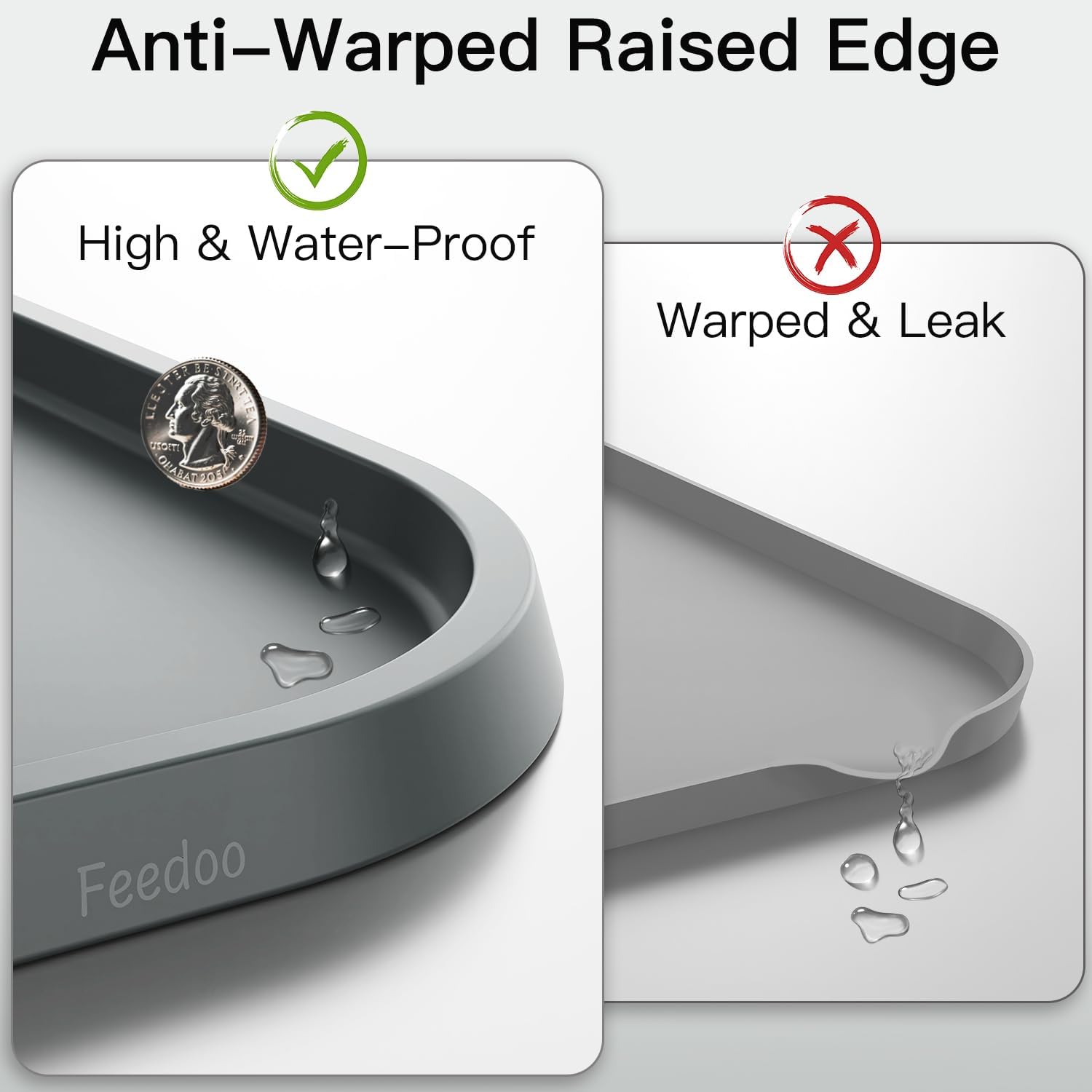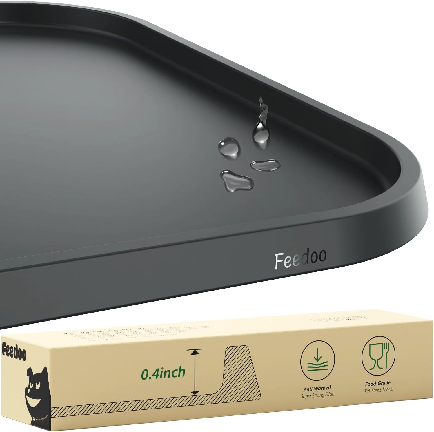 About this item DURABLE & FOOD-GRADE SILICONE MAT: This 18.5 x 11.5 inch mat made from 0.12inch(3mm) thick, food-grade silicone, this BPA-free mat is 100% safe for pets, offering superior durability compared to standard mats. WARPED RESISTANT RAISED EDGE: Features a 0.4inch(10mm) raised, trapezoid edge design that resists warping, ensuring 100% mess-free feeding. The only mat with deformation-resistant edges on the market. WATER-PROOF & FLOOR PROTECTION: Spill-proof design protects floors from food and water splashes out, perfect for use under dog or cat food bowls, water bowls, or cat litter trays. ANTI-SLIP DOT BOTTOM: The mat’s dotted base enhances grip, outperforming standard silicone mats in slip resistance, while allowing airflow to keep the mat and floor dry and clean. EASY CLEAN & DISHWASHER SAFE: Raised edges trap food and water, allowing easy cleanup by lifting and emptying. The smooth, flat surface washes effortlessly with water-just a quick wipe or rinse, and it’s good to go. › See more product details