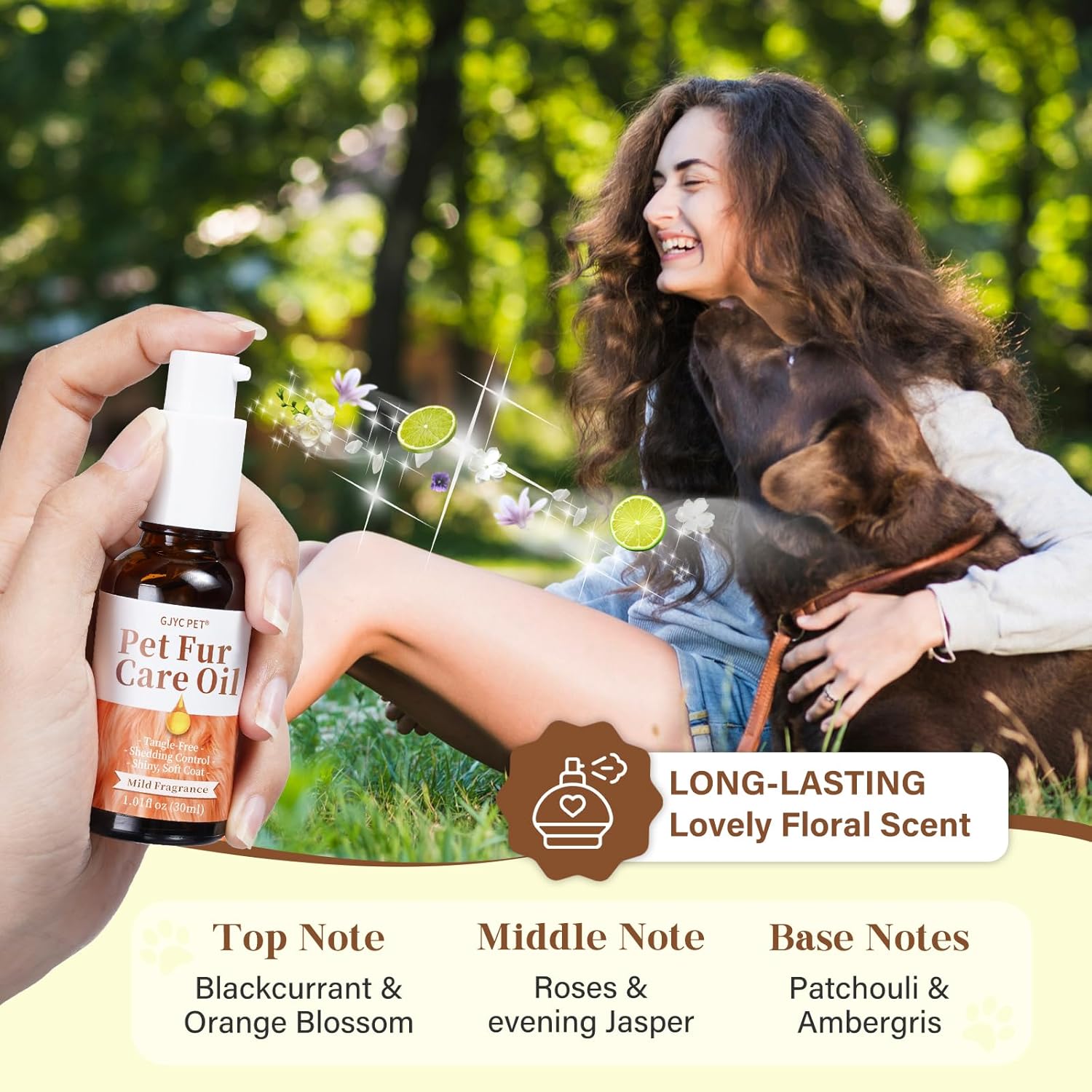 About this item Hydrates and Conditions: Our Pet Fur Care Oil is expertly formulated with Collagen and a blend of premium natural oils like Jojoba Oil and Olive Oil, deeply hydrating and conditioning your pet's fur. This powerful combination strengthens and repairs fur, providing lasting moisture and nourishment; Soft and Shiny Coat: Experience a luxuriously soft and shiny coat with our special blend of Macadamia Oil and Coconut Oil. These ingredients smooth and enhance the natural luster of your pet's coat, making grooming easier and giving your pet a healthy, polished look; Tangle Remover: Eliminate stubborn tangles and knots with our advanced formula, designed to gently detangle and condition the fur. The nourishing oils and conditioners work together to reduce grooming time and make brushing more comfortable for your pet; Floral Fragrance Options: Choose from our strong floral scent for a bold, long-lasting fragrance, or our light floral scent, perfect for a subtle, delicate aroma. Both fragrances are expertly crafted to keep your pet smelling fresh and pleasant without being overpowering; Suitable for All Pets: This versatile grooming oil is suitable for all types of pets, from puppies to dogs and cats, and for all fur types—whether short or long. Maintain a beautiful, healthy coat for any pet with ease; › See more product details