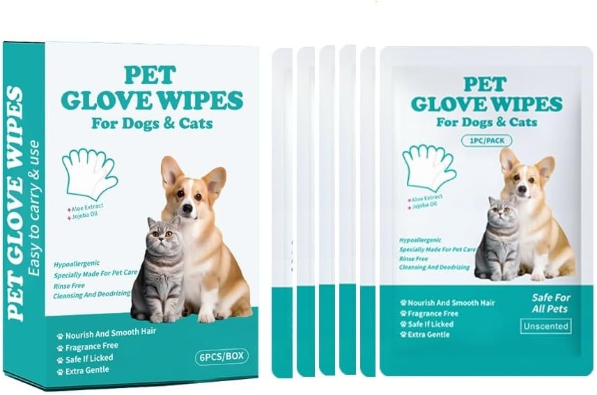 CONVENIENT CLEANING: These Disposable glove wipes allow for easy full-body pet cleaning and grooming with a simple wipe-down motion ODOR CONTROL: Effectively removes unwanted pet odors while cleaning, keeping your furry friend fresh between baths VERSATILE USE: Suitable for all coat types and designed for whole-body cleaning from head to tail, Nourish and smooth hair NO-RINSE FORMULA: Quick and effective cleaning without the need for water or blow drying, perfect for regular pet maintenance COAT CARE: Moisturizing and nourishing formula helps maintain your pet's coat health while cleaning › See more product details