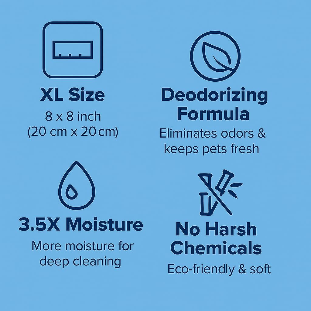 Gentle and Safe for Sensitive Skin: Made with natural bamboo fibers, these wipes are hypoallergenic and alcohol-free, ensuring a soft and soothing clean for pets with sensitive skin. Effective Odor Control: Specially designed to remove unpleasant odors from paws, fur, and other areas, leaving your pet smelling fresh and clean. Extra Thick and Durable: Crafted with a pearl-textured, 50gsm material, these wipes are thick, tear-resistant, and perfect for tackling dirt, grime, and messes. Large Size for Convenient Cleaning: Each wipe measures 8 x 8 inches (200 x 200mm), providing ample coverage for quick and efficient grooming, reducing the need for multiple wipes. Multi-Purpose Use: Ideal for cleaning paws, body, face, and butt. Perfect for daily grooming, post-walk cleanups, or freshening up between baths. Suitable for both dogs and cats. › See more product details