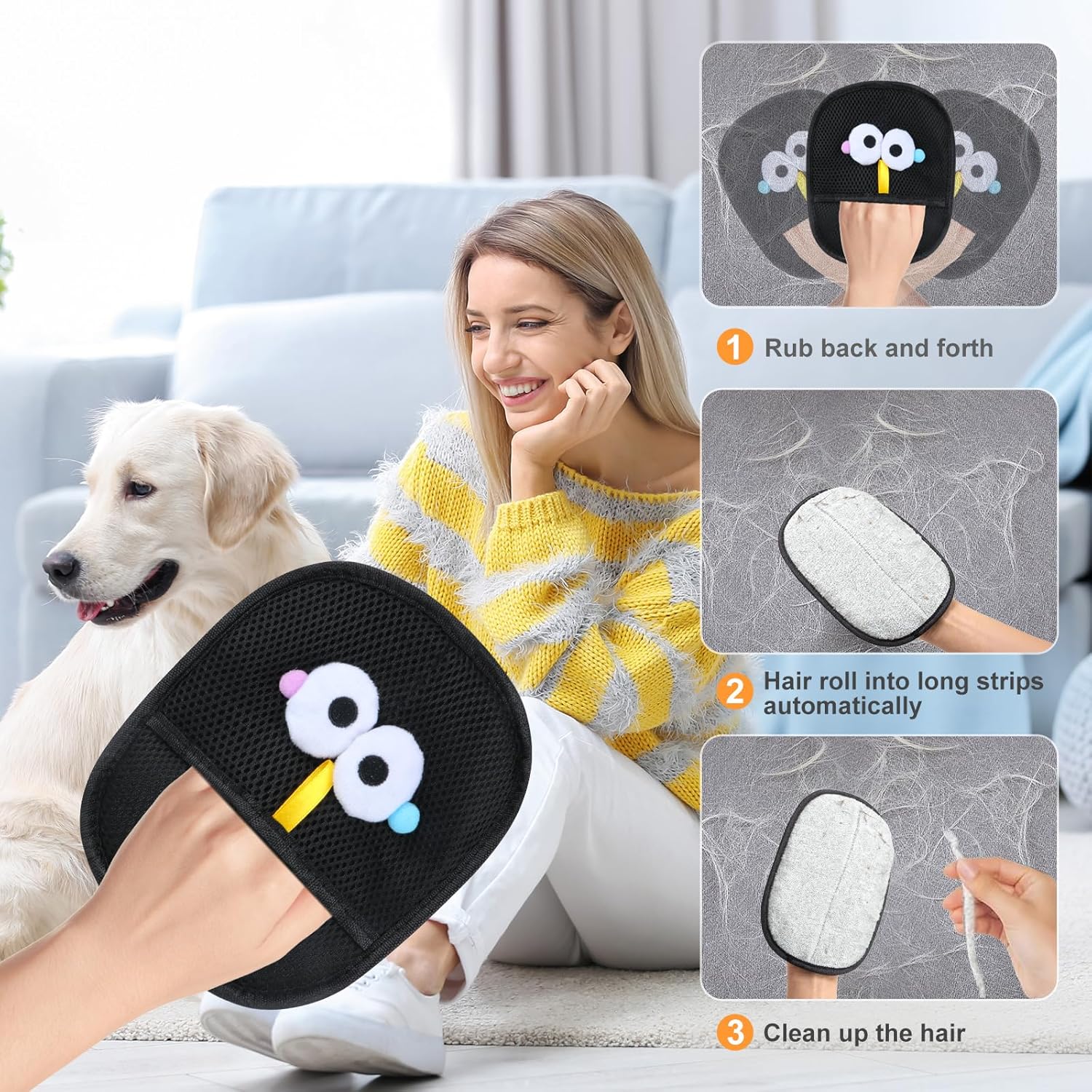 SUPER USEFUL WITH ELECTROSTATIC EFFECT The pet hair removal golve fits well in the hand, the electrostatic material really grabs loose hair effortlessly, and makes the hairs stick right away. It works great not only on my pets but also for cleaning hair off the sofa, clothes, and laundry etc. GAME CHANGER FOR A HOUSE WITH PETS The pet hair golves for for cats and dogs pick up hair easily from my dog, also work great for cleaning the sofa and bed, ckothes, laundry. The material with the lectrostatic effect, makes it really grab loose hair effortlessly. The glove is simple to use, you just wear it like a glove and wipe the area that has hair. The glove picks up almost everything. It is effective in removing the hair. A MUST-HAVE FOR EVERY PET OWNER The upgraded five-finger design makes the pet hair remover glove super easy to groom your cat and dog, reaching every corner, even tricky spots like behind the ears and around the legs. It not only removes your pets’ hair very well, but also works great for cleaning furniture, clothes etc. MASSAGE-STYLE HAIR REMOVAL The pet grooming glove makes grooming become a comfortable and relaxing experience for your pet, like a massage, you can effortlessly remove the tangles, minor knots, and loose undercoat. USER-FRIENDLY DESIGN The big wide palm area of cat & dog grooming gloves for shedding helps with getting a full brushing and makes it easier to remove the collected hair, well designed. Plastic nibs don’t appear as though they would break, very durable and light weight. WET AND DAY USE This pet grooming glove effectively removes stray and undercoat hair from cats and dogs. It can also be used as a bathing glove for a deeper cleaning of your pet. SATISFATORY CUSTOMER SERVICE Providing excellent customer service is our main priority, if any issues of the pet hair removal glove and cat & dog grooming gloves, please feel free to contact us, we will provide you a satisfactory solution within 24 hours. › See more product details