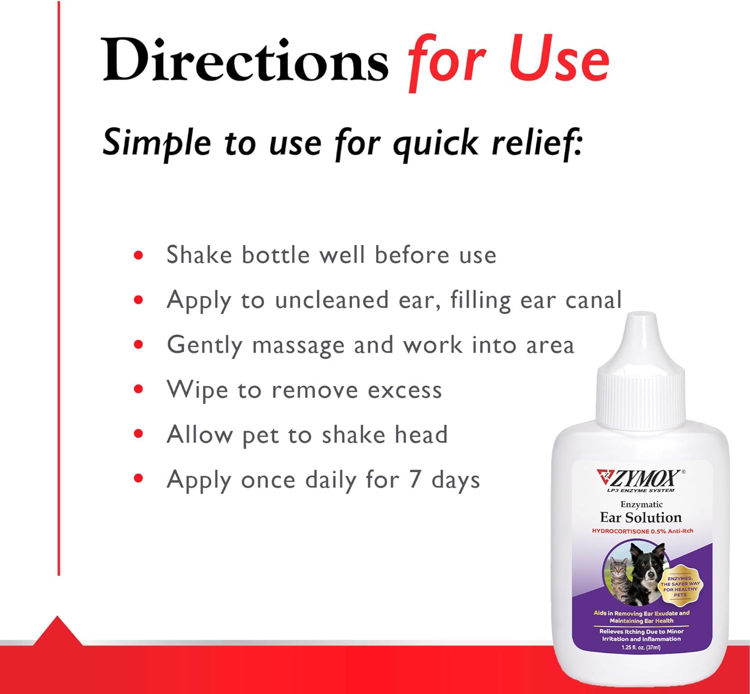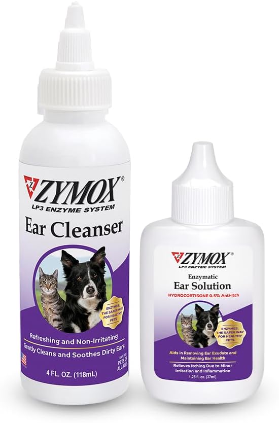 Ear Solution and Ear Cleanser Bundle; the perfect duo to help flush and clean dirty, itchy, irritated and inflamed ears ears and help maintain healthy ears Ear Solution is formulated for cats and dogs to manage problematic ears; ZYMOX's patented formula is safe and gentle and is a natural alternative to traditional therapy Cat and Dog Ear Cleaner – quickly and effectively clean non-infected ears in pets of all ages Instantly starts working to clean pet's ears and rid of build up and debris to help reduce the possibility of irritation Made in the USA for over 25 years; Our Products are Animal Cruelty Free and are never tested on animals › See more product details