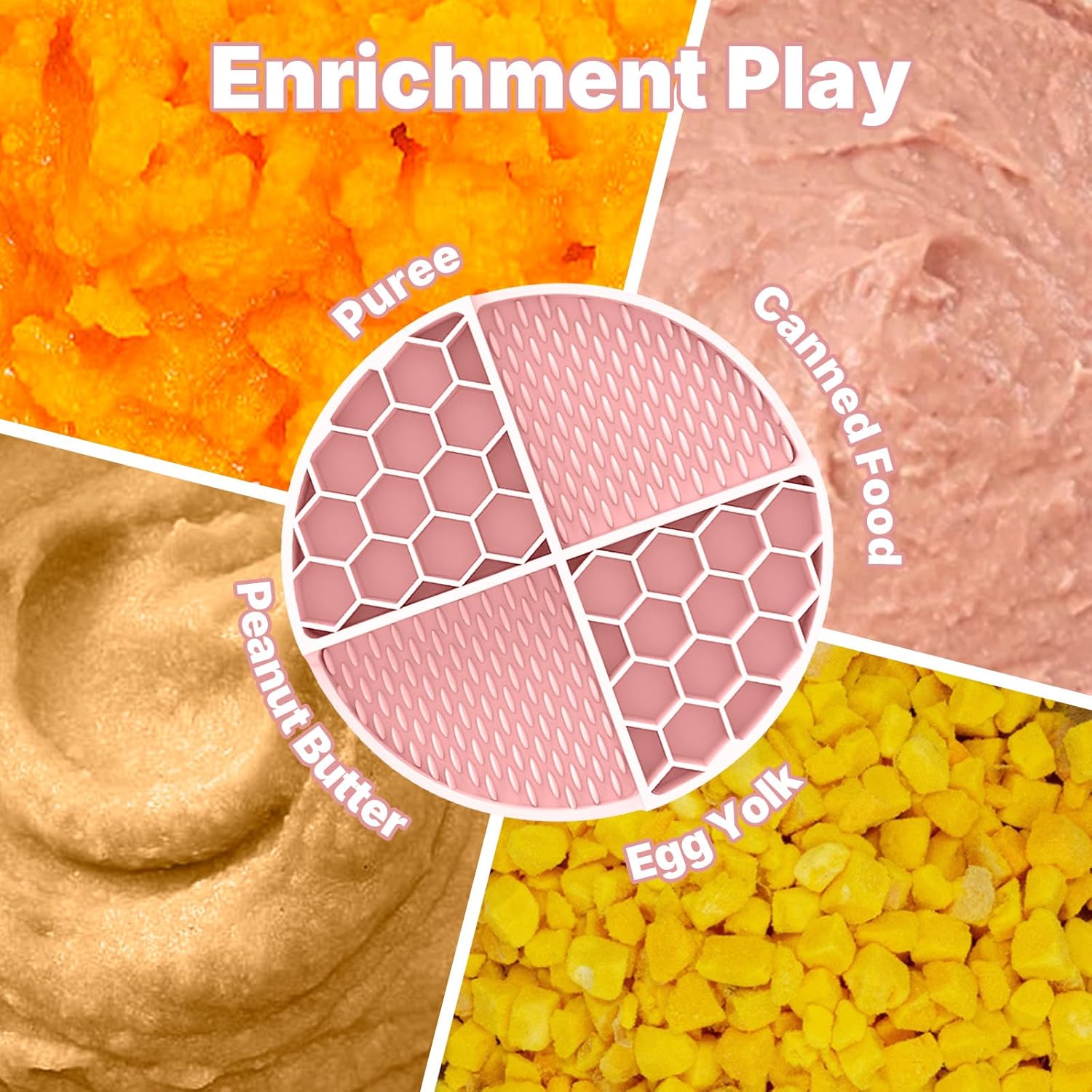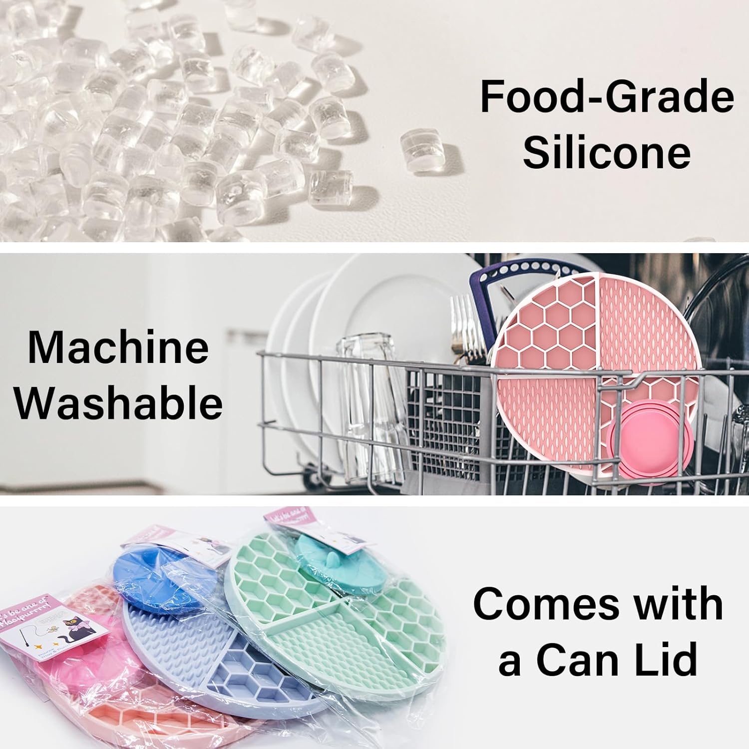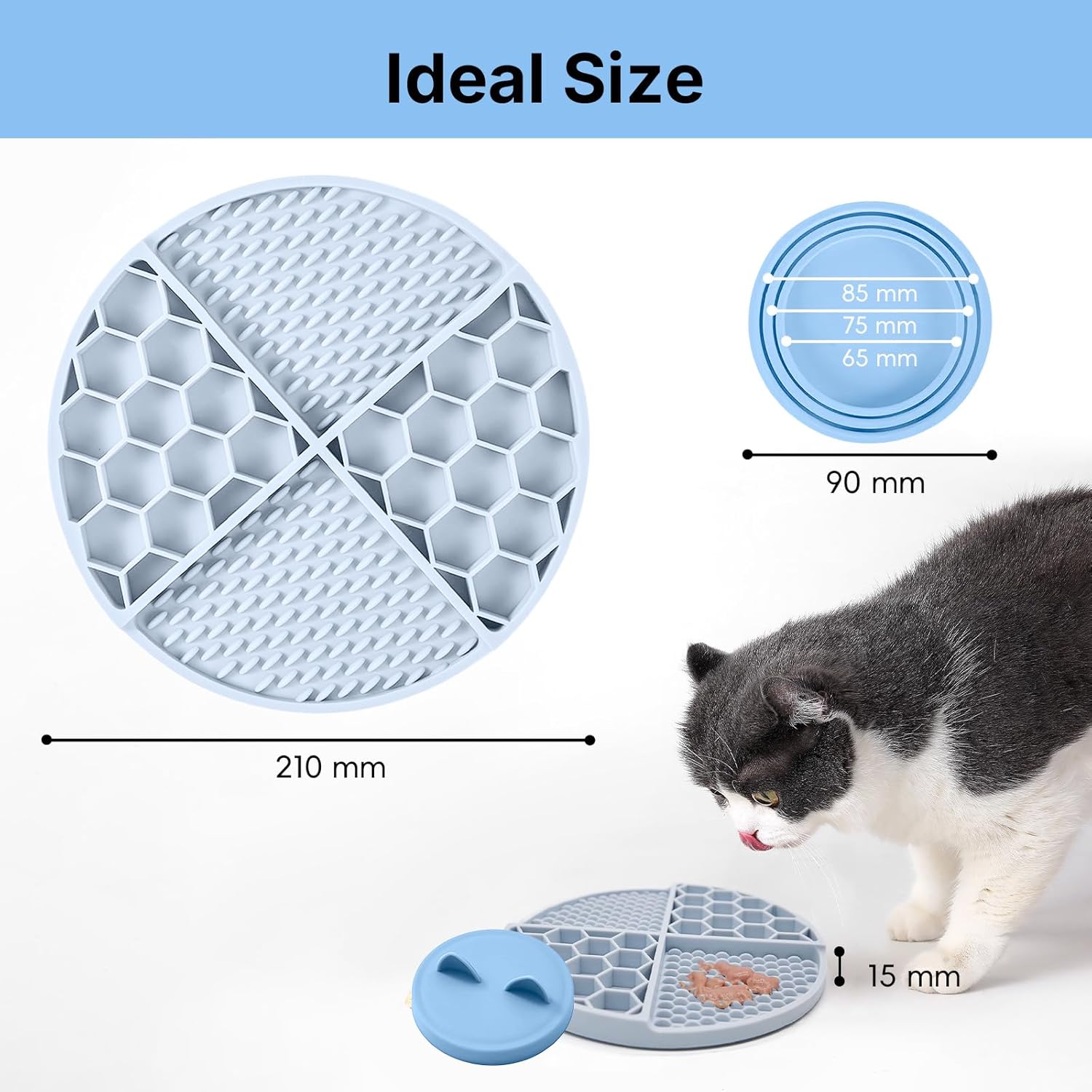 About this item Slow Down Eating: You can slow down/control your dog's eating time to help alleviate digestive problems caused by eating too quickly. Due to the textured surface, our licking pad could effectively reduce the speed of dog’s eating, thereby improving digestibility. Keep dogs entertained by giving them their favourite healthy spreadable treats from dog peanut butter to raw dog food. Anxiety Relieve & Boredom Buster: This all-in-one set includes a 21CM honeycomb licking mat, a suction cup base, and a matching can lid. The mat’s textured surface extends meal time by trapping puree, peanut butter, or canned food, while the lid preserves leftovers—ideal for stress-relief and interactive feeding. 70 Non-Slip Suction Cups: The back of the dog slow feeder is equipped with high-strength suction cups, the suction force is stronger and it is not easy to fall off. Our feeder pad can be firmly fixed on any smooth surface, such as tile, metal, glass bathtubs, marble, refrigerator doors, that hold it your dog firmly in place while it licks. With our slow feeder mat, puppy eating is no longer a mess. Easy to Clean:Designed with busy pet owners in mind, the set ensures quick upkeep: all components—mat, lid, and suction base—are top-rack dishwasher-safe, while the non-stick food-grade silicone repels residue, allowing easy rinsing with warm water. It is dishwasher and refrigerator safe, our slow feeder can be folded and deformed without tiny gaps, easy to clean every corner. Vibrant Pet-Friendly Colors with Can Cover: Available in Mint Green, Sky Blue, and Peach Pink, each set includes a color-coordinated can lid that fits most pet food cans. The airtight seal preserves pet food freshness, while the playful hues add a decorative touch to any pet space. › See more product details