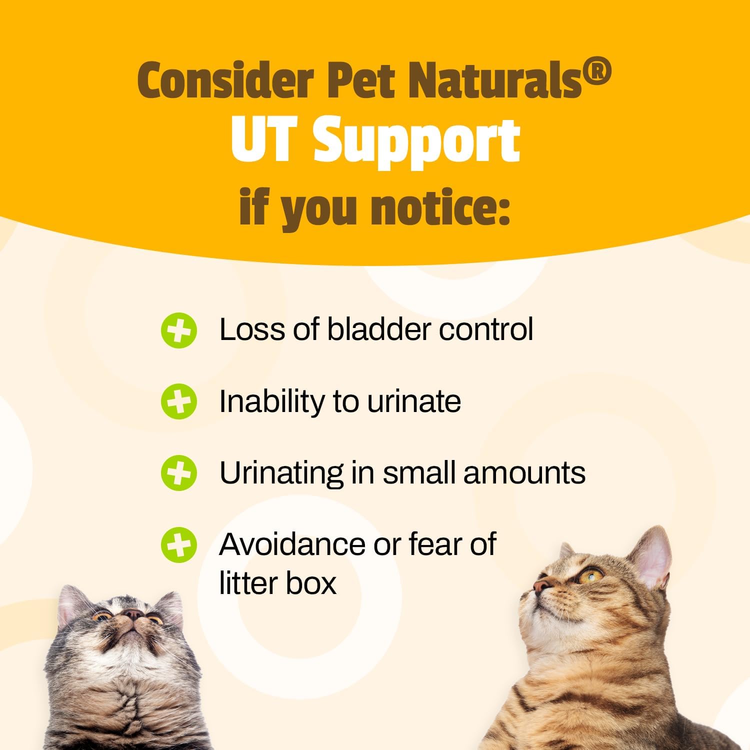 Urinary Tract health and crystal formation are common concerns for cat owners. UT Support from Pet Natural's is a daily supplement that contains 4 active ingredients that support proper urinary tract function and normalize troublesome PH issues that can lead to crystal formation and UT infections. Our formula includes cranberry for PH balance, D-Mannose which supports waste elimination, Bromelain to preserve the lining of the UT tract and N-Acetyl glucosamine which is essential to the mucosal lining of the urinary tract system. Our UT Support formula is a chicken liver flavored soft chew that even the most finicky cats will love.