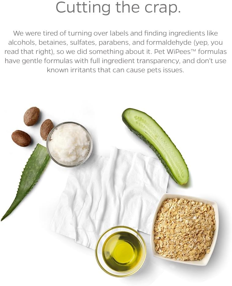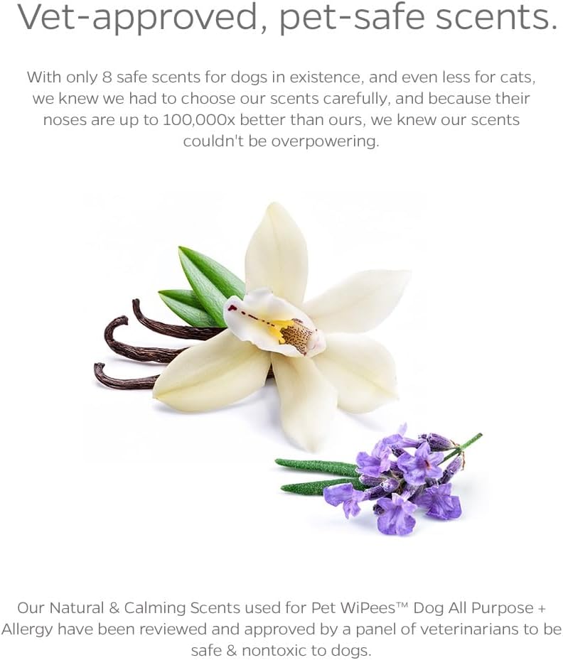 TARGETED, BIO-BASED INGREDIENTS: Our pups' most common allergens are environmental. More than just soap and water, Pet WiPees Dog All Purpose + Allergy are dog wipes formulated with targeted ingredients that can help prevent against irritants and other common skin issues. Soothing & moisturizing ingredients like aloe, cucumber, and antihistamines like sunflower seed oil work together to help relieve itchy, irritated skin, reduce reaction to allergens, and keep your furbaby's skin protected. SUPPLEMENTS FOR THEIR SKIN: Just like your own skin, your furbaby's skin is their first line of defense against harmful foreign substances, irritants, and debris that could lead to internal illness and irritation. These pet wipes for dogs include ingredients that allow the skin to absorb functional ingredients, and use probiotics and enzymes to lock them in to gain the most benefit and help heal any current skin issues, and prevent future ones, from the outside in. NO HARMFUL CHEMICALS: We were tired of turning over pet wipes ingredients lists and finding drying alcohols, formaldehyde-releasing preservatives, and irritating betaines, so we decided to be the change we wanted to see for our furbabies. Each ingredient in Pet WiPees Dog All Purpose + Allergy was researched to be safe for dogs, are LickSafe to help not irritate sensitive tummies from normal grooming habits, making these dog wipes gentle enough for everyday use. VET-APPROVED, PET-SAFE SCENTS: When there are only 8 scents in the world that are safe for dogs, and even less for cats, we knew we had to have the safest scents that furbabies wouldn't turn their nose up at. Our scents have been reviewed and approved by a panel of veterinarians to be safe, nontoxic, and non-irritating for both dogs and cats. Just enough in our formulas to smell good, the scents in these paw wipes for dogs are not enough to upset sensitive sniffers. INTENTIONAL PACKAGING: With a wiggly furbaby in one hand, the last thing you need is hard to open dog wet wipes that clump when you pull them out. Pet WiPees innovative LeaveIt packaging prevents clumping, so you only pull one, not three dog paw wipes. These pet grooming wipes feature a resealable lid, preventing the large dog wipes from drying out, and making for easy one-handed use. For when your furbaby didn't have 'getting a bath' on their agenda, Pet WiPees help make it easy. › See more product details