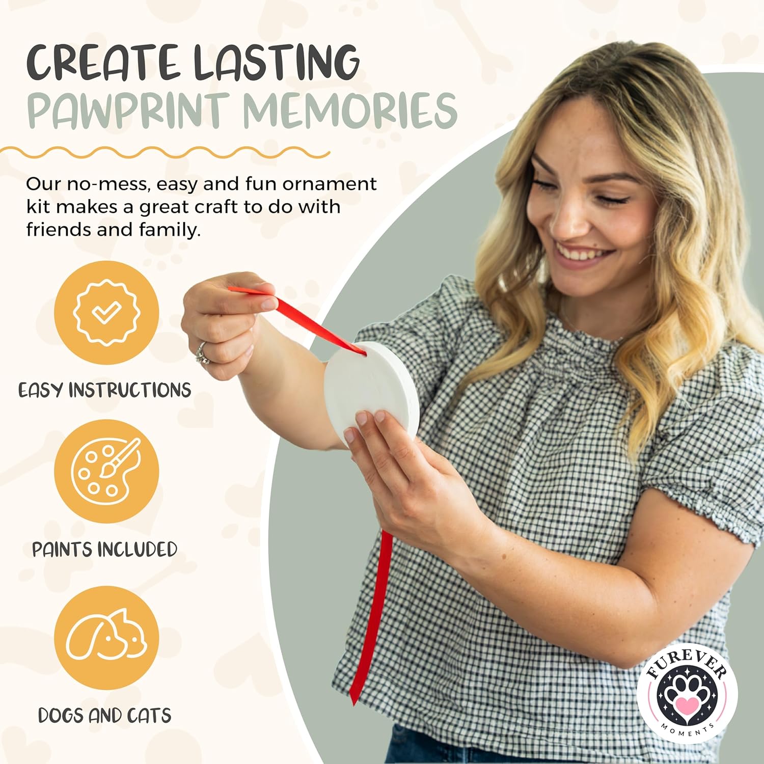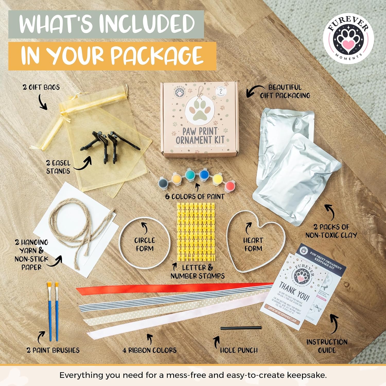 - Included Components: 2 Ornament Molds, 6 Acrylic Paints, Name & Date Stamps, Pet-Safe Clay (enough for 2 ornaments), Ribbons, 2 Display Stands