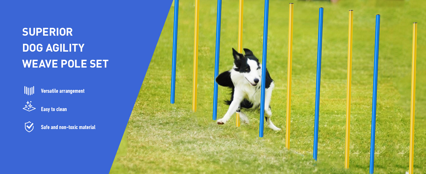 About this item 12Pcs Weave Poles: A perfect beginner agility equipment for dogs includes 12pcs weaving poles(length 45.6in) with steel spike(length 6.1in) for inserting into the ground. You can change the distance between the poles to change the difficulty level Lightweight and Easy Setup: Dog agility weave poles is easy to install and take down without tools in just minutes! It comes with a carrying bags that make it easy to transport and store Premium and Durable: The outdoor agility slalom are made of ABS material, safe and Lightweight, durable that can be used for park, backyard Fun Exercise: Running, jumping, playing, and most of exercising for maximum dog agility. After training again and again, not only the agility of pets is increased, but you will build trust with your pets and keep them healthy Great Gift for Dogs: The dog agility course is perfect outdoor game. It not just a speed training equipment but also Ideal to exercises your pet mentally and physically › See more product details