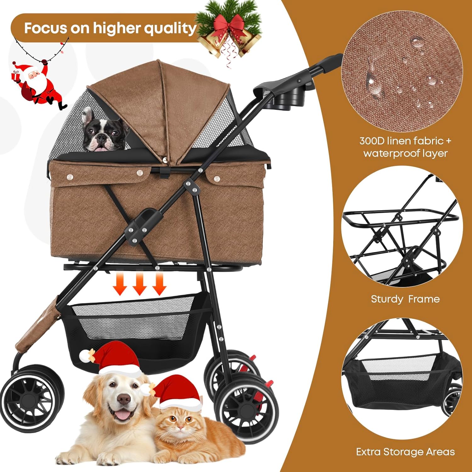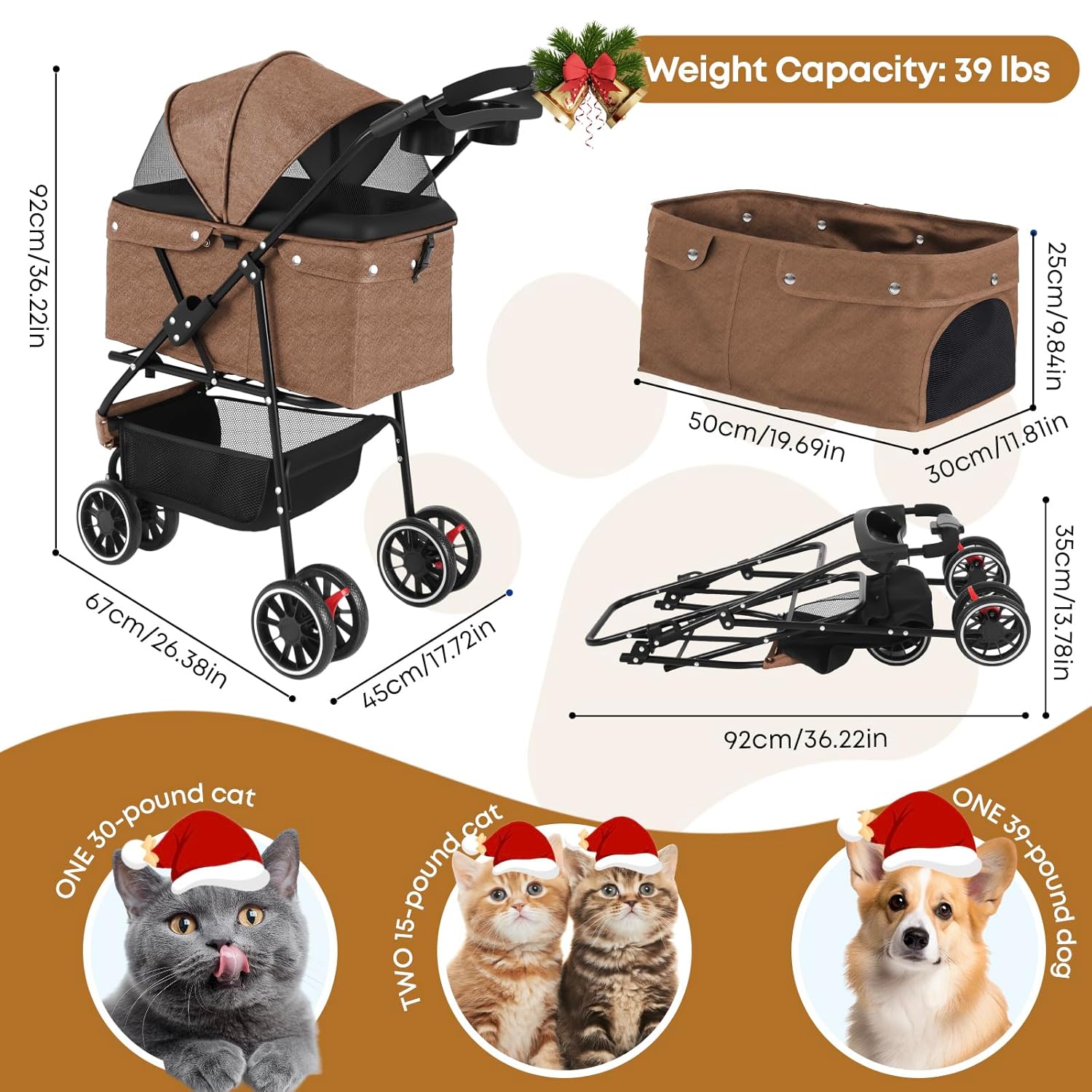 About this item 300D linen fabric The pet stroller has built-in dual safety straps secure pets, resists accidents from pets. Crafted with 300D Oxford fabric and a waterproof coating around the carriage, let you travel worry free. Dog stroller for small/medium dogs 10-15-20 lbs, up to 39 lbs The dog stroller has full-coverage breathable mesh allows dogs to enjoy scenic views while staying cool. Dual front/back openings let your pet face forward or interact with you, and the zipperless entry ensures hassle-free access The cat stroller equipped with 360° swivel front wheels for smooth maneuverability and dual rear brakes for instant stopping power. It glide seamlessly on sidewalks, grass, or uneven terrain, ensuring a safe ride This pet stroller for small dogs/cats measures 26.38 "L x 36.22 "H x 17.22 "W and folds instantly. Folds down to 36"x14" for effortless storage in car trunks or backseats. The lightweight frame and quick-fold design make it ideal for road trips, vet visits, or daily walks The dog wagon has 2 cup holders, and a spacious storage basket undercarriage for pet gear. Wheels attach in seconds. Unbox and adventure with your furry friend › See more product details