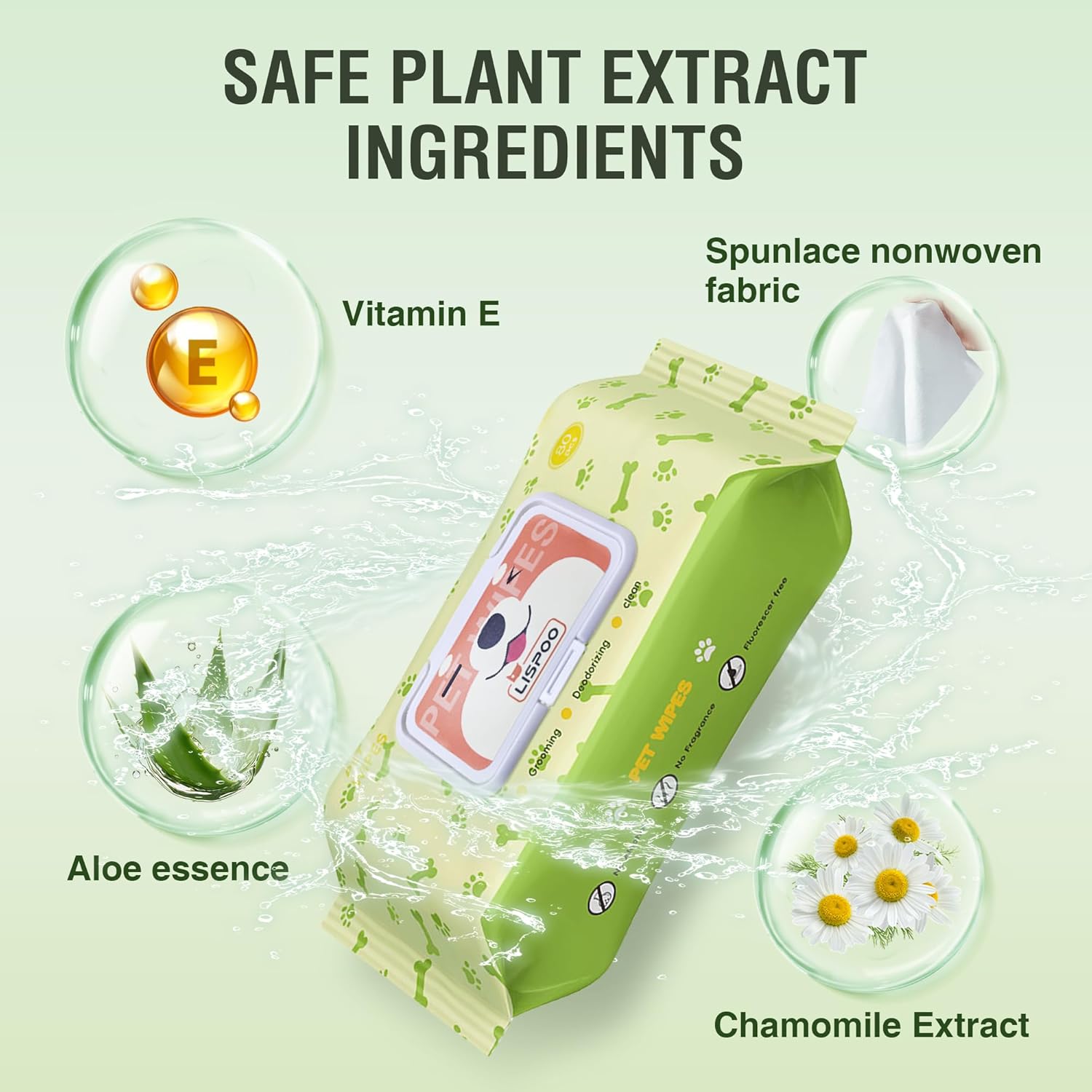About this item Widely applicable, universal for all dogs and cats: LISPOO pet wipes are crafted with a mild, plant-based formula to safely remove dirt, odors, and stains from your pets paws and butt. Hypoallergenic and non-irritating dog wipes and cat wipes are suitable for daily dog and cat grooming care or cleaning after going out. Natural ingredients protect the delicate skin of pets. Ultra-Soft & Durable Texture for Stress-Free Grooming: Our wet wipes are made of 30% adhesive and 70% polyester non-woven fabric, which is thick, tear resistant, and not easy to flake. They are perfect for combing your pet's hair, and can effortlessly handle dirt, dander and residue while keeping your pet fresh. Alcohol-Free, Fragrance-Free & Safe for Sensitive Pets: Our pet cleaning wipes are alcohol free, artificial fragrance free, and fluorescent. They are formulated with a pH balanced formula and are low in sensitivity and gentle. Even with frequent use, it will not cause allergies or dryness, designed specifically for pets with sensitive Convenient and Portable for On-the-Go Use LISPOO pet wipes are conveniently packaged and easy to carry in your bag or car. The outer bag size is 6.7*3.9*2.3 inches, each bag contains 80 wipes, each wipe size is 8*6 inches ,we also have 4 pack / box (320 pcs).Whether you're at home or outdoors, puppy wipes are always ready for quick cleanups. Main ingredients: Vitamin E,Aloe essence Chamomile Extract are safe for all pets. They are the first choice for parents who value the health of their pets. › See more product details