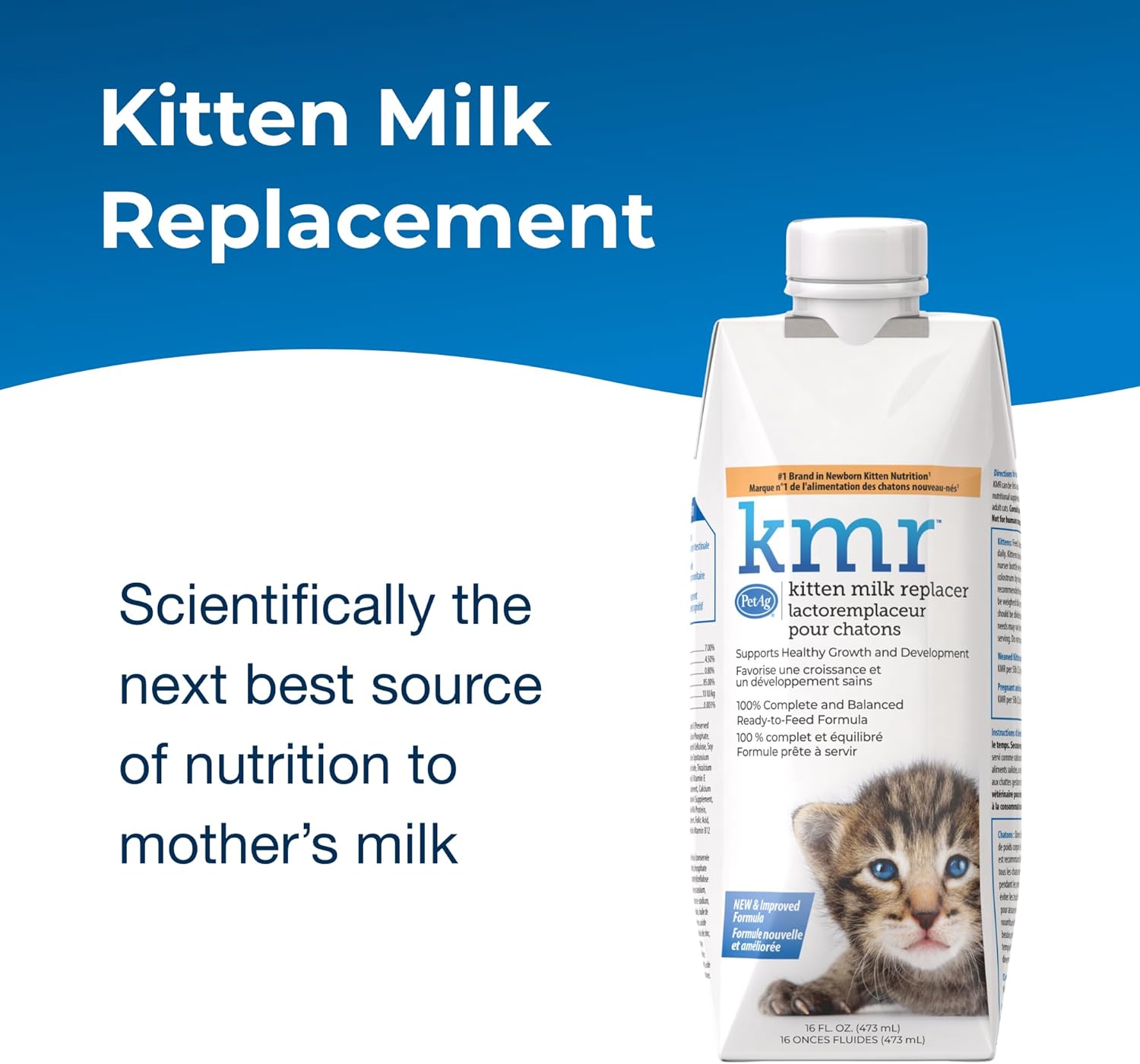 About this item KITTEN MILK REPLACEMENT - When mom can’t nourish them, KMR can. Scientifically the next best to mother’s milk, KMR provides all the nutritional elements necessary for kittens. COMPLETE, BALANCED NUTRITION - Our formula is closest to mother's milk in protein, fat, and carbohydrates. We’ve also added vitamins, minerals, and trace nutrients for healthy immunity and digestion. EASY TO DIGEST - KMR is highly palatable and formulated with a special fiber blend for easy digestion and improved gut health. NEW TETRA PAK PACKAGING - Portable, resealable, and made with responsibly sourced paper. Lowers CO₂ emissions vs. plastic & uses an aseptic process for safety and freshness. Good for your pet and the planet. EASY-TO-USE FORMULA - Shake gently before use. Warm KMR to room or body temperature before serving. Opened container must be refrigerated and discarded after 72 hours. ABOUT US - PetAg is a trusted leader in pet wellness, with science-backed formulas in our milk replacers, health supplements, and grooming products helping pet owners to proactively enhance the lives of their pets, for more healthy years together. › See more product details