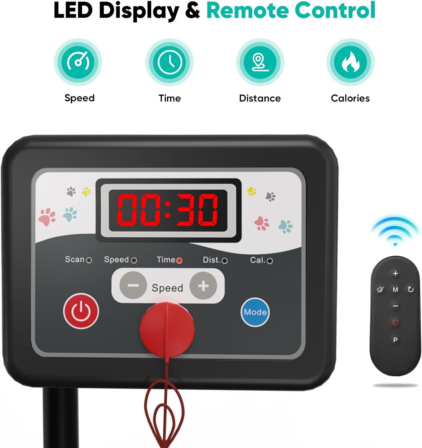 About this item 360°Display & Smart Remote- Train from Any Angle. Track your dog’s workout from any angle with the 360°rotatable screen displaying speed, time, distance & calories. Adjust via the remote or control panel so your dog can exercise safely while you work or relax nearby Enhanced Safety You Can Trust- Enclosed side panels prevent slipping, the magnetic safety key stops the treadmill instantly if detached, and a top leash ring adds extra stability - giving you peace of mind even when your dog exercises alone Quiet & Calm for Indoor Us- No Stress, No Distractions. Built with dogs’ sensitive hearing in mind, the low-noise motor (<55 dB) keeps pets calm and focused. The remote’s mute mode silences beeps, making it ideal for apartments or home offices where peace matters Compact & Easy to Store- Perfect for Small Spaces. Built-in wheels and a foldable frame make it easy to move and store. Slide it under a bed or sofa when not in use, or remove the side panels to save even more space - perfect for apartments and small homes 2-in-1 Treadmill for Pets & Owners- Powered by a 1.5 HP motor, this treadmill supports a total load of 265 lbs (120 kg). The 36.2″ ×14.2″ belt fits small to medium dogs like Corgis, Beagles, and Border Collies. Remove the panels to transform it into a compact walking treadmill for you — keeping both you and your pet active indoors Warranty- Before purchasing, please confirm your dog weighs ≤ 80 lbs (recommended) and fits comfortably on the belt (36.2″x 14.2″). Our pet treadmill has a 12-month warranty. If any problems during use, please contact us and we'll reply within 24 hours › See more product details