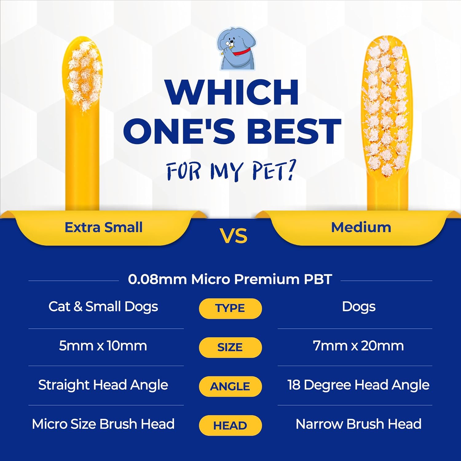 About this item GENTLE DENTAL CARE: Features functional micro brush hair that is five times softer than regular toothbrushes. Promotes gentle cleaning specifically designed for the delicate teeth and gums of your pets COMFORTABLE & SAFE: Our toothbrush boasts an 8g ergonomic, hexagon-shaped handle for a secure grip. Its 5mm micro size fits dogs', cats', and kittens 3mm teeth width, ensuring effective, discomfort-free cleaning. EXTRA SOFT BRISTLE: Crafted from microfiber PBT material, our 0.08mm diameter bristles expertly remove tartar and bad breath from your pet's teeth, ensuring a comfortable brushing experience without irritating their gums. DEVELOPED FOR OPTIMAL RESULTS: Our toothbrush incorporates the best curve and angle to effectively remove tartar and plaque deep inside your pet's teeth. This expert design ensures thorough cleaning and promotes better oral health for your cat, kitten and dog. PREMIUM QUALITY: Meticulously crafted for durability and effectiveness, our toothbrush upholds your pet's dental hygiene without compromise. Minimal bristle-plastic gap prevents collisions with your cats, kittens, and dog's gums › See more product details
