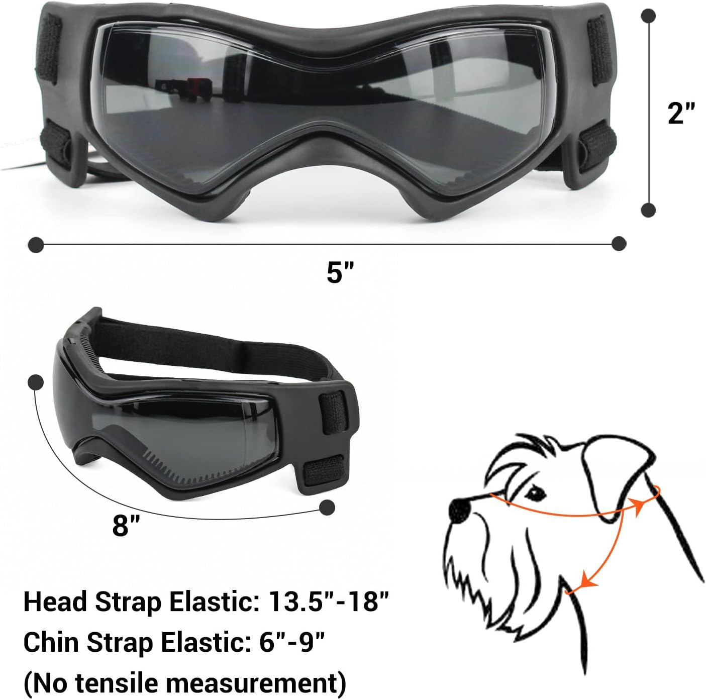 About this item Dog goggles medium breed: Suggest for medium breed dog like Corgi, Shiba Inu, Medium Poodle, Boston Terrier. These dog sunglasses will be very useful for car rides, hiking in windy conditions, and other outdoor activities. Curved design lens: In order to make the dog glasses suitable for dog’s face and nose, these sunglasses are specially designed with curved lenses, cover dog’s eye area well. Soft frame with vents: The dog sunglasses frame made of soft rubber with comb shape vents, make goggles fits comfortably, also there won't be water mist on the lens. Cool eye protection: Lens are made of high-quality polycarbonate, protect your pets’ eyes from snow, UV, wind and dust, perfect for dogs who like to hang their head out car window. Size M: Length 5”, width 2”, adjustable length of head strap: 13.5”-18”, adjustable length of chin strap: 6”-9”. Please measure your dog before purchasing. › See more product details