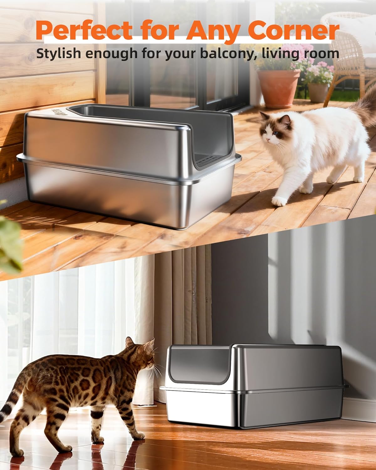 About this item 【Leak-Proof Stainless Steel Cat Litter Box】 Adopts special lid & base connection structure (no fragile clips) – stable, non-damageable, and easy to install in one click. It completely blocks cat urine from seeping through seams, solving the trouble of urine leakage that plagues plastic litter boxes, keeping your home clean 【Easy-to-Clean Steel Cat Litter Box】 Made of pure stainless steel, the surface is non-sticky – cat waste slides off easily with a simple wipe. It won’t absorb urine odors or emit unpleasant plastic smells, creating a fresh and hygienic environment for your cats to use comfortably 【High Sided Cat Litter Box for Anti-Scatter】 Features tall surrounding walls to prevent litter from splashing out when cats dig. The included entry step has holes to trap litter on paws – effectively reducing litter tracking around the house and saving your time on floor cleaning 【Tool-Free Easy Installation】Thanks to the special connection structure (no complicated buckles), this steel cat litter box assembles in seconds—no tools required! The connection stays stable even with active cats jumping in/out, avoiding loose parts or damage 【Large Stainless Steel Litter Box for Multi-Cat】 With a spacious size of 24"L x 18"W x 12"H, it provides ample space for cats to enter, turn around, and dig freely. Perfect for single-cat families, multi-cat households, and large breeds like Maine Coons or Ragdolls 【Durable Pure Stainless Steel Build】Made of high-quality pure stainless steel, this metal cat litter box resists scratches, rust, and wear—far more durable than flimsy plastic litter boxes. It won’t crack or deform even with long-term daily use, saving you money on frequent replacements › See more product details