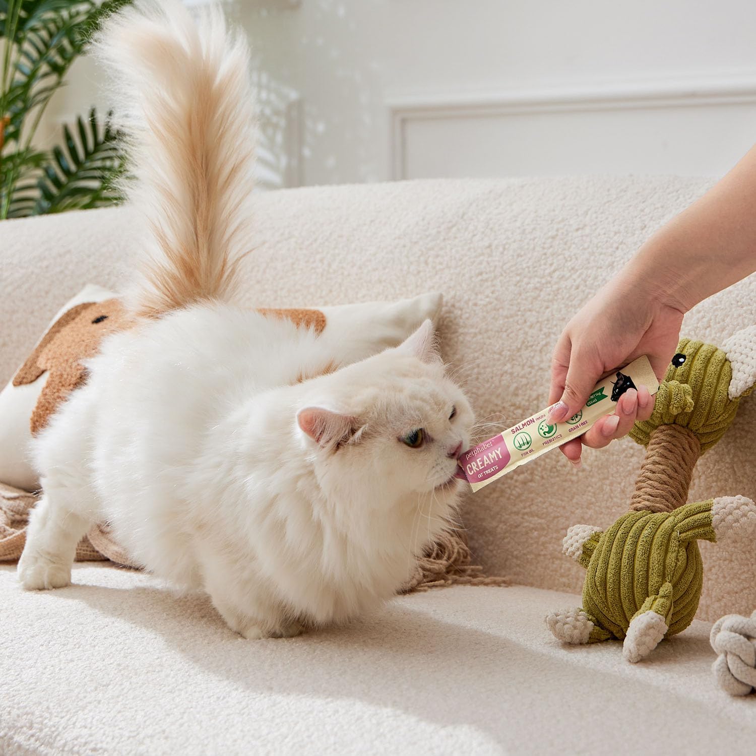 About this item Salmon Flavor & Natural Ingredients: Petphabet cat treats for indoor cats are salmon-flavored. Our wet cat treats are made with high-quality salmon sourced from the deep sea to ensure delicious taste and rich nutrition. Your cat will love our tasty cat food toppers. Healthy & High Nutrients: Crafted with natural ingredients, these lickable cat treats are 100% grain-free and free from artificial preservatives, flavors, and colors. Every bite of our cat snacks is rich in vitamin E, Omega-3, and other nutrients, which can enhance cats' physical fitness. Hydration Support & Low-Calorie: Rich in moisture (approximately 84%), our cat squeeze treats help supplement your cat's daily water intake. With a low-calorie profile (6.5 kcal per tube), they let you reward your cat guilt-free without worrying about weight gain, supporting a healthy body condition long-term. Creamy Paste & Versatile Feeding: Boasting a smooth, lickable meat paste texture, the puree kitten treats are soft and creamy, easy for cats of all ages (kittens to seniors) to enjoy. There are multiple feeding options: squeeze into a bowl, use as a food topper, or feed by hand—enhancing interaction, strengthening your bond with your feline friend. Portable & Convenient: This variety pack puree cat treat comes with 20 tubes, 5 tubes per flavor (0.5oz/14g each). Designed with a long, slim strip package, our squeezable cat treats are highly portable—perfect for taking on walks, trips, or outings to reward your cat on the go. The package of our cat tube treats is easy to open, letting you quickly serve treats anytime and anywhere. › See more product details