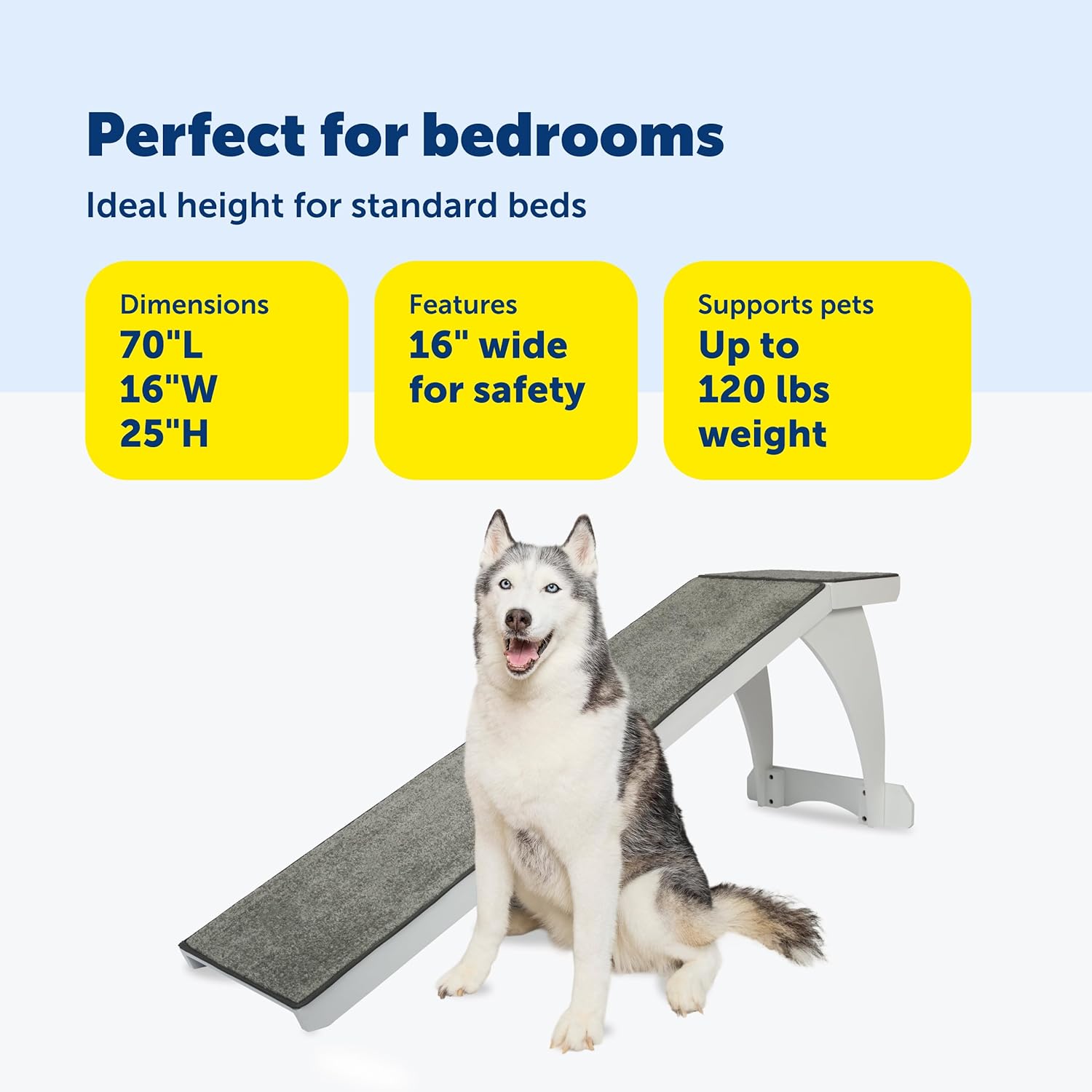 Give your pet the boost they need to enjoy bedtime snuggles with the PetSafe CozyUp Bed Ramp. Whether you have a small dog, an aging pup, or a cat that prefers not to jump, this supportive incline ramp is designed to make it easy for pets to get on and off the bed without putting stress on their joints or back. With a gentle slope and sturdy structure, the CozyUp Bed Ramp helps prevent injury while encouraging independence for pets of all sizes. Crafted from high-quality, furniture-grade wood and finished in your choice of cherry or white, this bed ramp blends in beautifully with your home décor. The 70-inch long ramp features a heavy-duty, carpeted surface to provide a high-traction path for your pet, helping paws stay firmly in place during the climb. Whether your pet is recovering from surgery, managing arthritis, or simply a bit too small to hop up comfortably, this ramp offers a smooth, safe solution. The CozyUp Bed Ramp is independently safety tested and rated to support pets up to 120 pounds. It arrives fully assembled, so there’s no setup required—just place it next to your bed and it’s ready to use. Its sleek, compact footprint is perfect for bedrooms and can be easily repositioned when needed. From morning cuddles to bedtime routines, this ramp gives your pet the freedom to join you without asking for a lift. Since 1988, PetSafe has been driven by a simple belief: safe, healthy pets lead to happier lives for pets and their families. For over 25 years, we've been dedicated to enhancing the lives of pets and the people who love them, treating every pet as a cherished family member and delivering life-changing innovations designed to enrich every moment. With U.S. roots and a global reach, our vet- and trainer-recommended products are built for every pet and backed by exceptional customer support. From backyards to dog parks, we're on a mission to create fields of joy for happy, healthy, and safe pets.