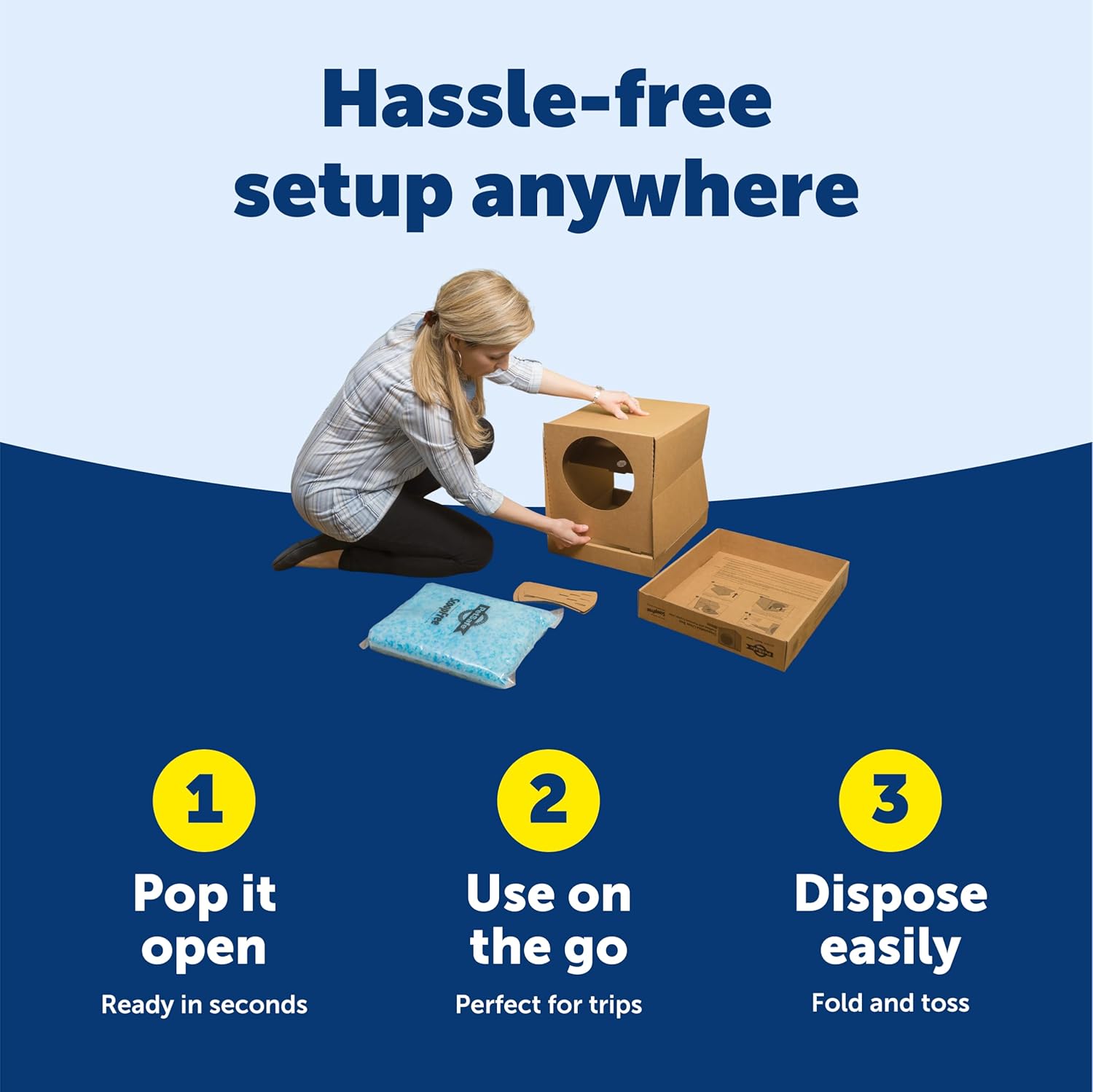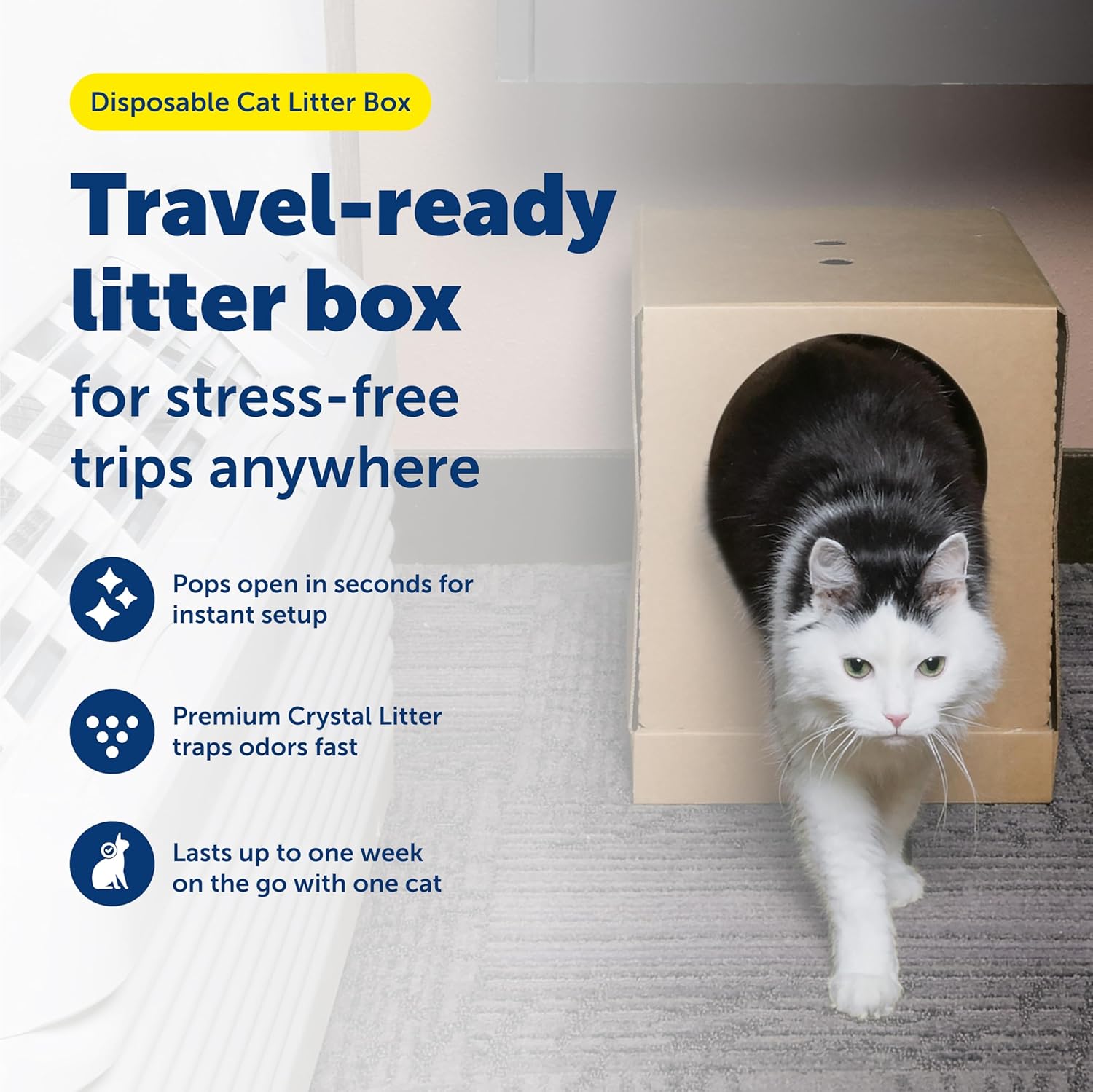 The PetSafe Disposable Litter Box is a travel-friendly, hassle-free solution for maintaining hygienic cat care wherever life takes you. Crafted from strong, sturdy cardboard with a protective coating, this collapsible litter box offers reliable leak protection and a compact design thats perfect for road trips or traveling adventures. The lightweight, easy-carry build and instant covered setup make it ideal for quick departures and potty breaks on-the-go. The elevated entrance provides comfortable access for cats of all ages, while the cat-friendly texture encourages use and supports flexible litter trapping. This disposable litter box delivers superior odor control (when used with Crystal Cat Litter) and leak protection for a cleaner, no mess box experience. Secure front tabs keep the box stable, and the lid doubles as a base for extra floor protection. When its time to clean up, simply fold it down for easy storage or toss it out. Eight disposable scoops are included for added convenience. Whether you're heading out for a weekend getaway or managing a multi-cat household, the PetSafe Disposable Litter Box offers a portable solution to your litter box needs with easy-to-clean convenience and dependable performance. Since 1988, PetSafe has been driven by a simple belief: safe, healthy pets lead to happier lives for pets and their families. For over 25 years, we've been dedicated to enhancing the lives of pets and the people who love them, treating every pet as a cherished family member and delivering life-changing innovations designed to enrich every moment. With U.S. roots and a global reach, our vet- and trainer-recommended products are built for every pet and backed by exceptional customer support. From backyards to dog parks, we're on a mission to create fields of joy for happy, healthy, and safe pets.